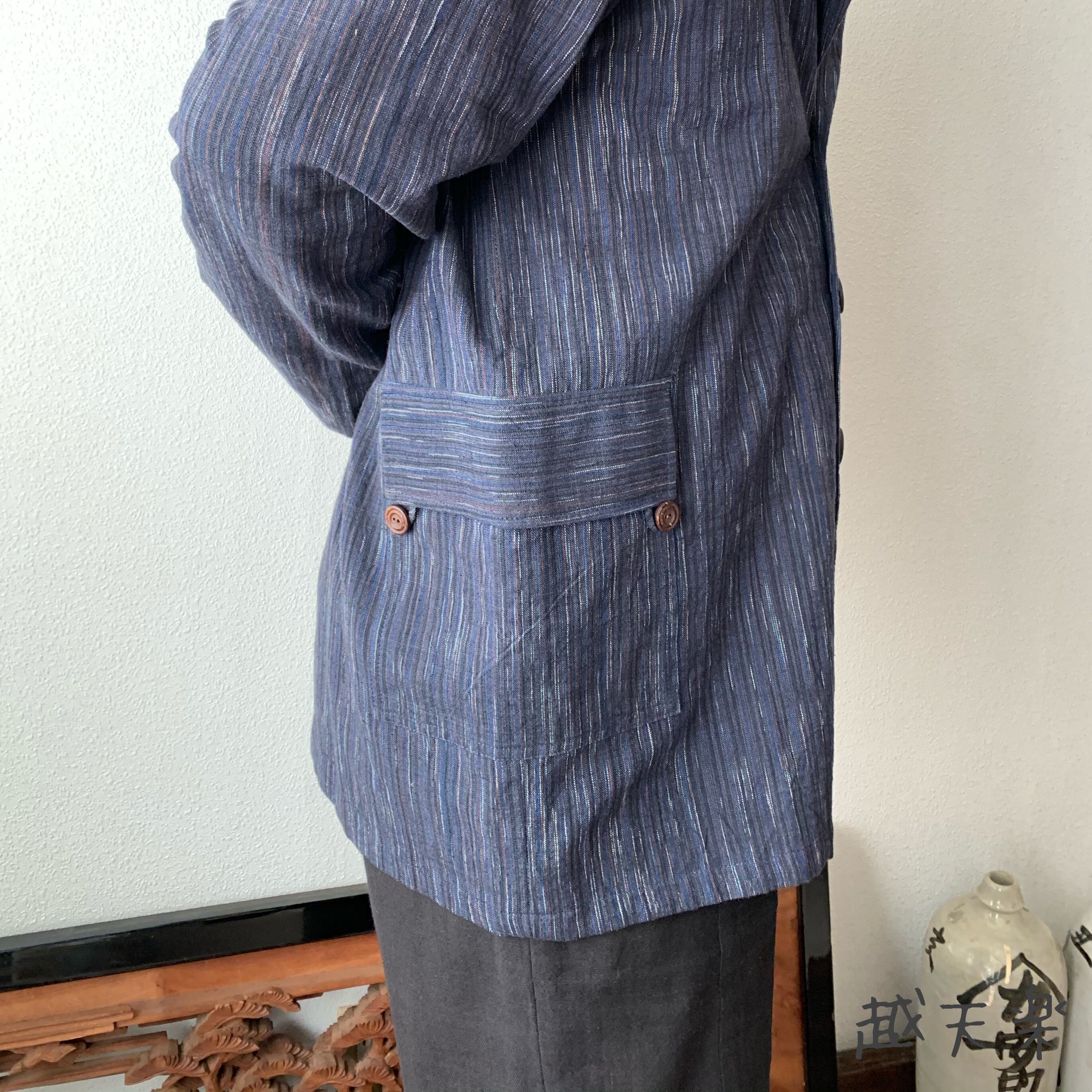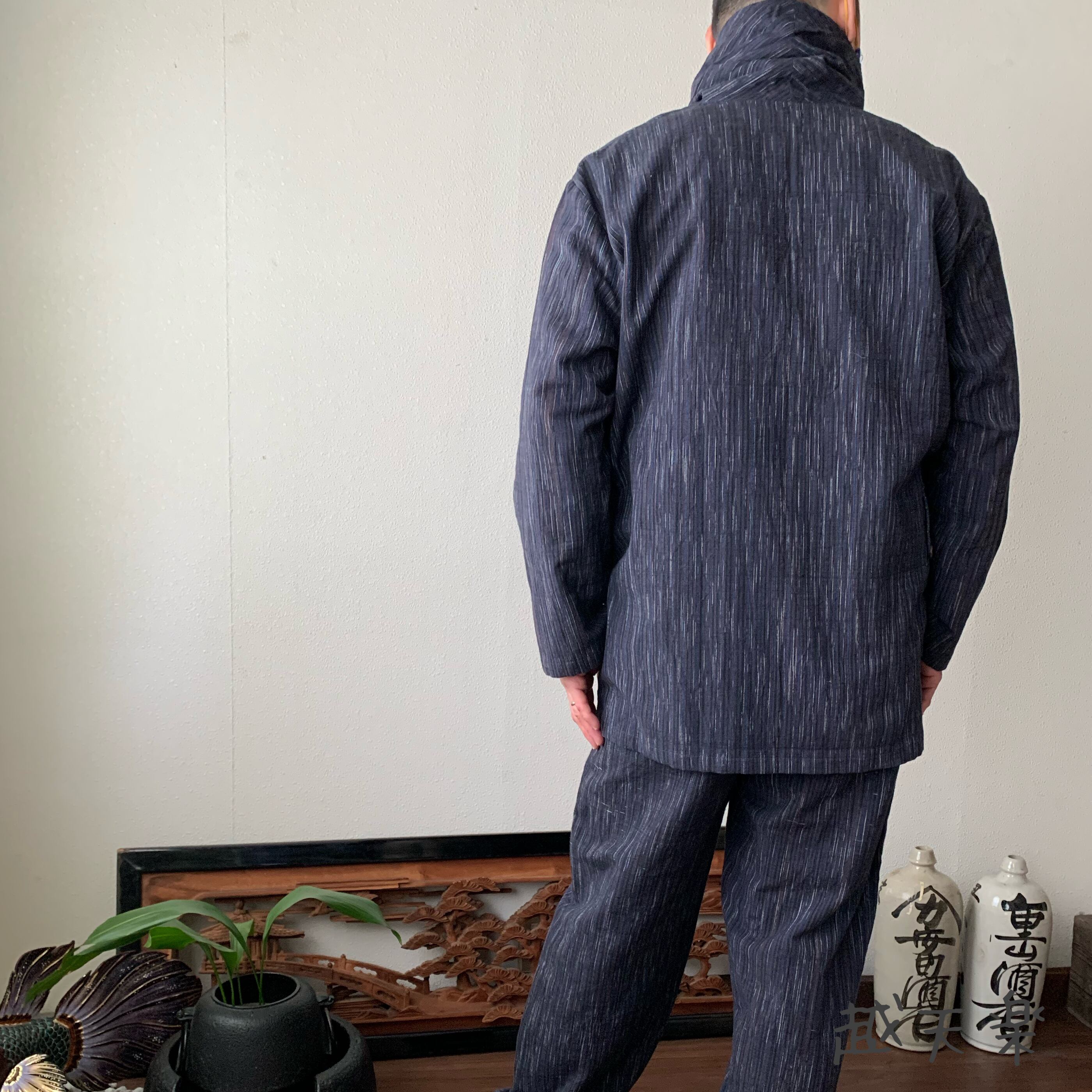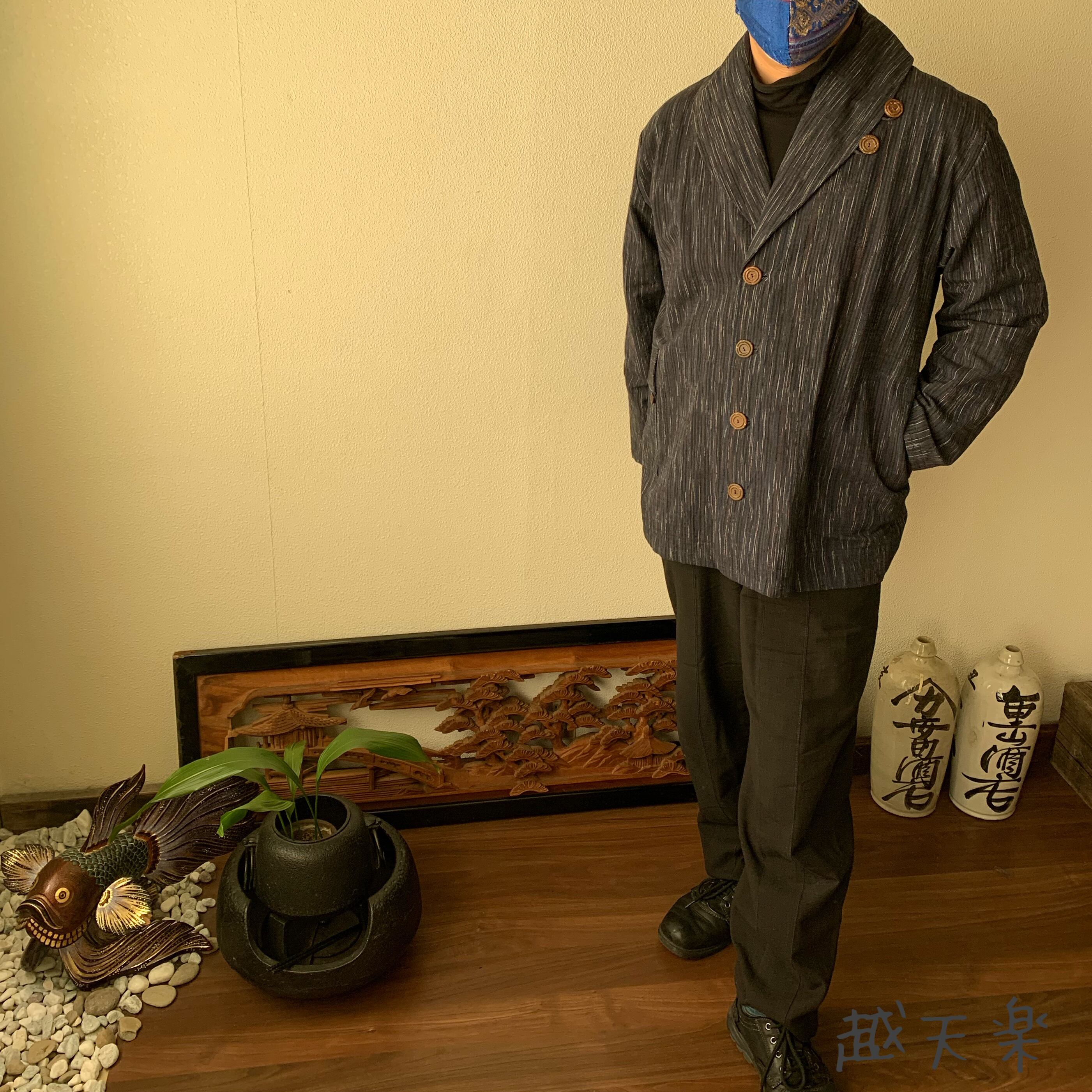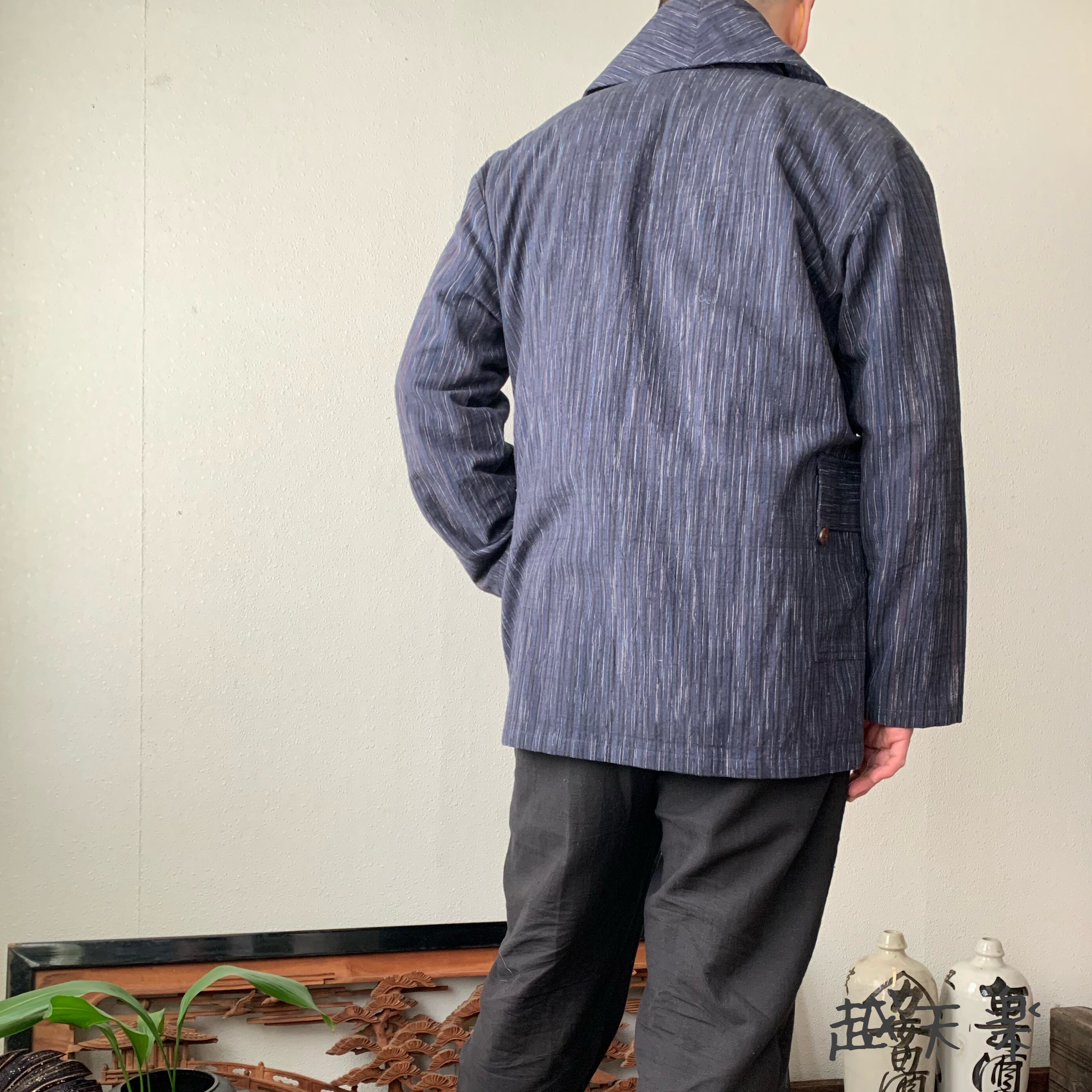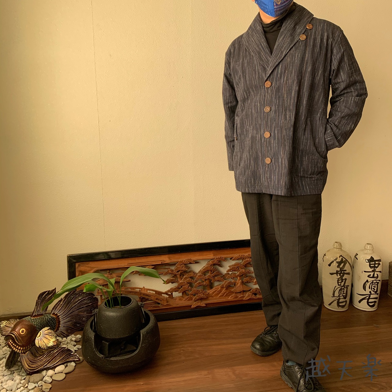 イタリアンカラー手織り綿長袖メンズブラウス 襟についたダブルボタン、サイドポケットでよりかっこよく 紺絣
