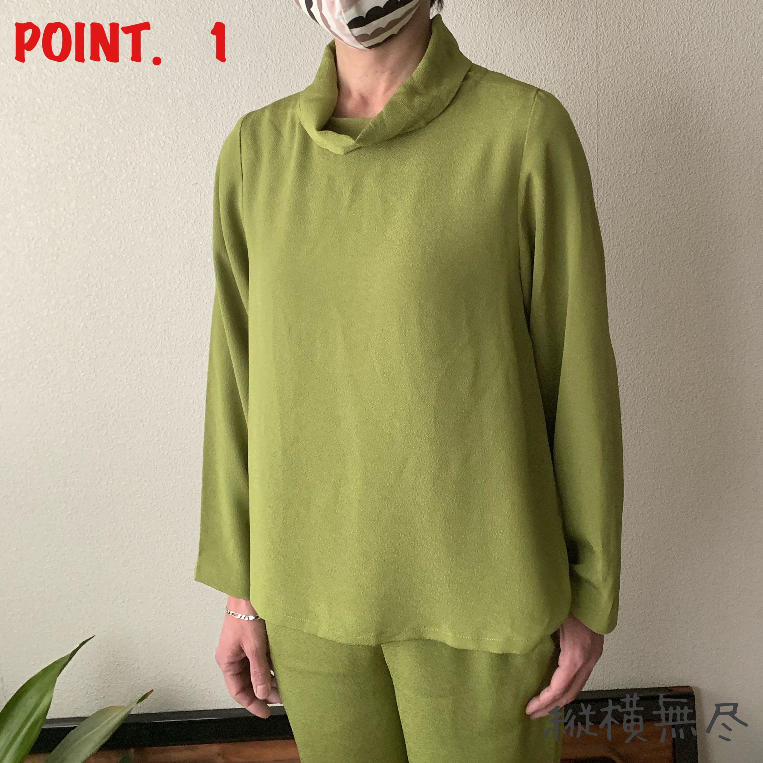 グリーン共生地の花のような襟ちりめんブラウスと↓