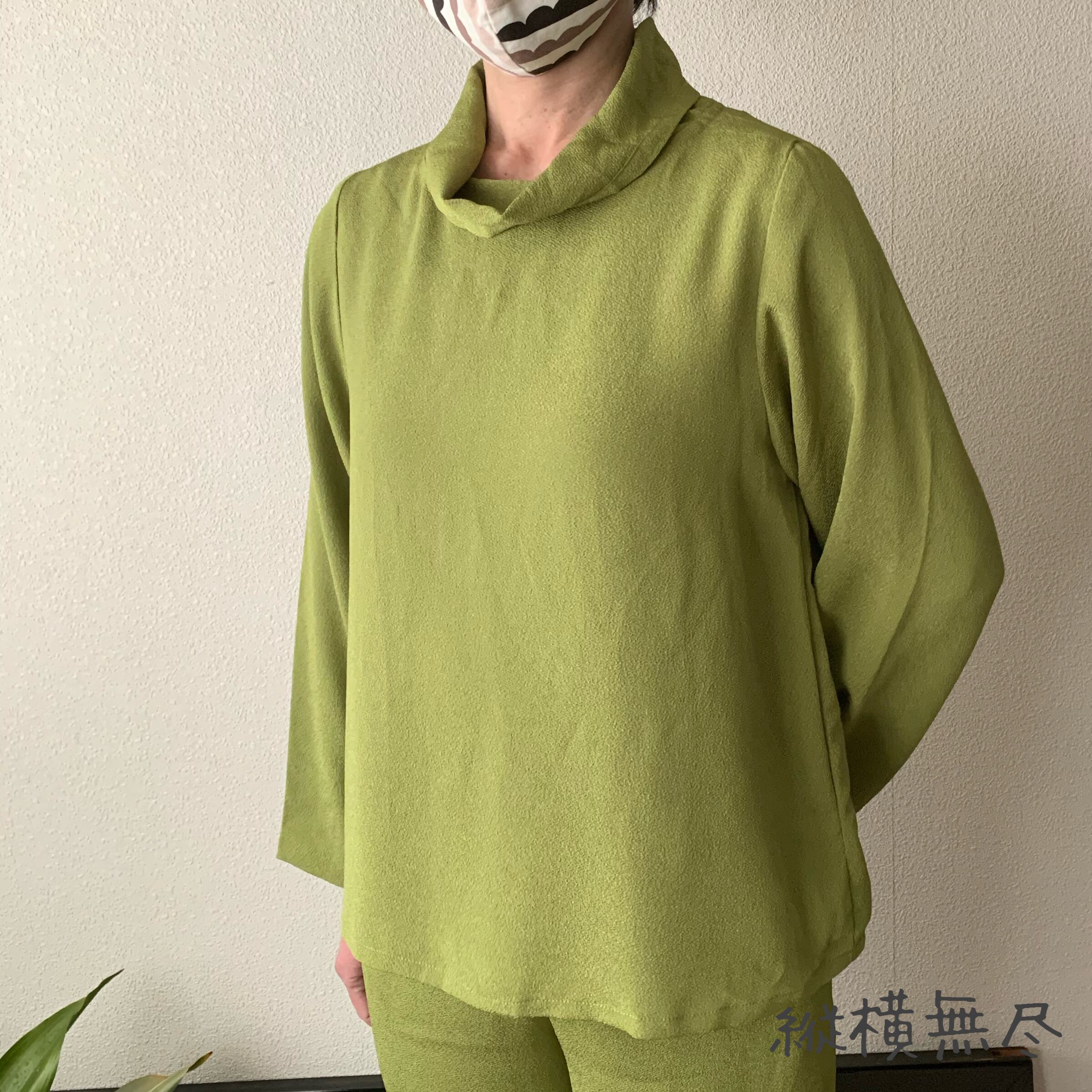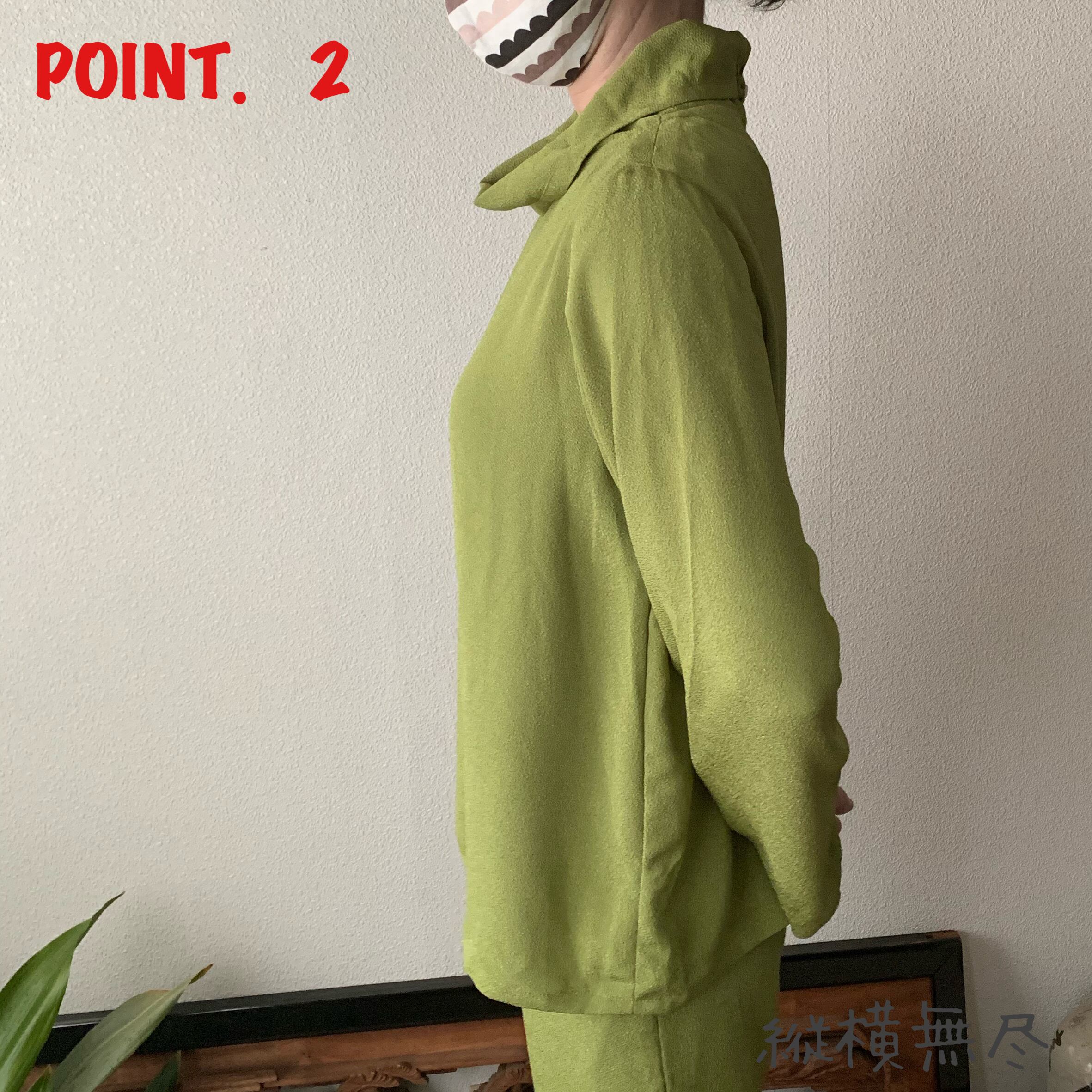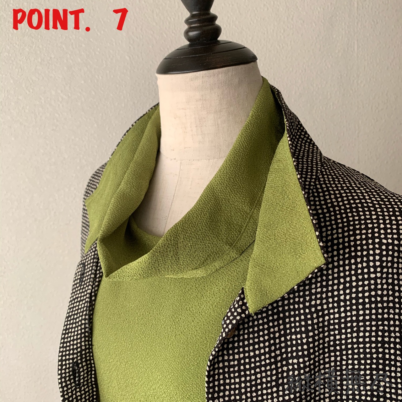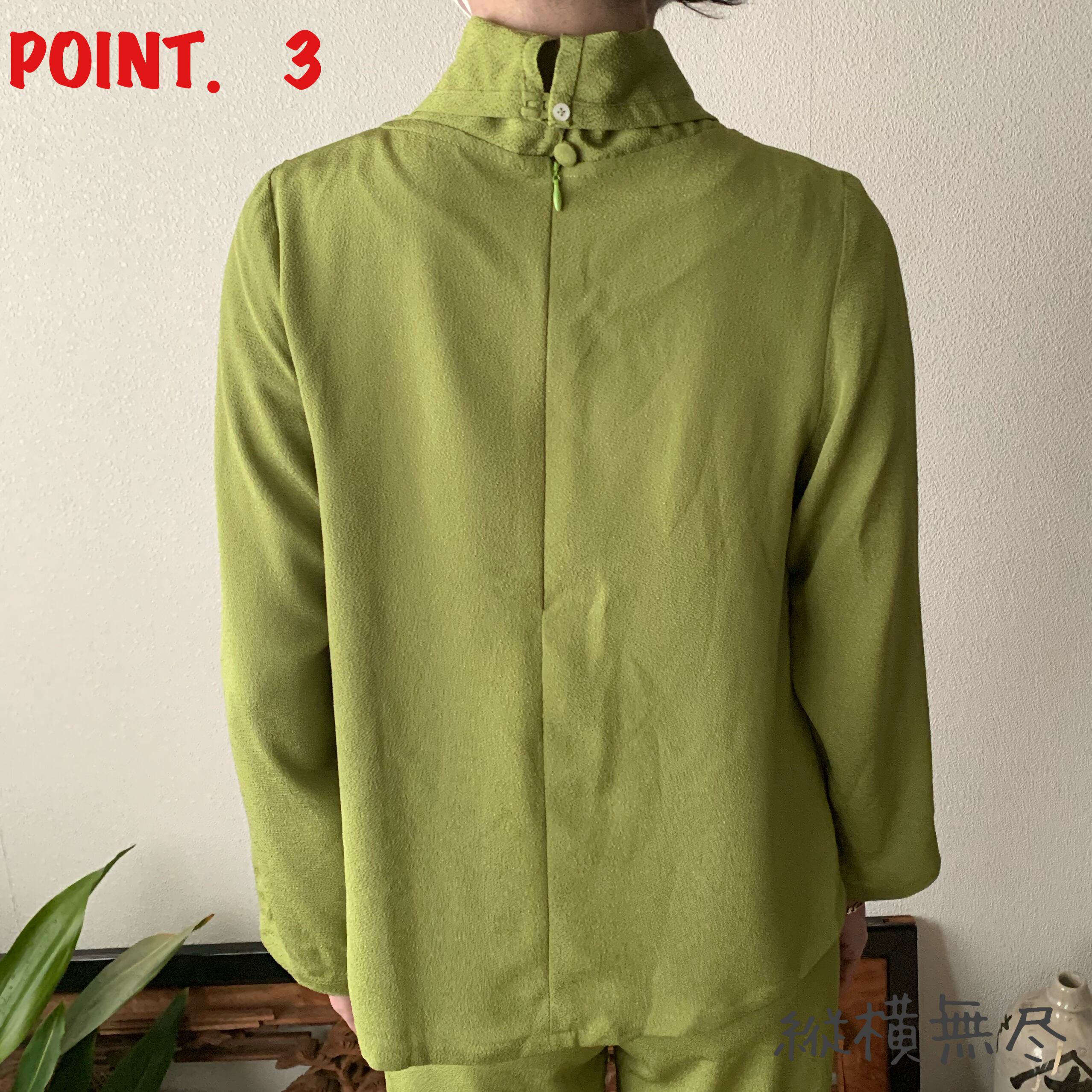 襟裏がグリーン共生地の花のような襟ちりめんブラウスとあわせるとより個性がでます。