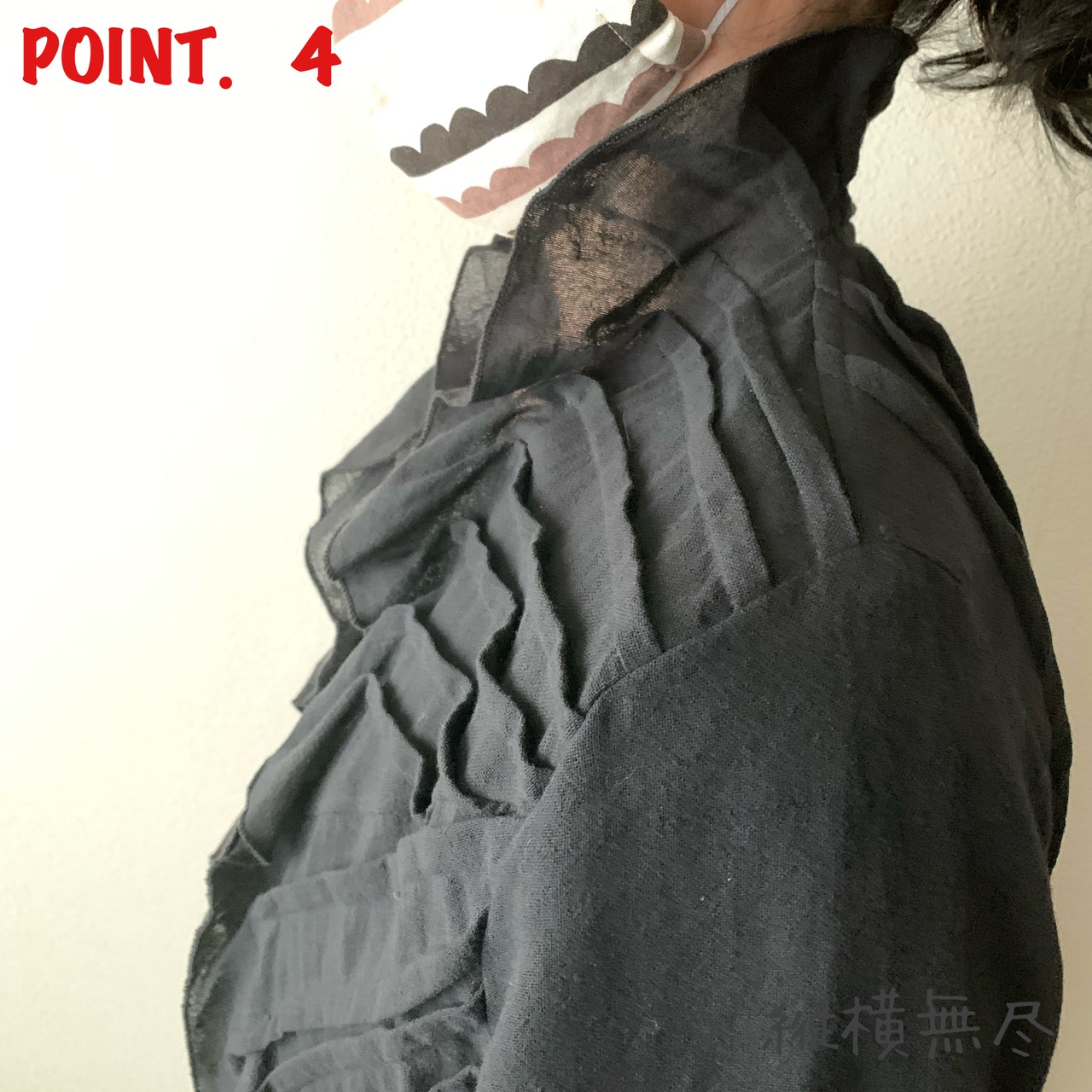 フリルとタックのバランスで襟元も高めのエレガントなシルエット。