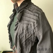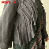 襟元から裾にかけて大きめのフリル、見ごろにはタックがほどこされていてエレガントラインに決まります。