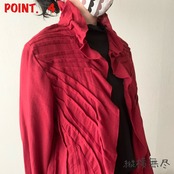 襟元から裾にかけて大きめのフリル、身ごろにはタックがほどこされていてエレガントラインに決まります。