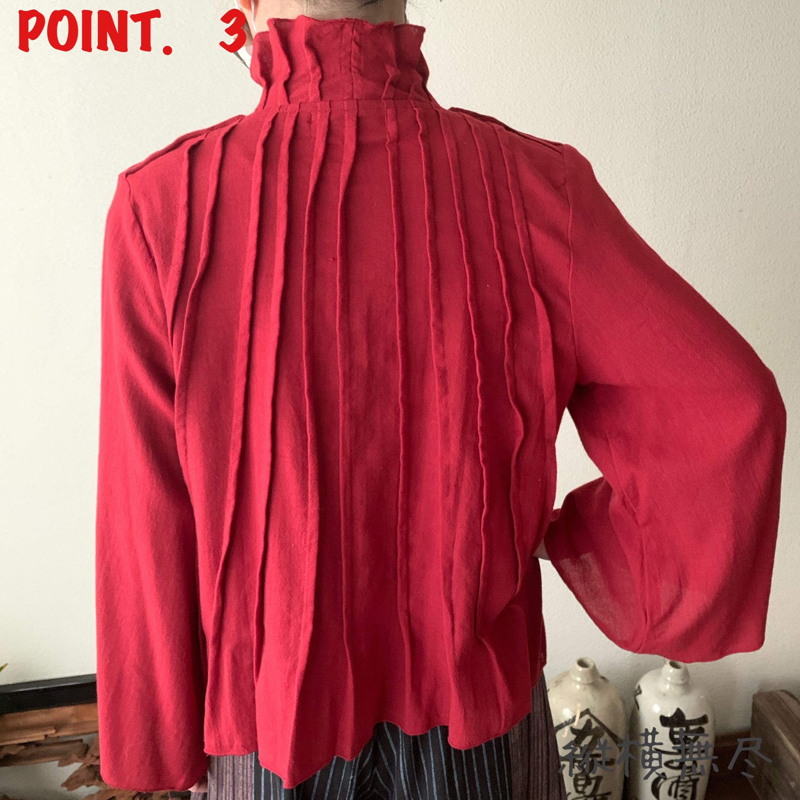 フリルとタックのバランスで襟元も高めのエレガントなシルエット。