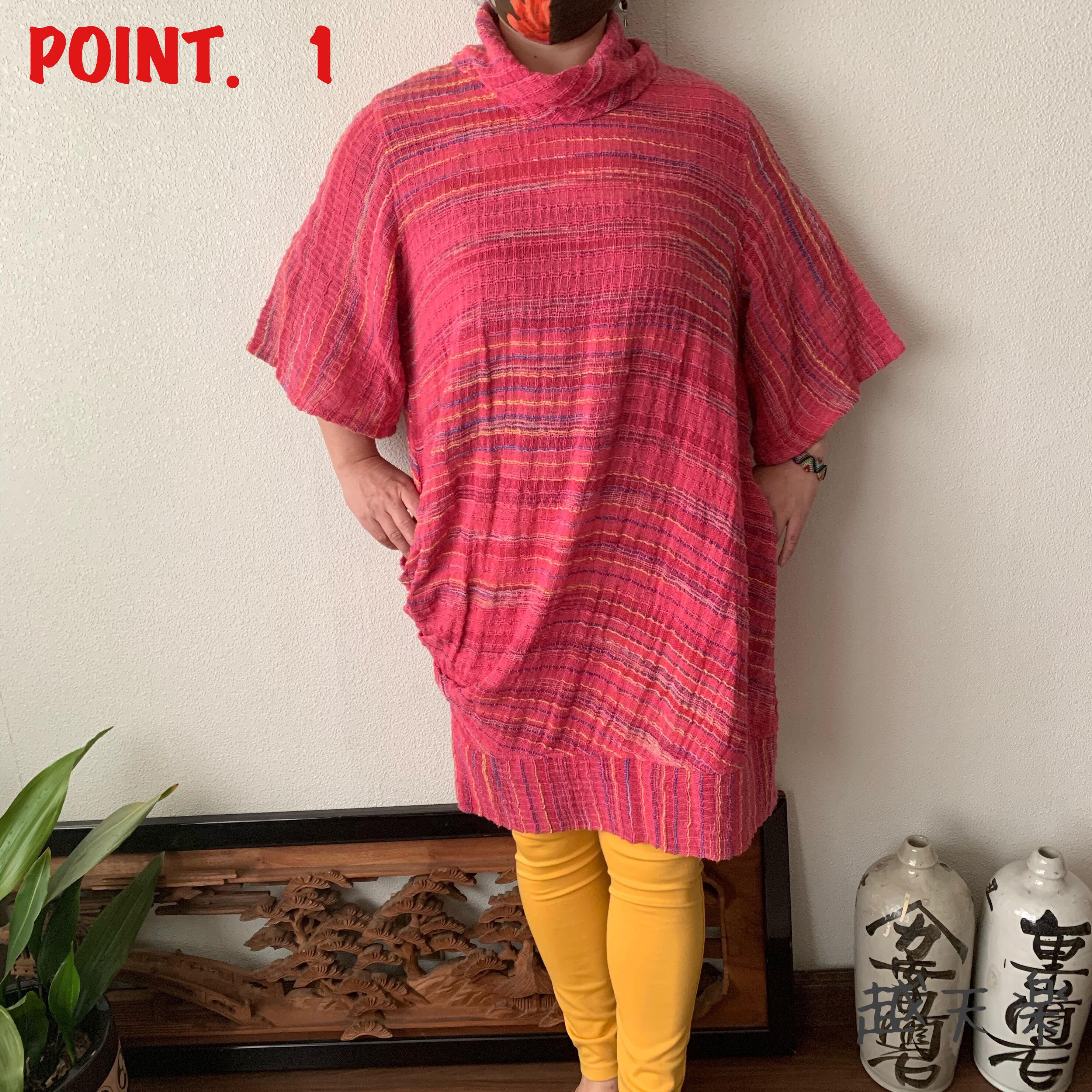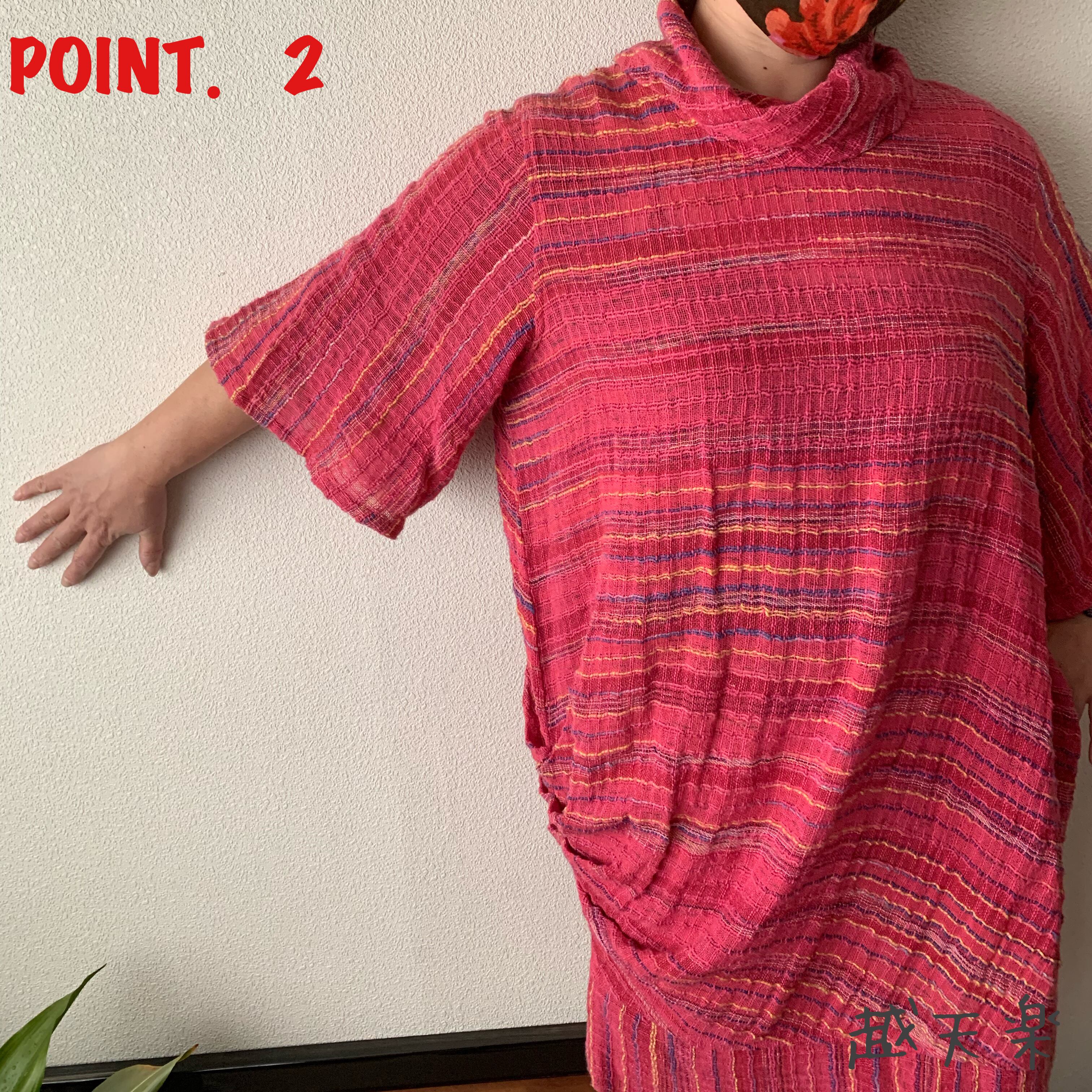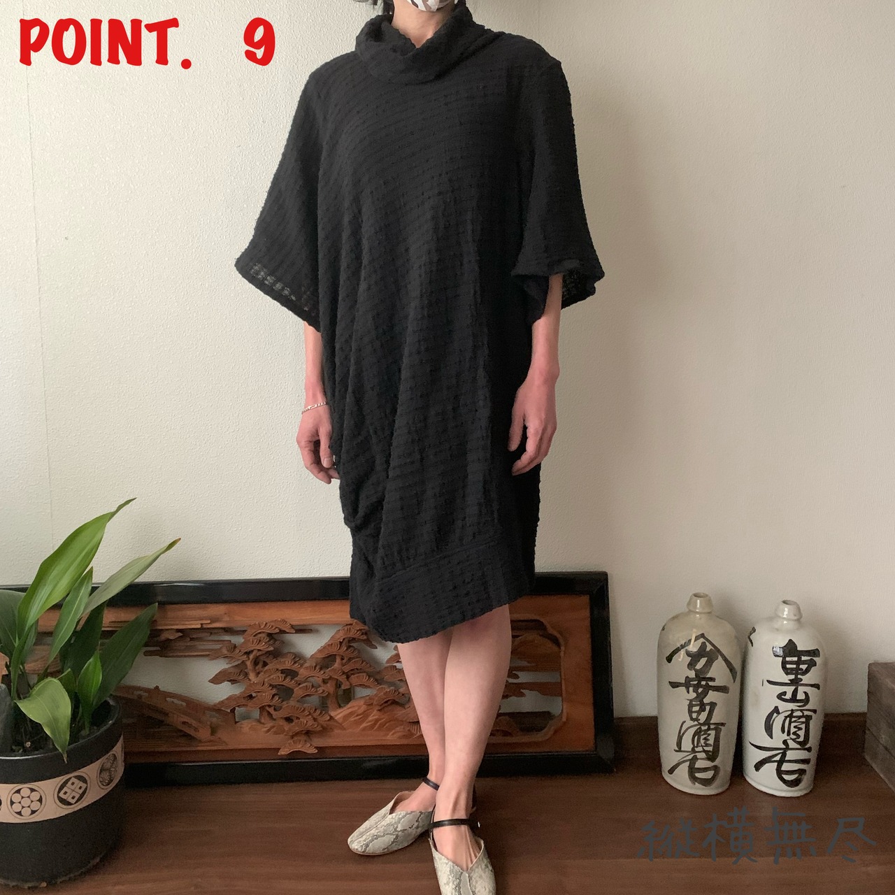 高めのロールネック(21cm)がバイヤスで自由に遊べること、ワンサイドギャザーで身頃が流れるようなラインになっていること、袖がベルスリーブでフェミニンなこと、裾の切り替えの生地向きを変えて足長効果があること等々、ポイントはたくさんありますが、これだけポイントがあるのにシンプルに着こなせるのがこのチュニックの面白いところです。