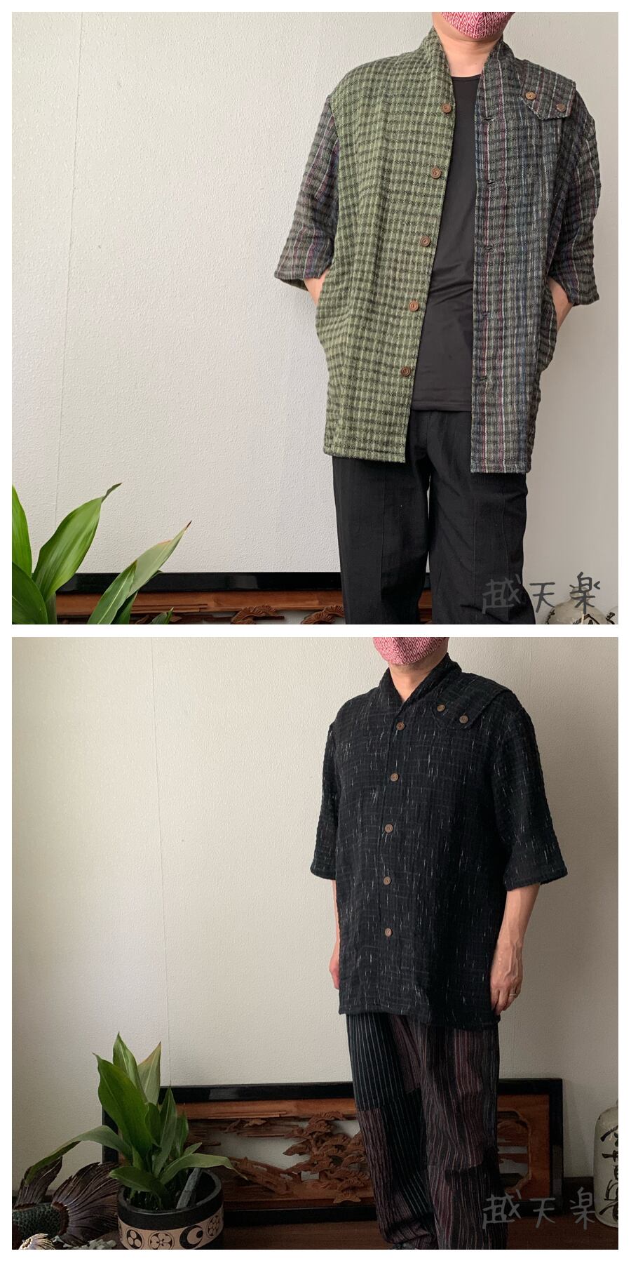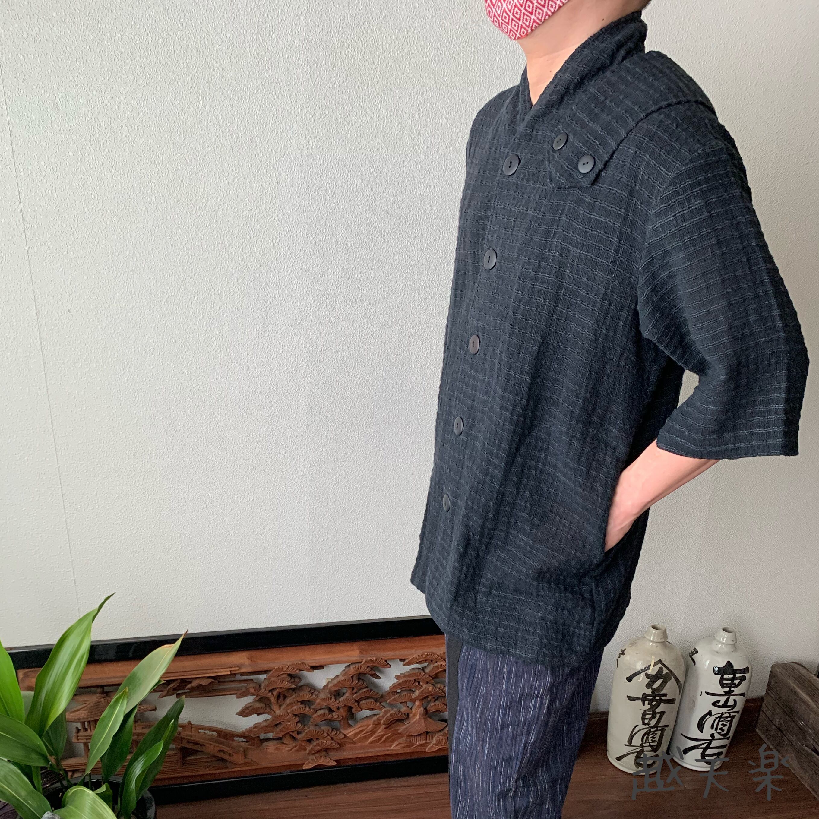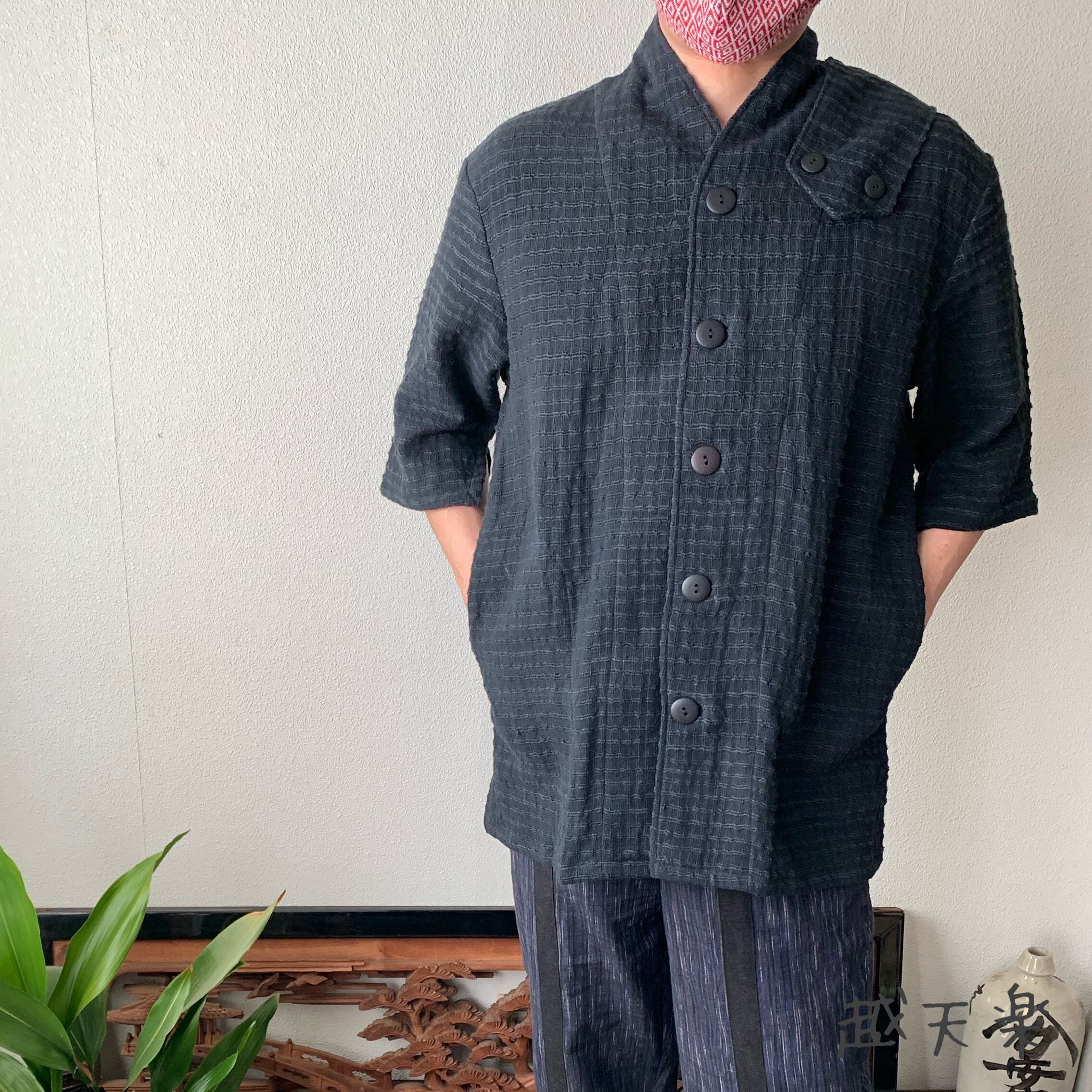 越天楽で男性に好まれる、シンプルな形だけど遊びを入れているメンズラインの手織り綿前開き半袖ブラウスです。