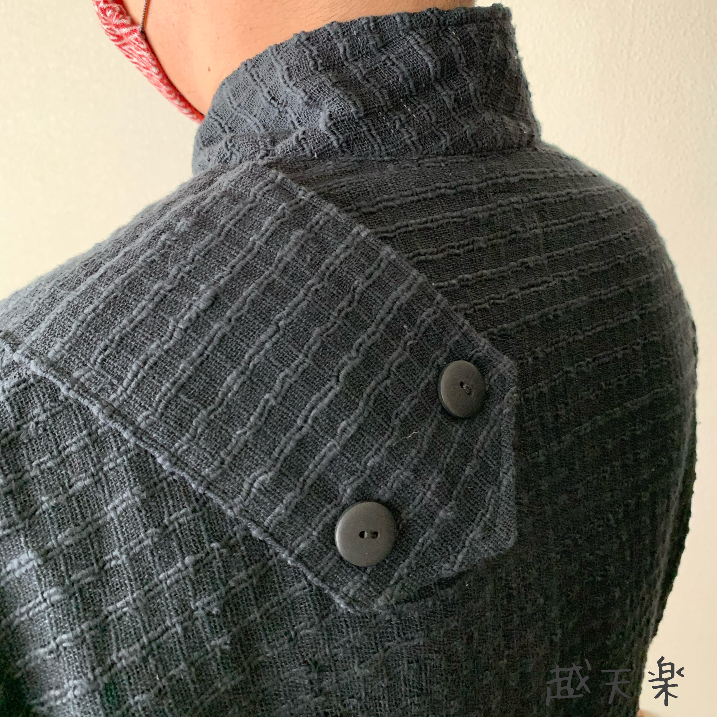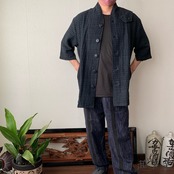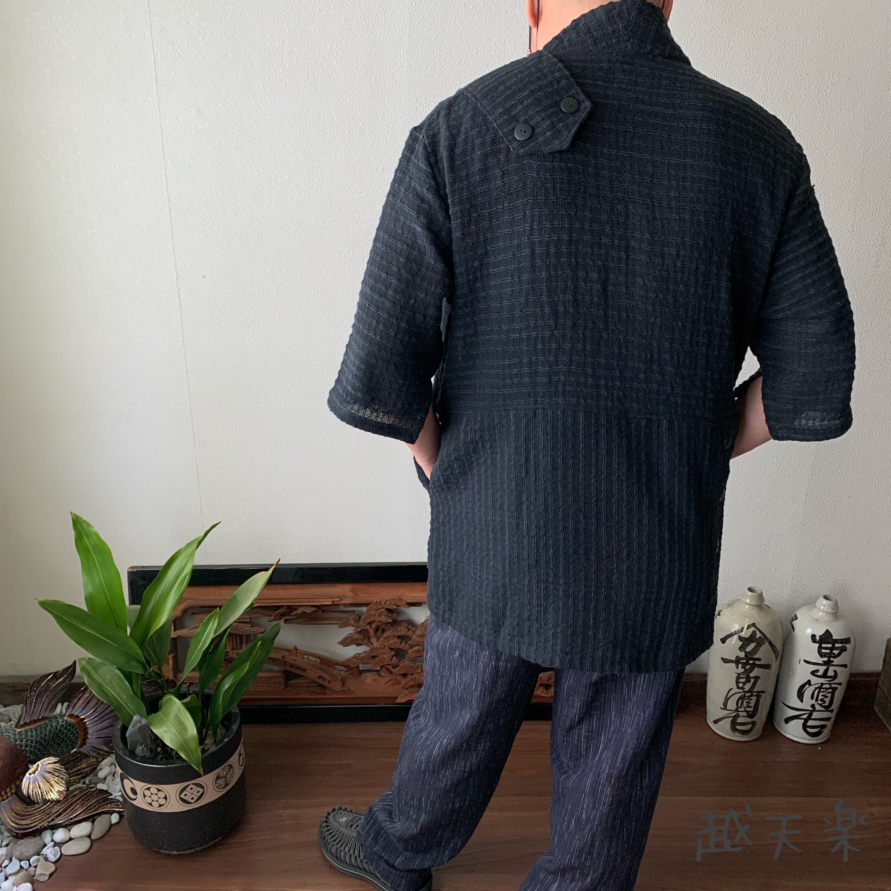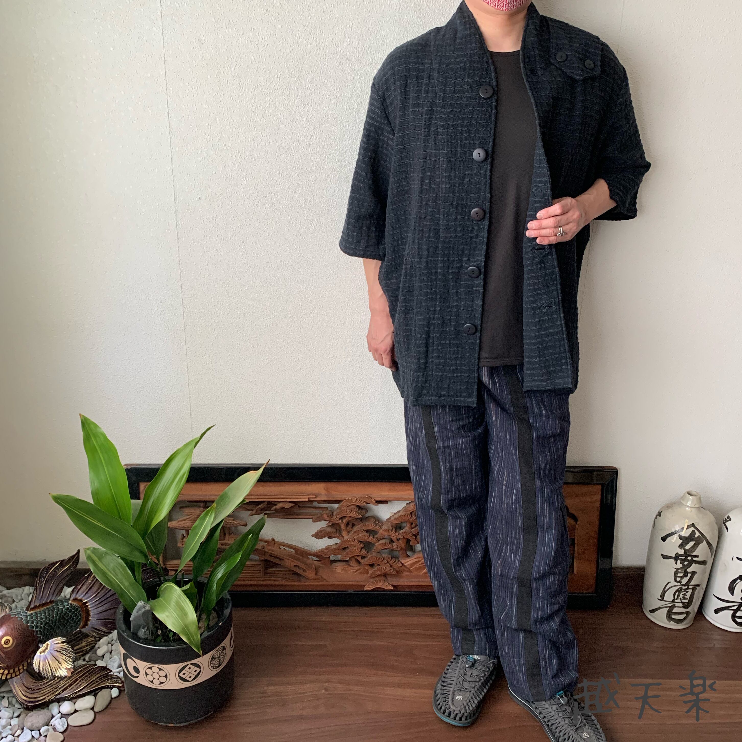 越天楽で男性に好まれる、シンプルな形だけど遊びを入れているメンズラインの手織り綿前開き半袖ブラウスです。