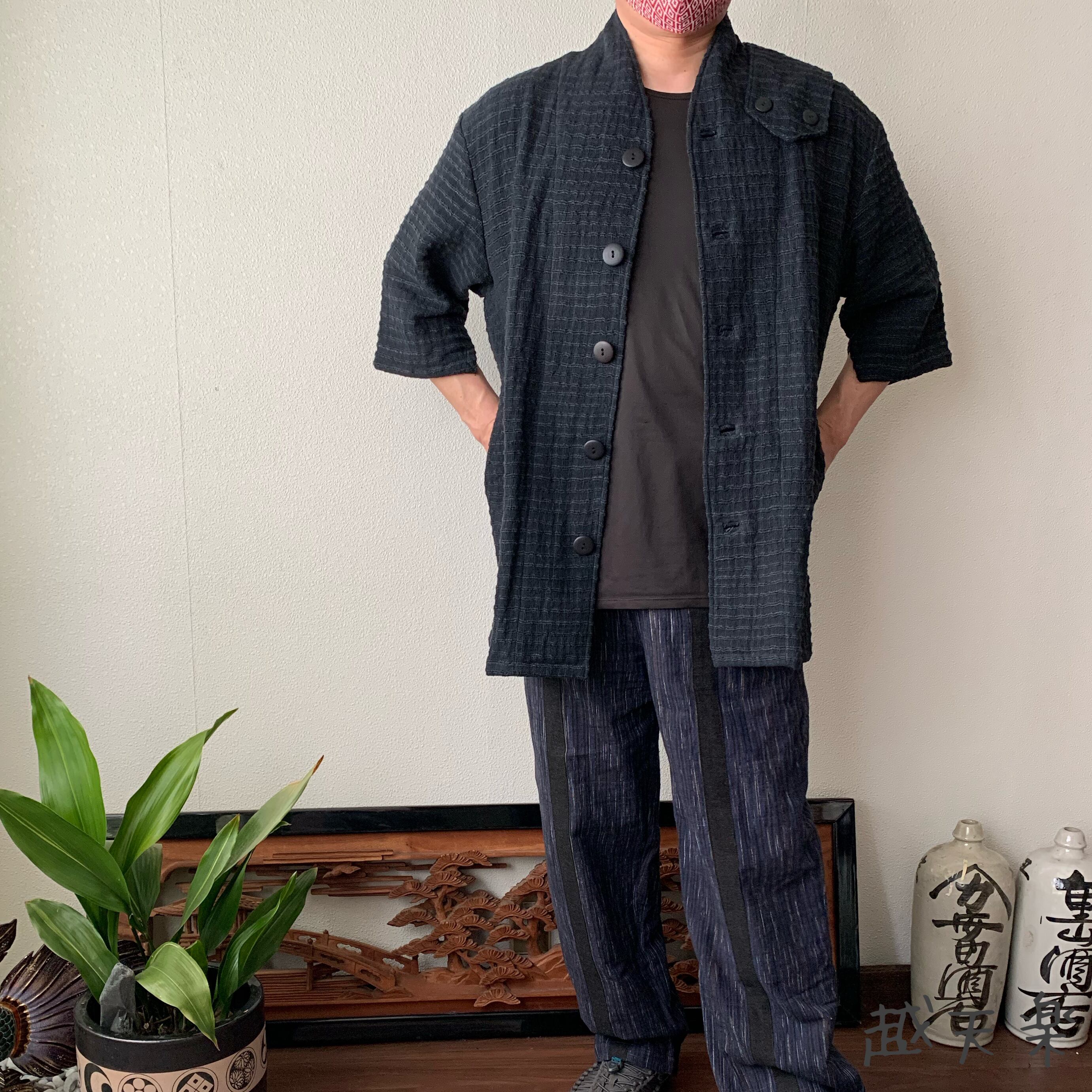 写真セットで履いている前身切り替えライン手織り綿メンズパンツはこちら↓