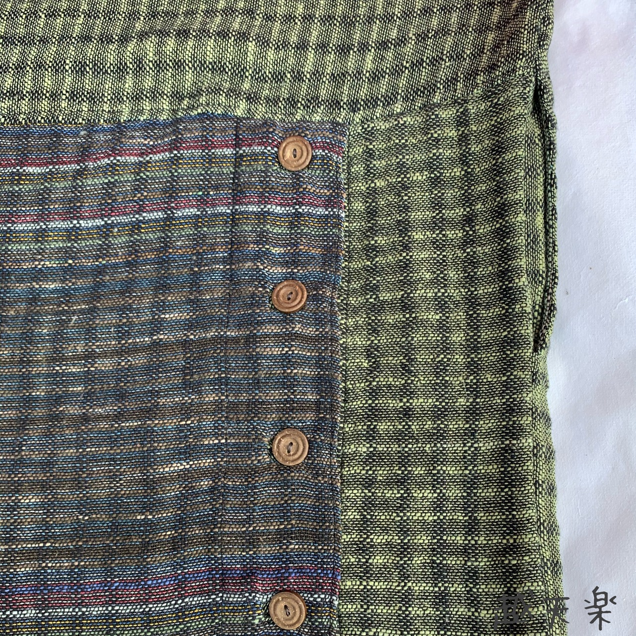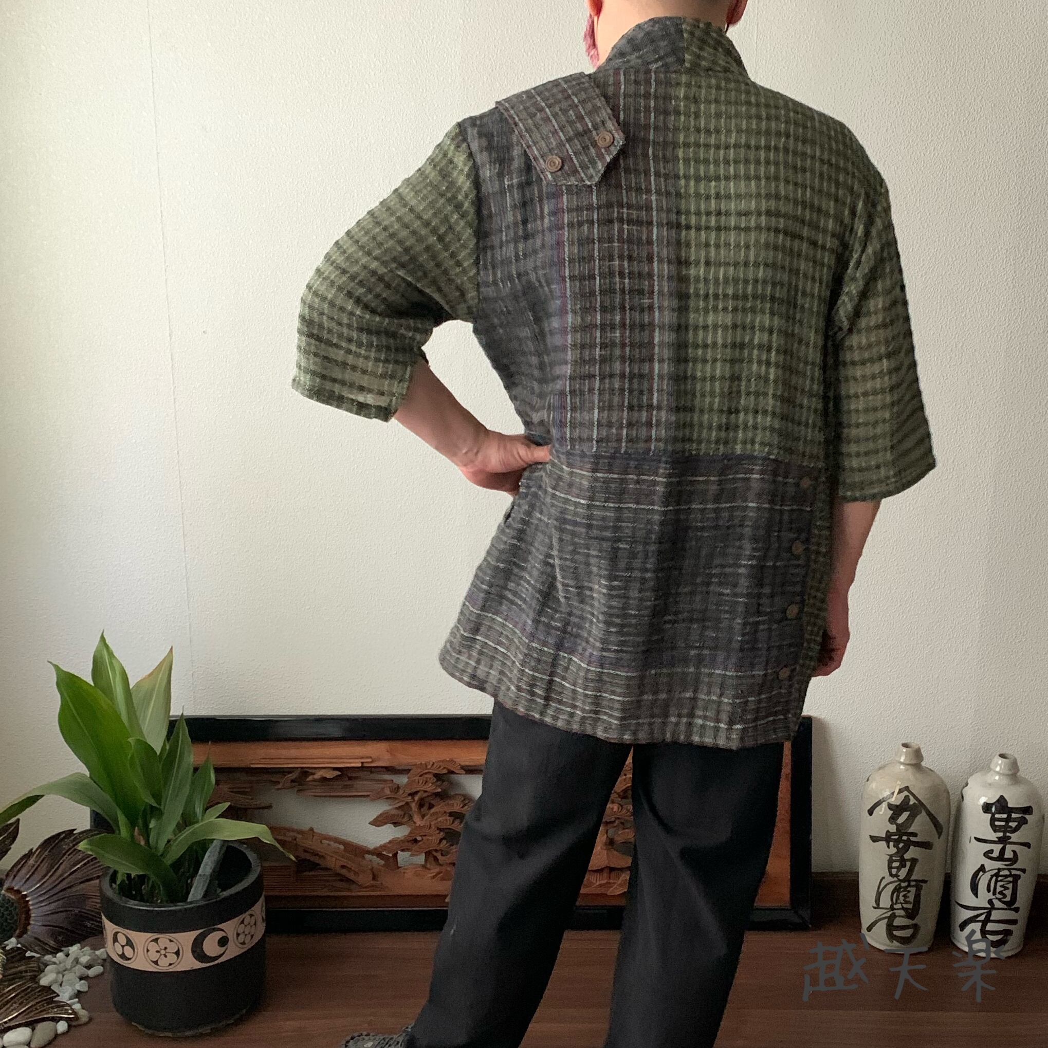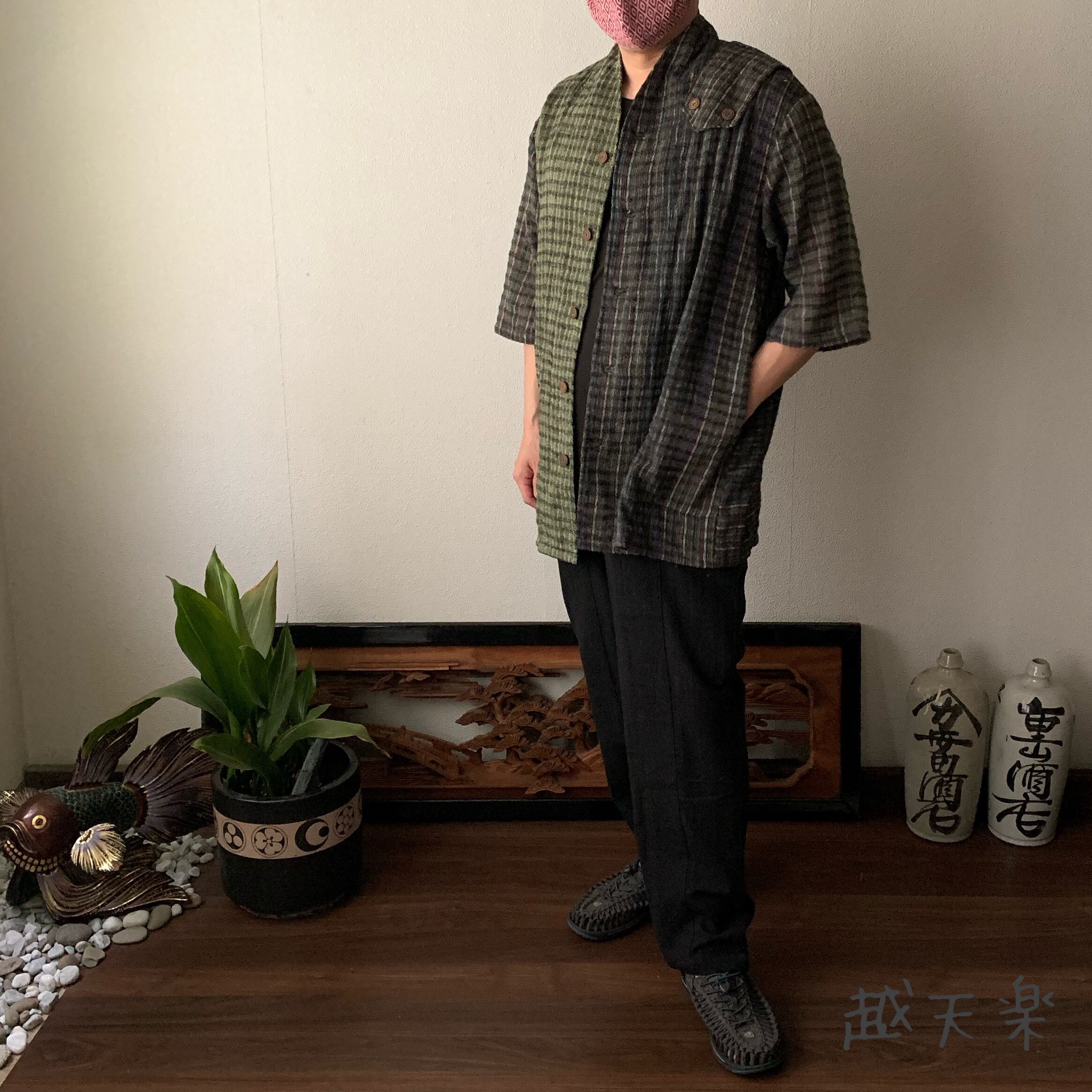 肩ワンサイドベルト前開き手織り綿半袖メンズブラウス 緑絣