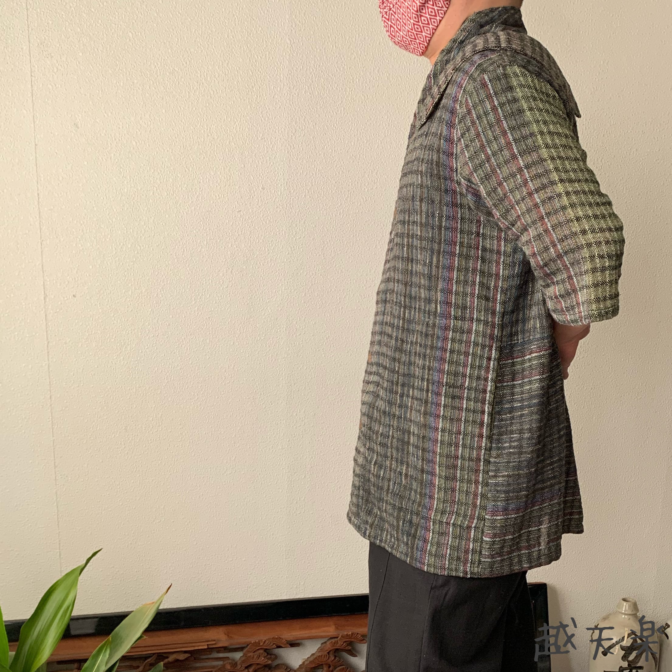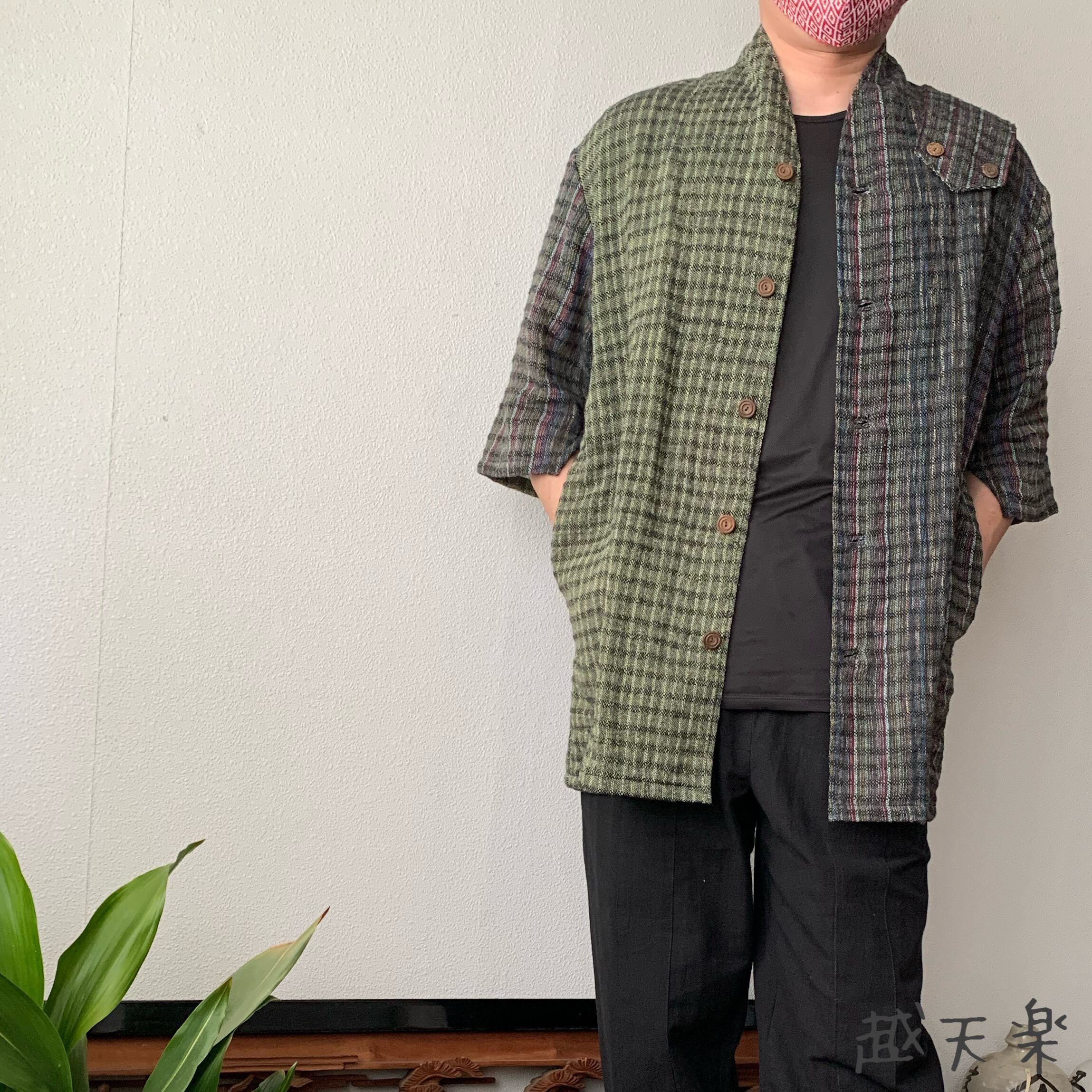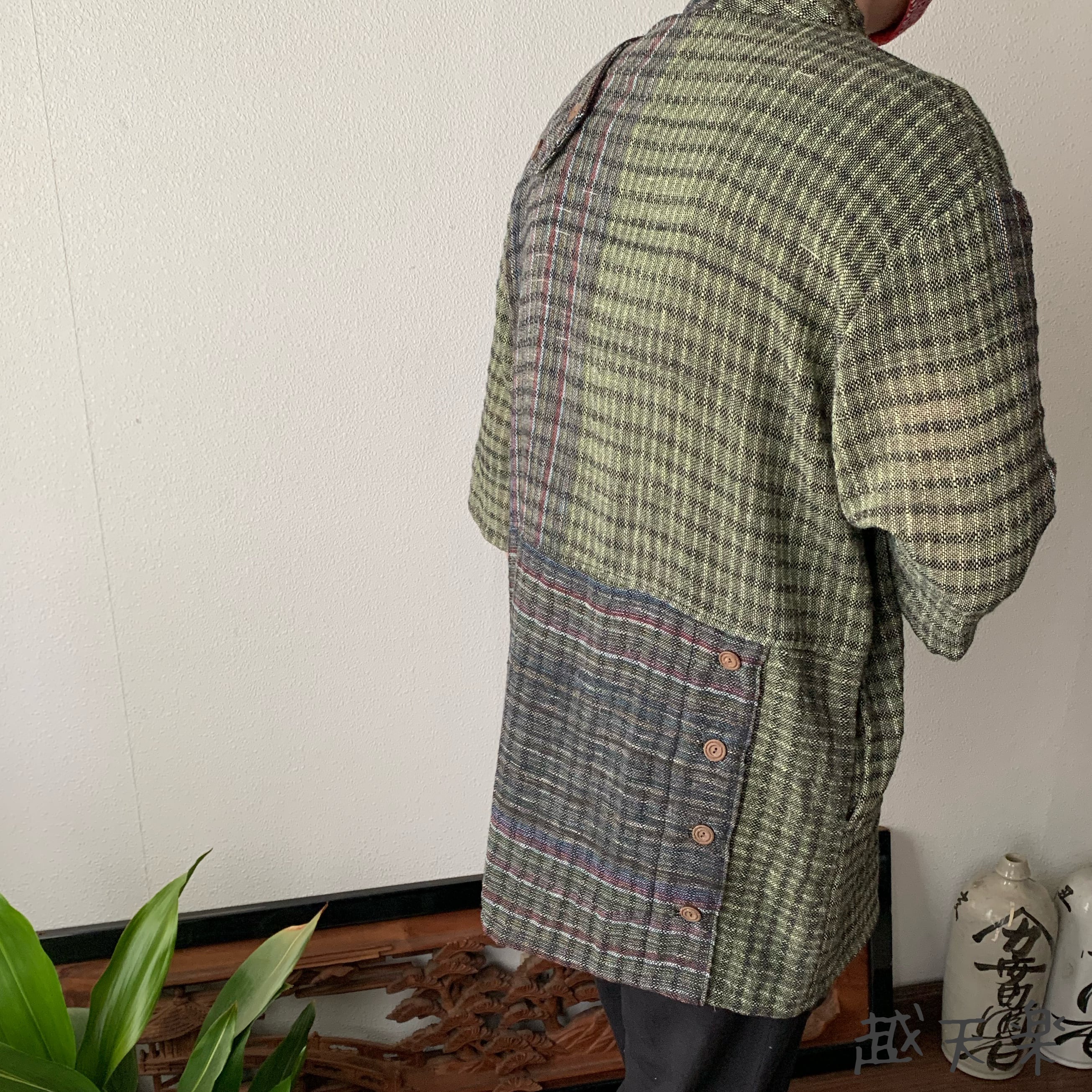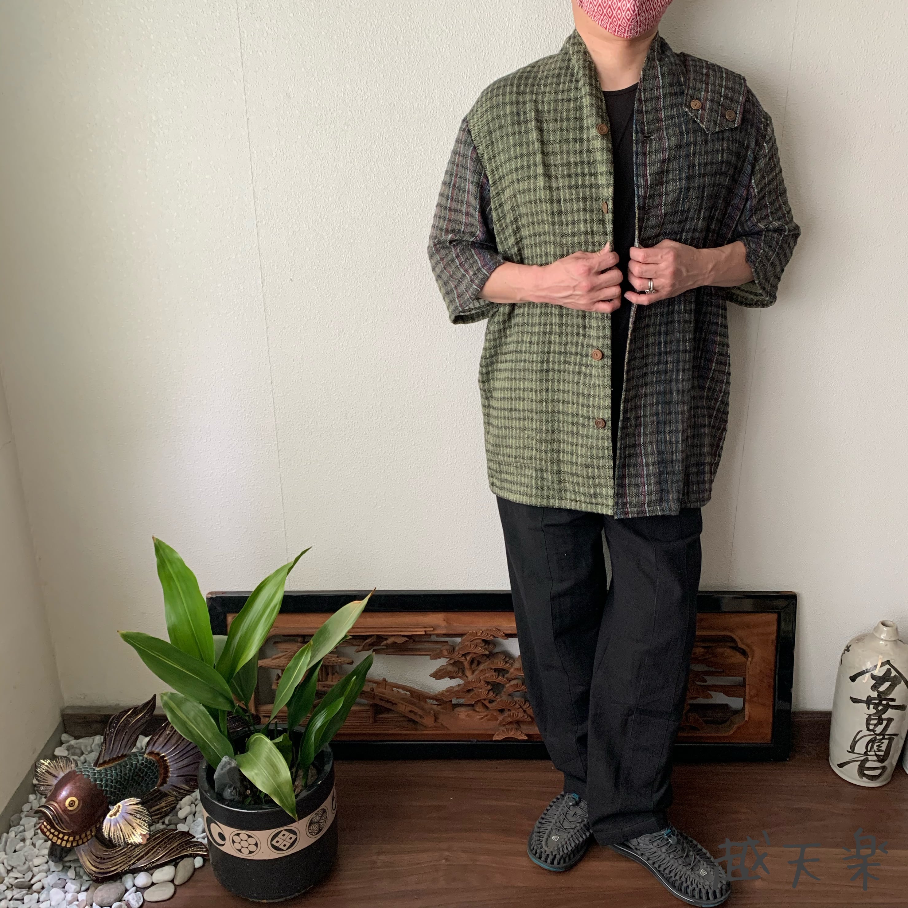 肩ワンサイドベルト前開き手織り綿半袖メンズブラウス 緑絣