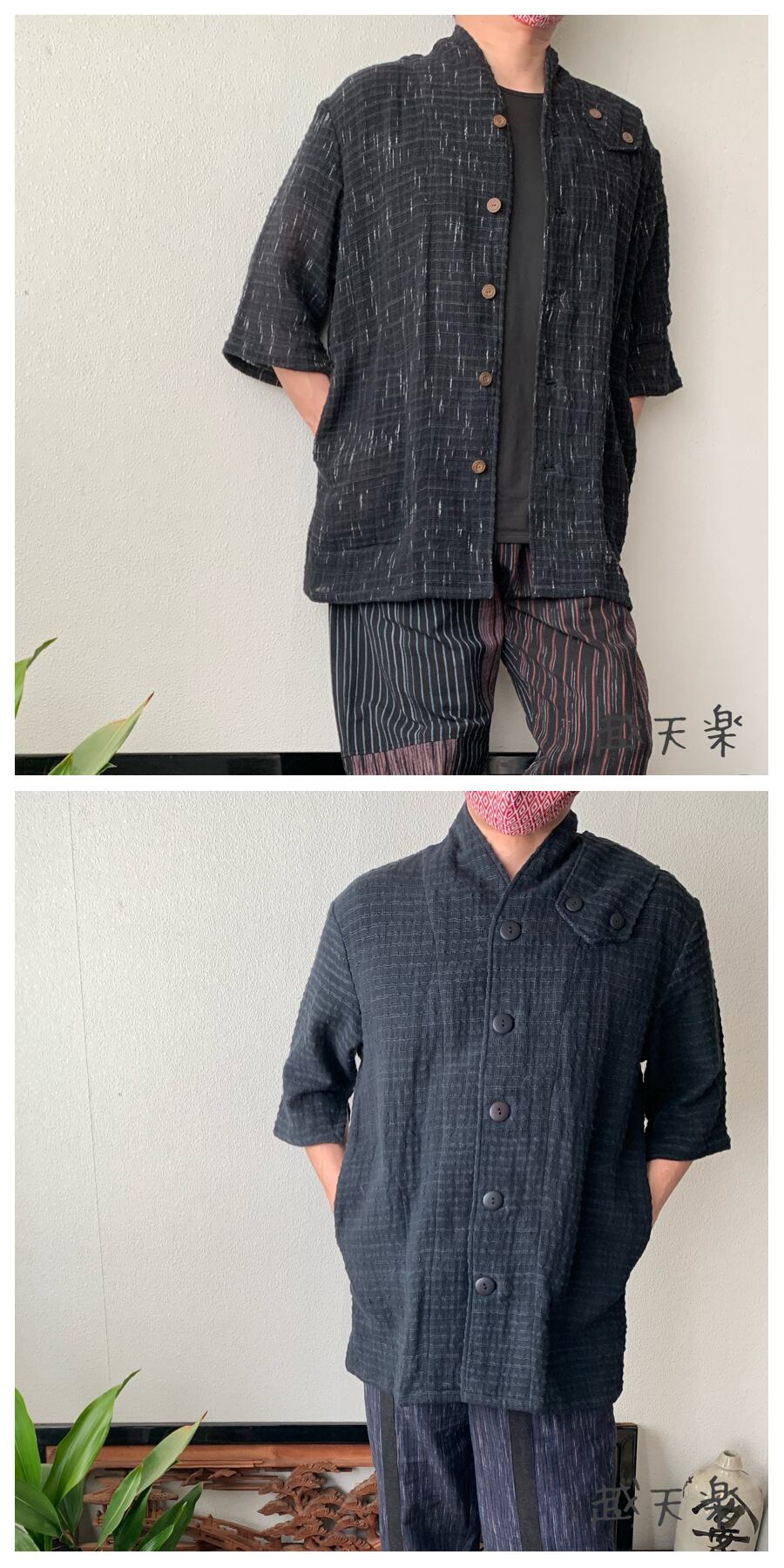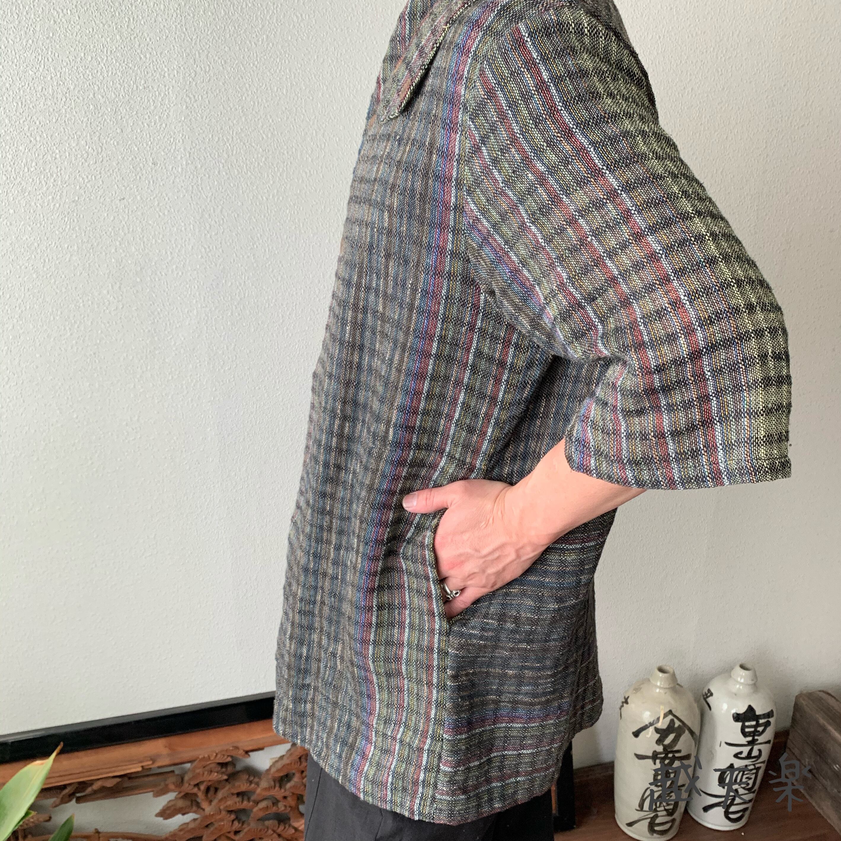 越天楽で男性に好まれる、シンプルな形だけど遊びを入れているメンズラインの手織り綿前開き半袖ブラウスです。