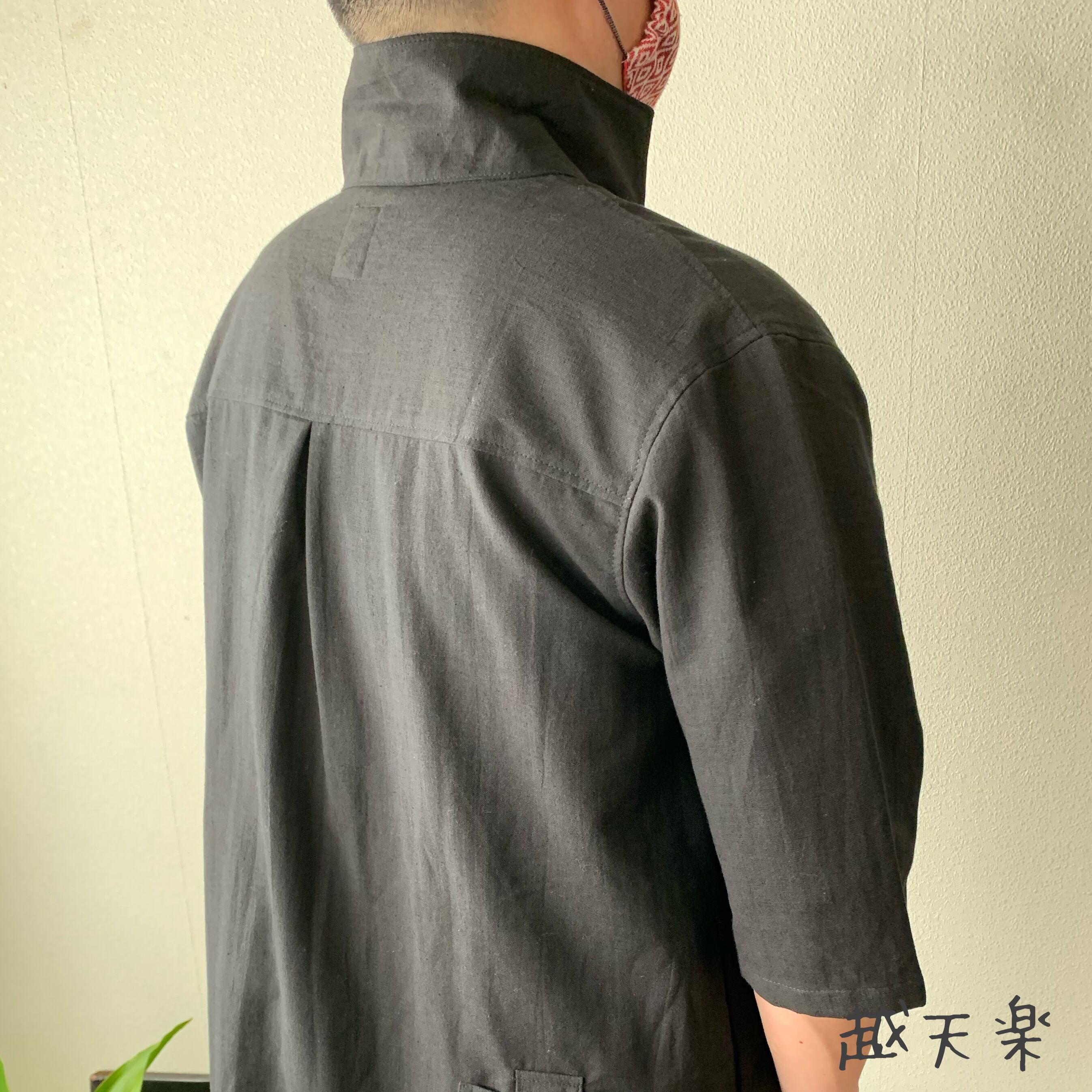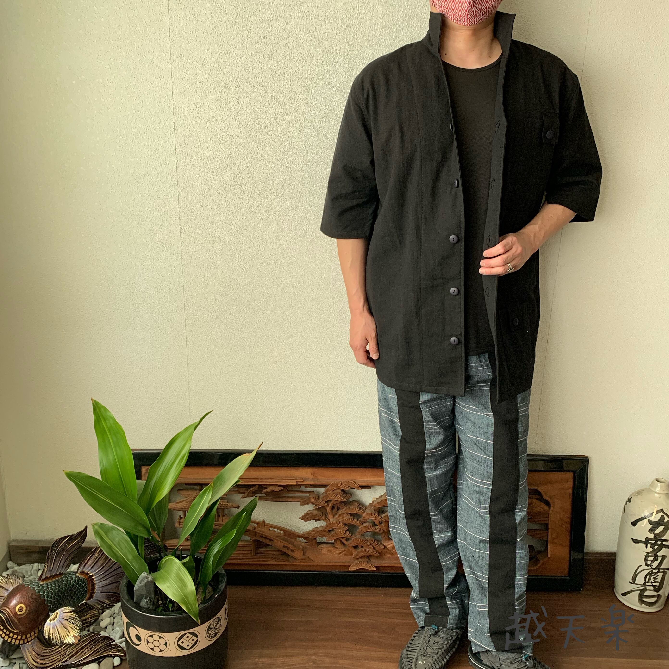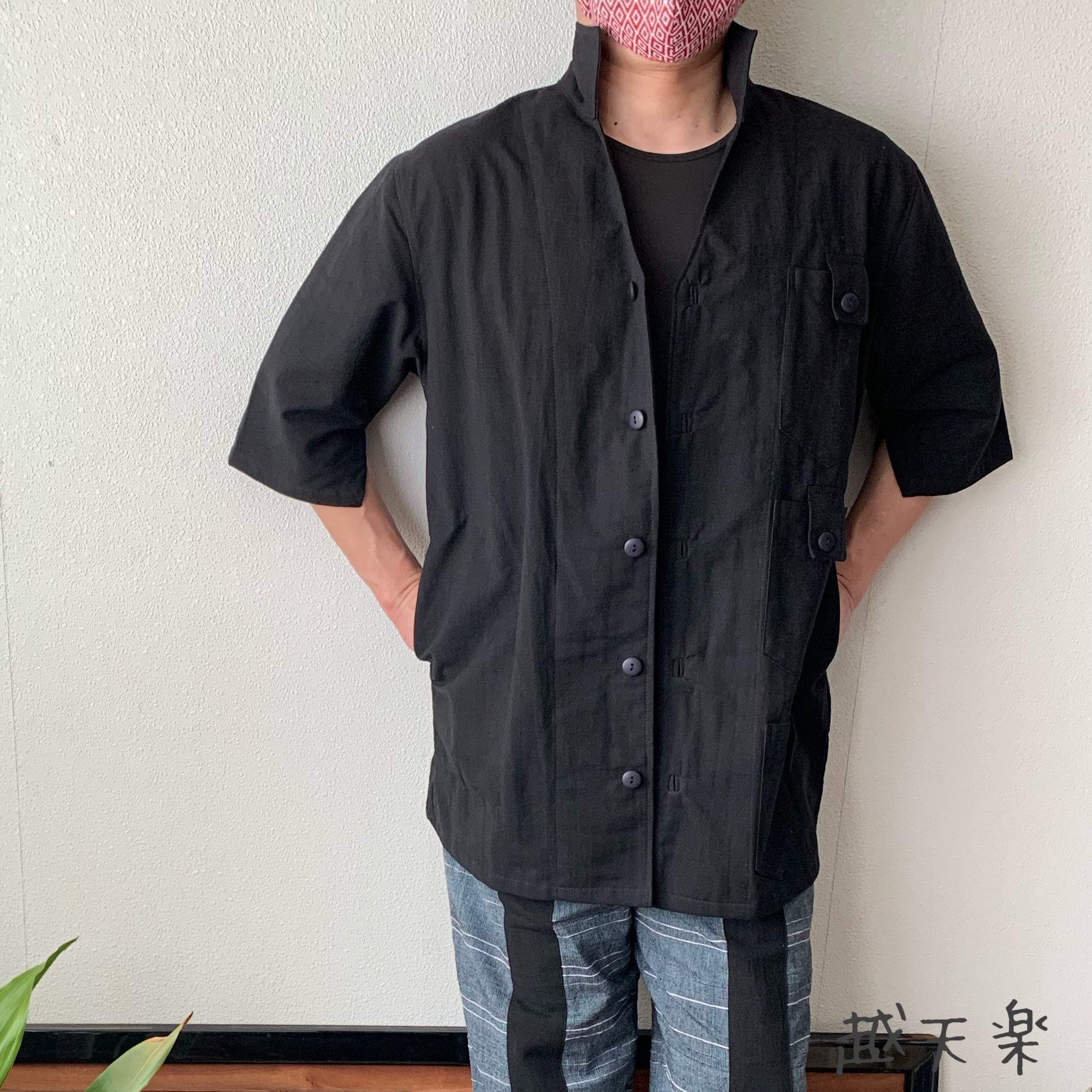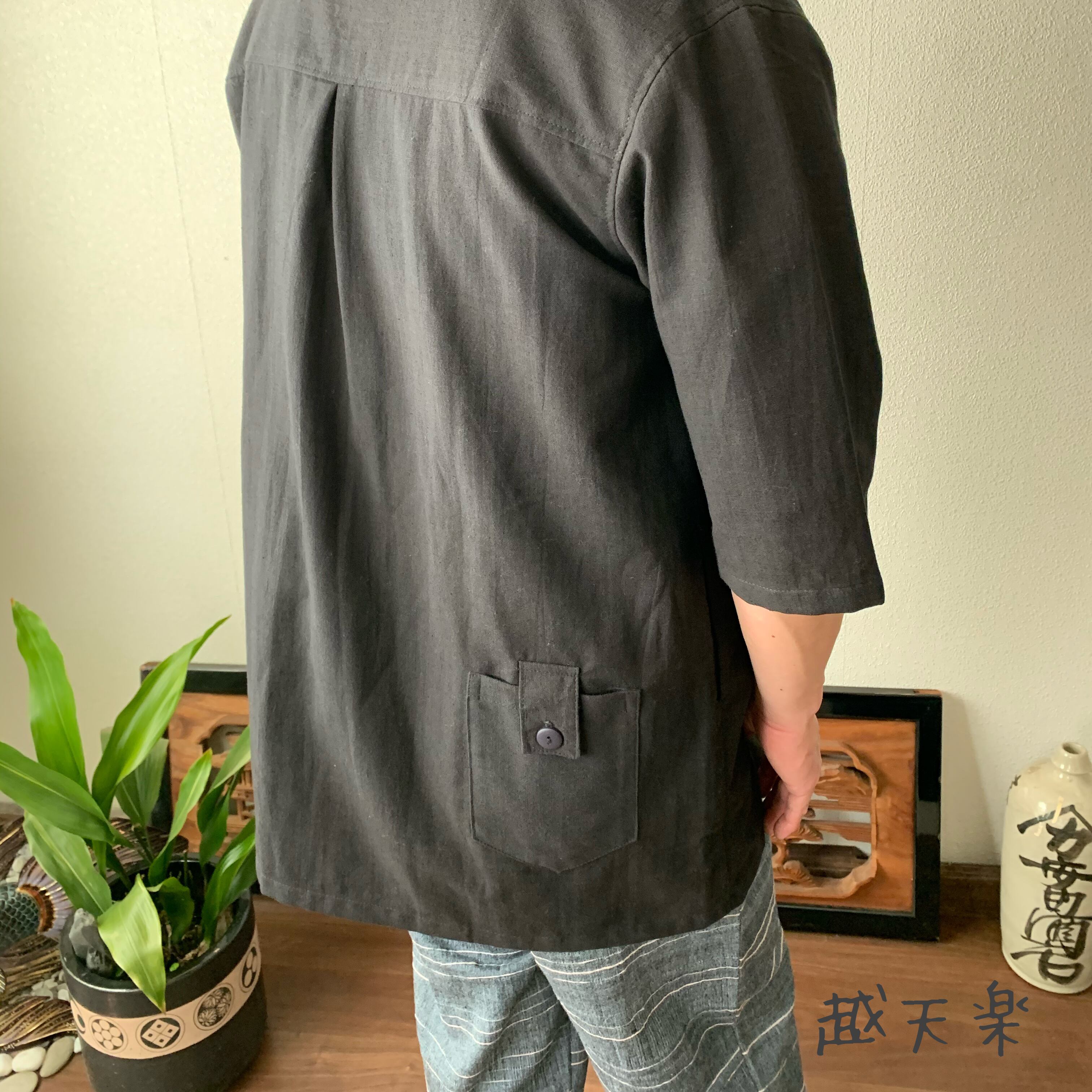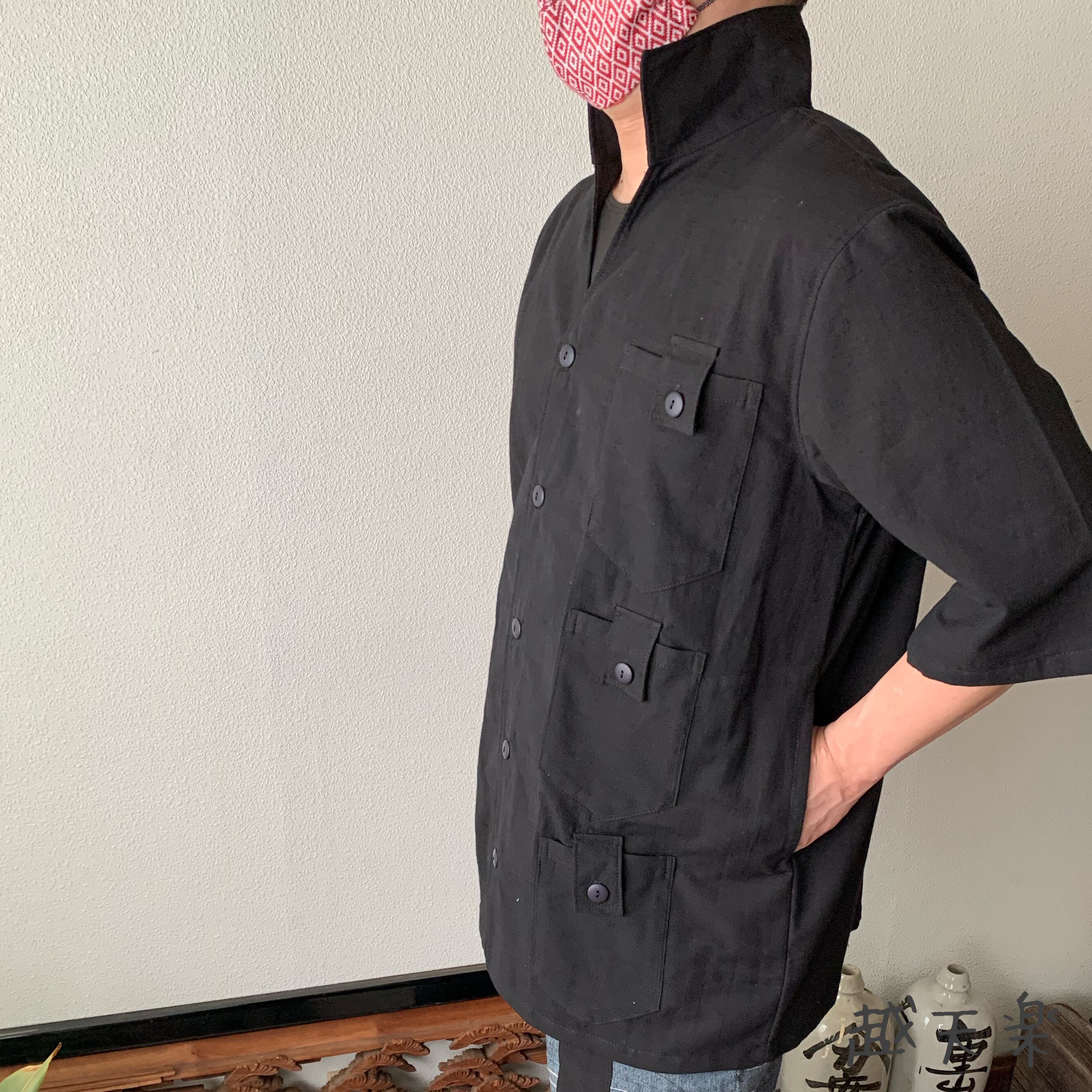 『2021年「越天楽」春夏新作作品 前身頃ワンサイド縦パッチポケット前開き手織り綿半袖メンズブラウス 後ろセンターボックスで肩も動きやすく』