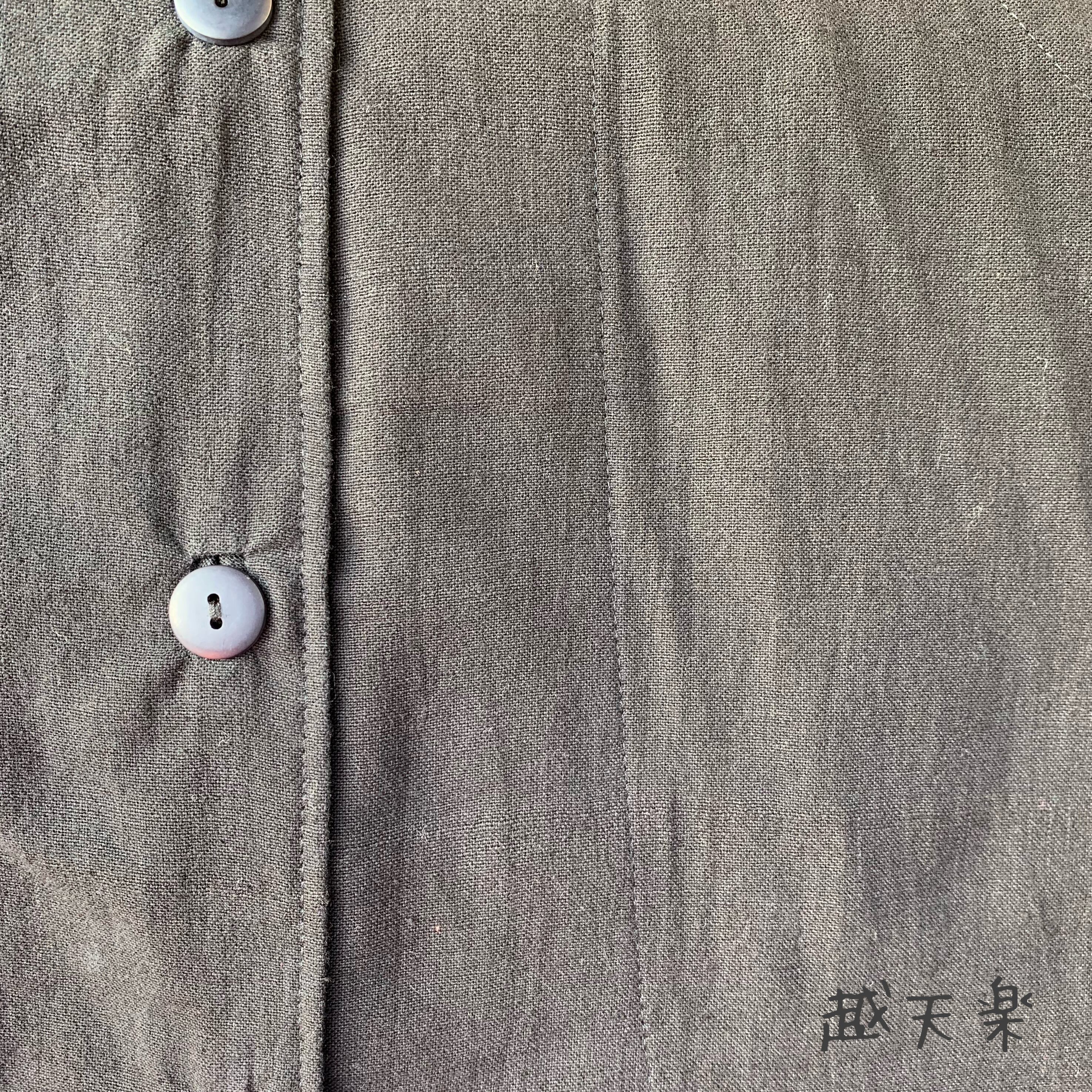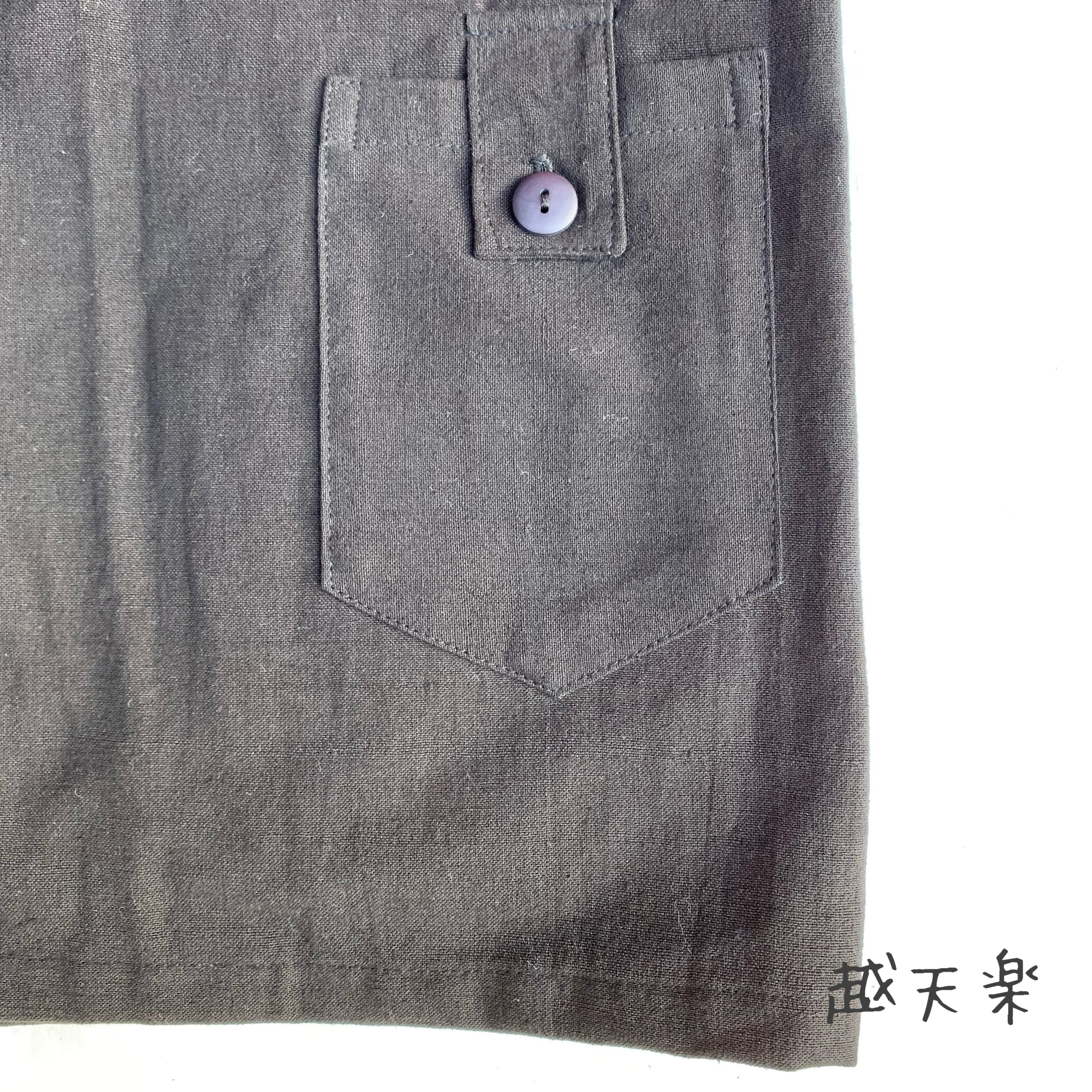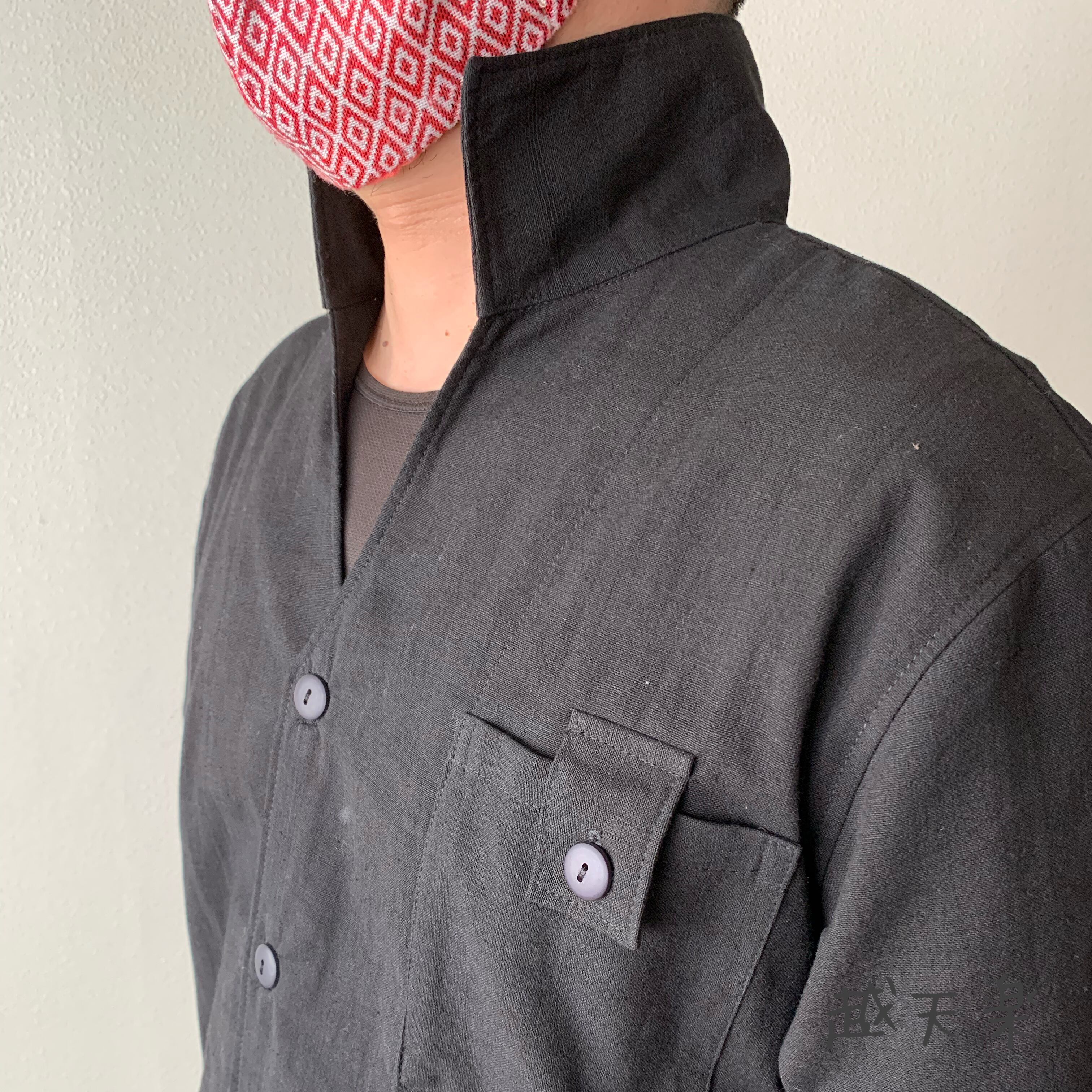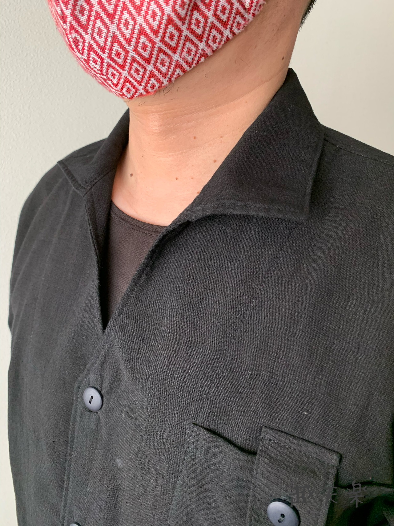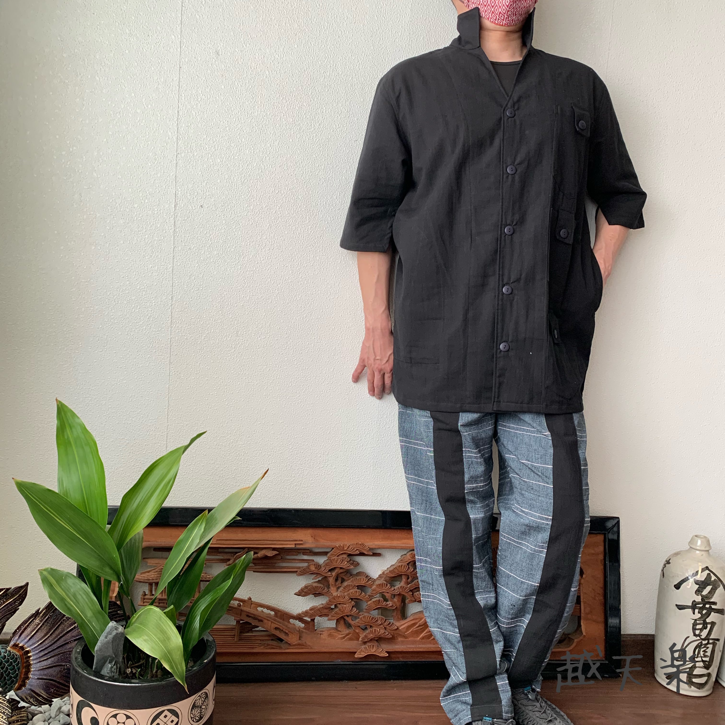 『2021年「越天楽」春夏新作作品 前身頃ワンサイド縦パッチポケット前開き手織り綿半袖メンズブラウス 後ろセンターボックスで肩も動きやすく』