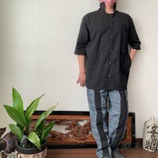 越天楽で男性に好まれる、シンプルな形だけど遊びを入れているメンズラインの手織り綿前開き半袖ブラウスです。