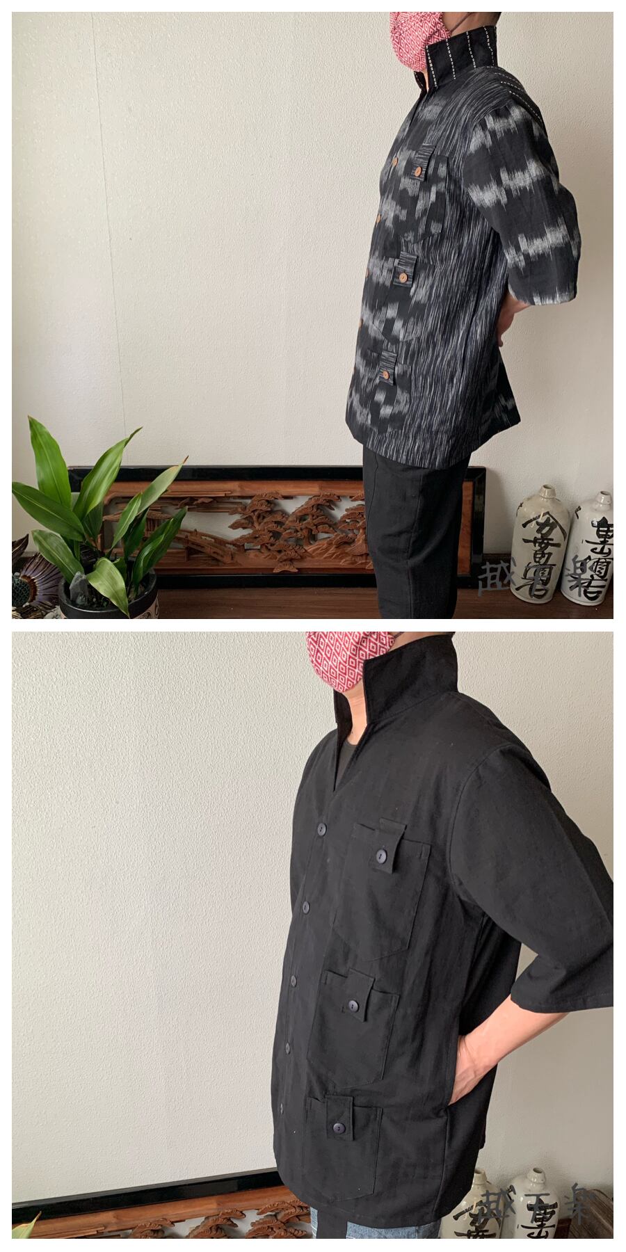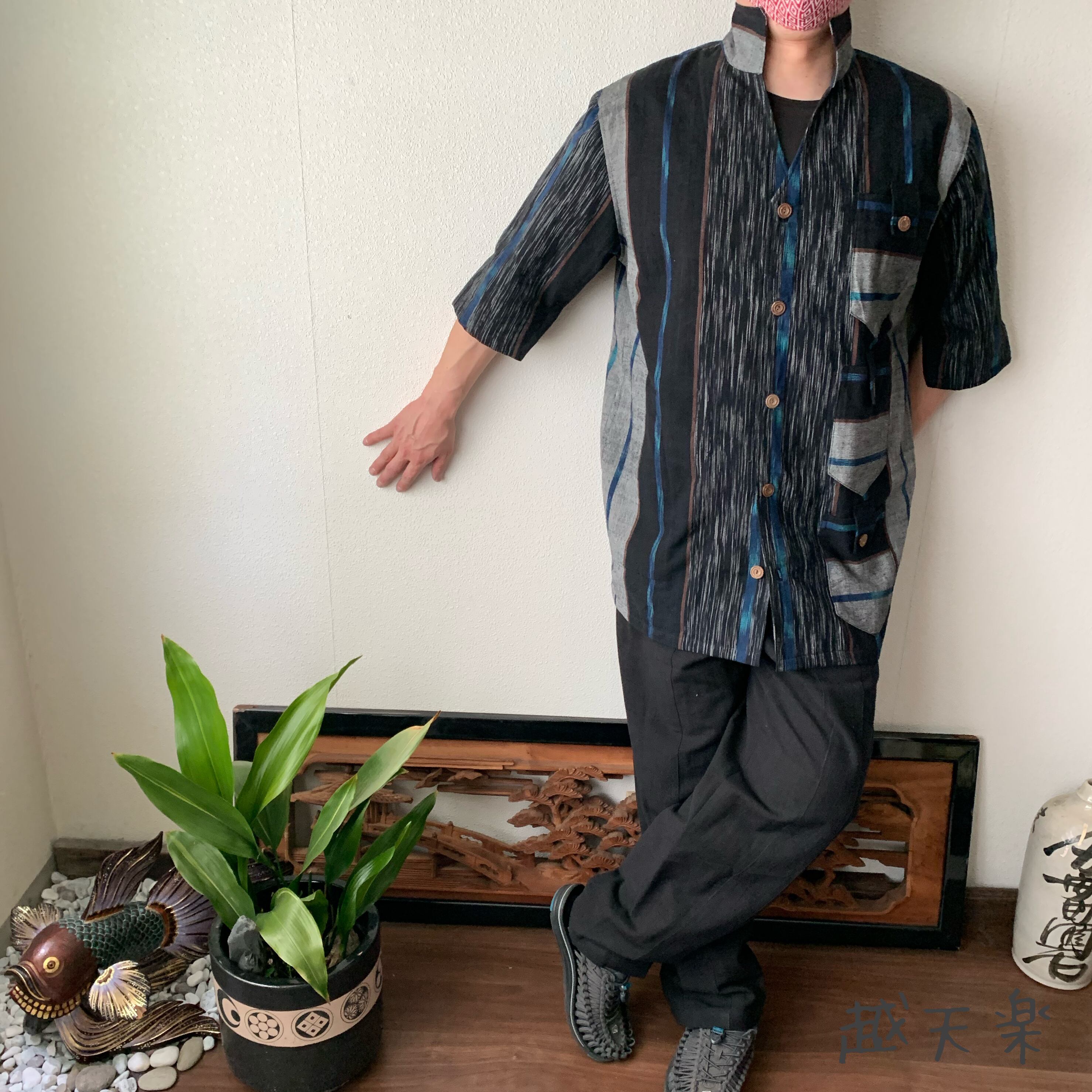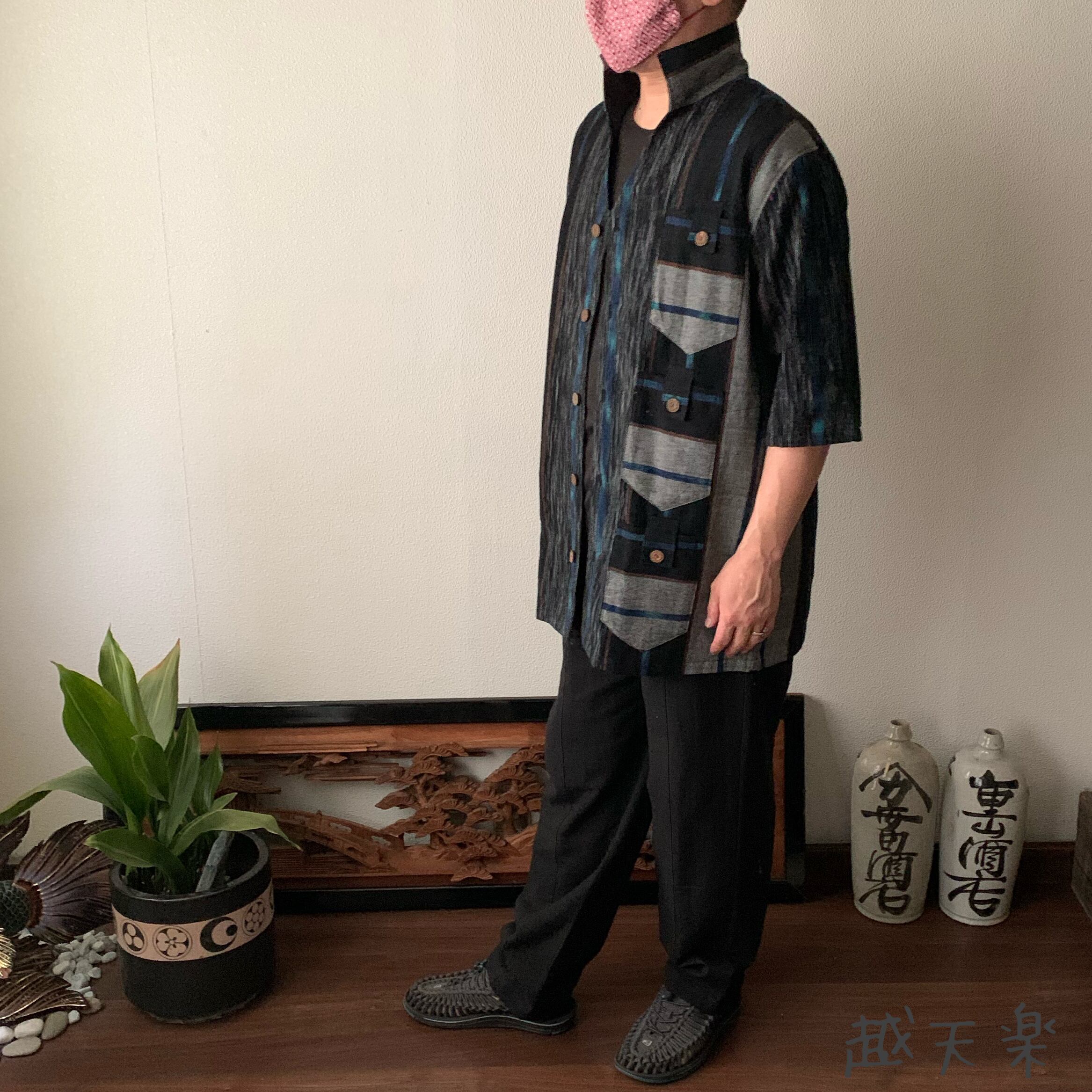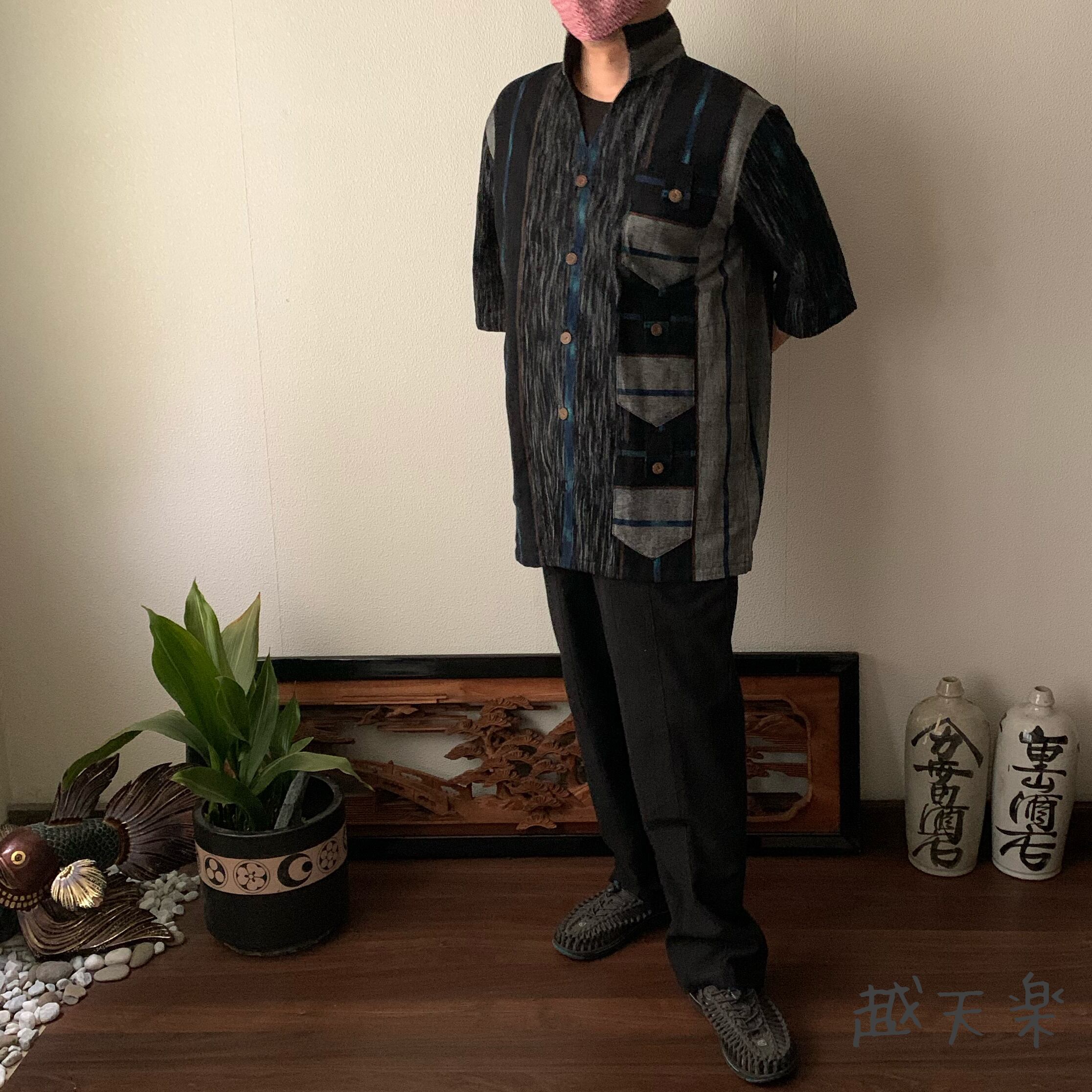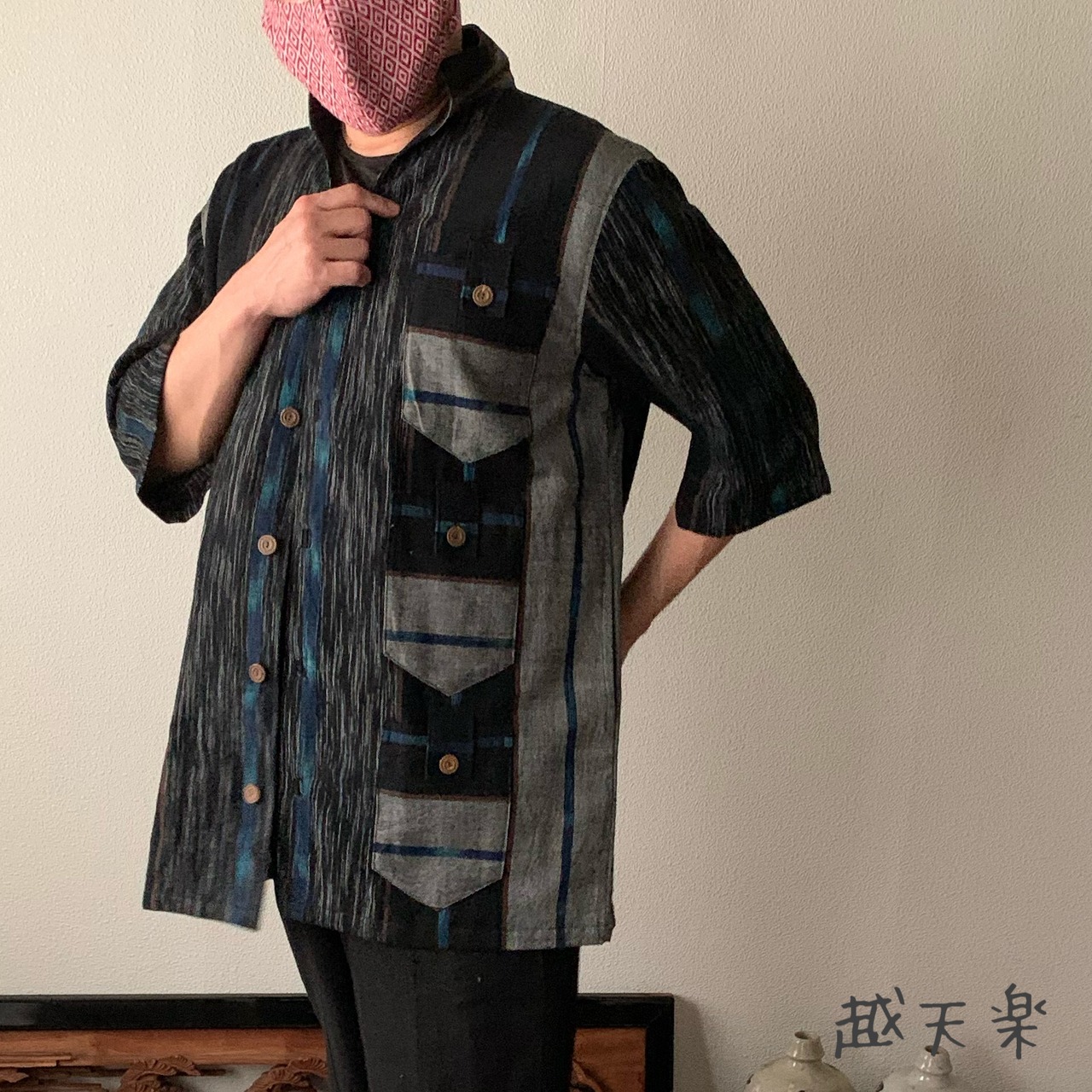 越天楽で男性に好まれる、シンプルな形だけど遊びを入れているメンズラインの手織り綿前開き半袖ブラウスです。