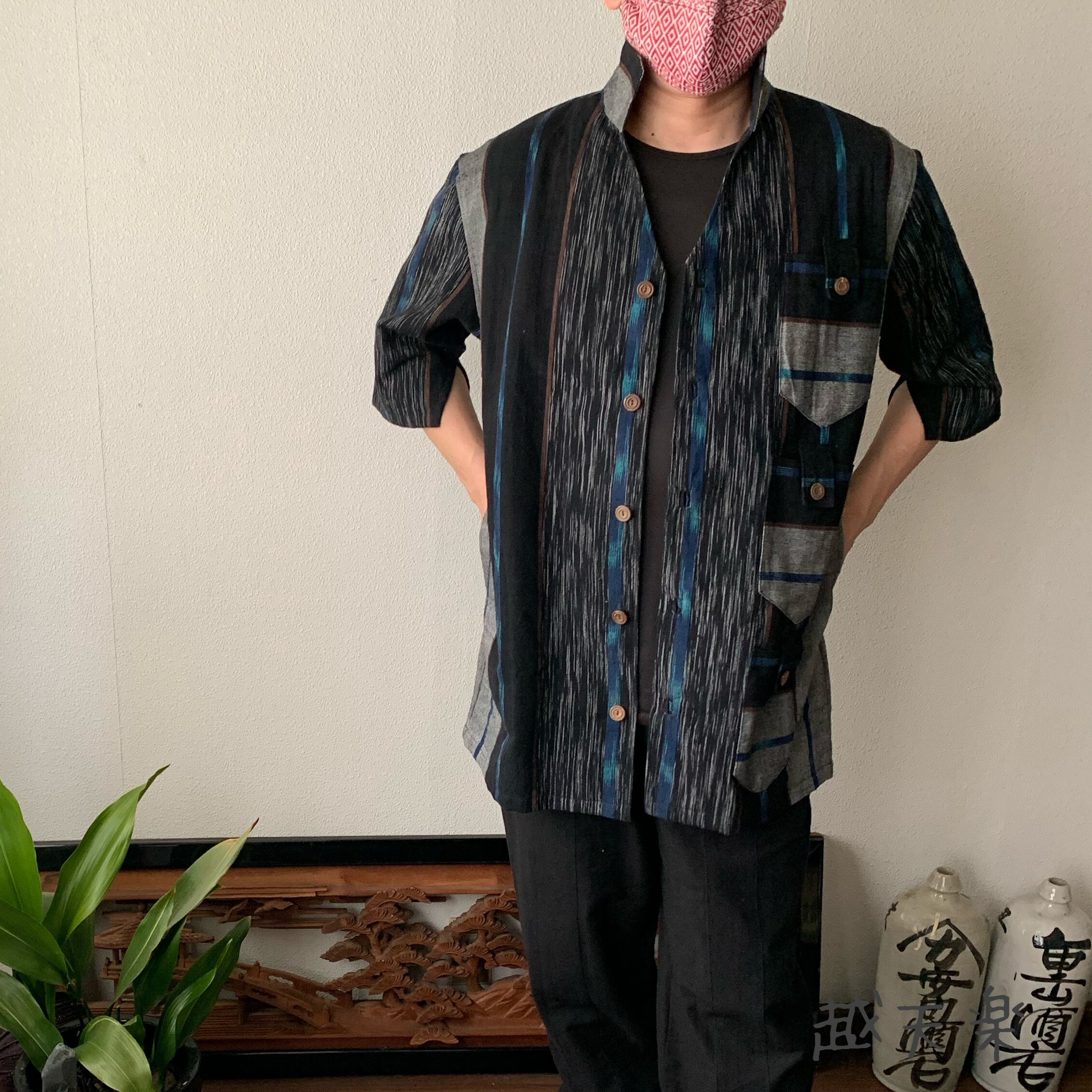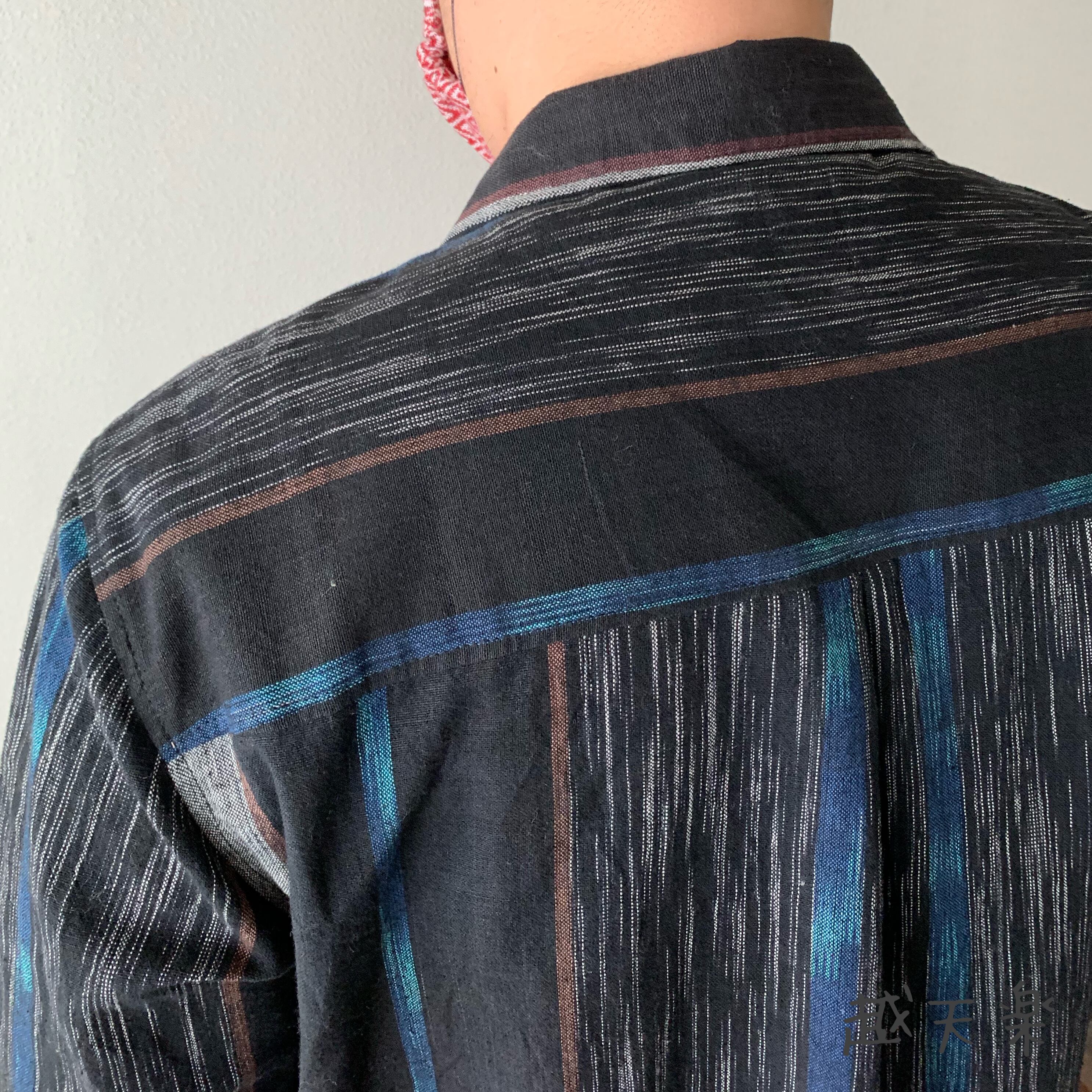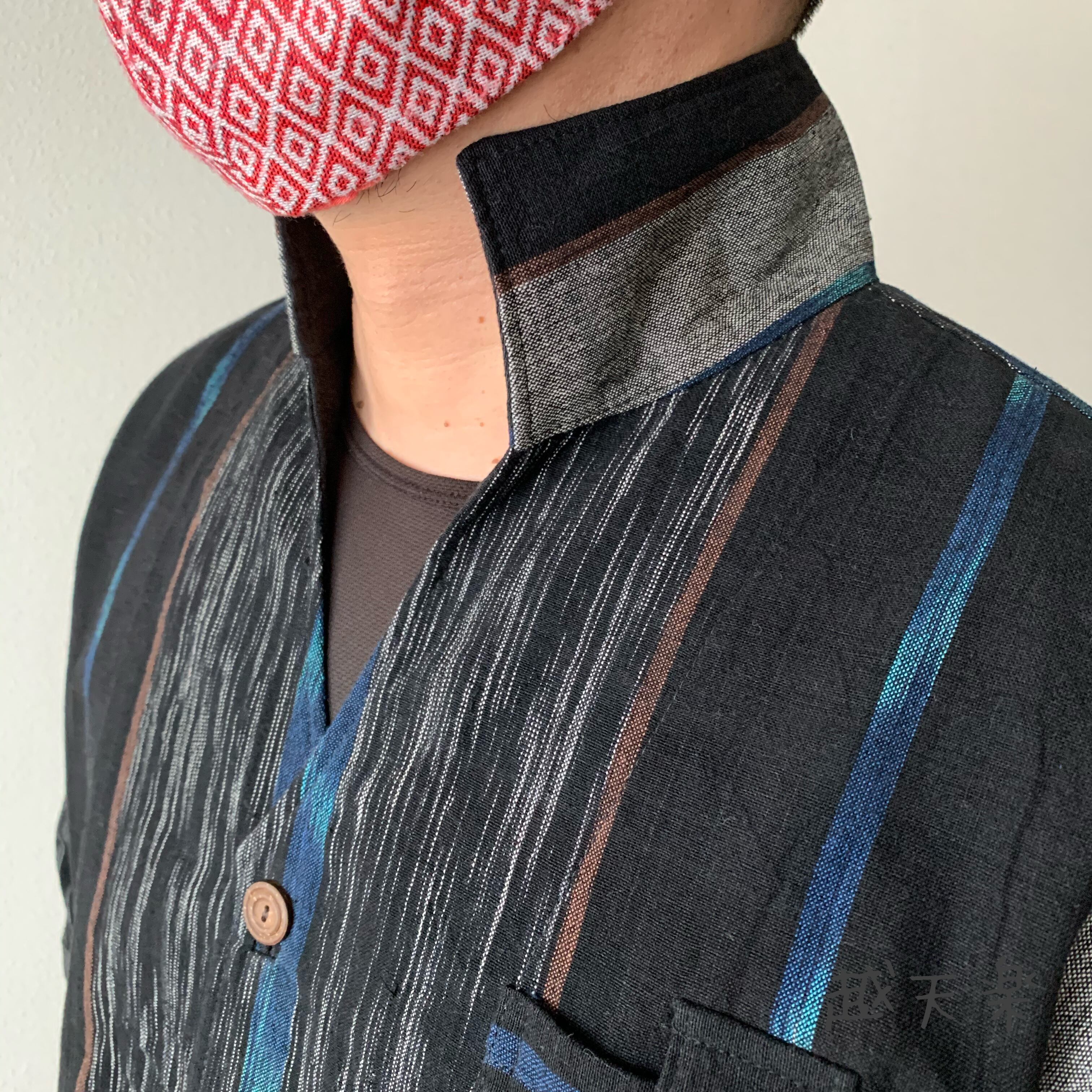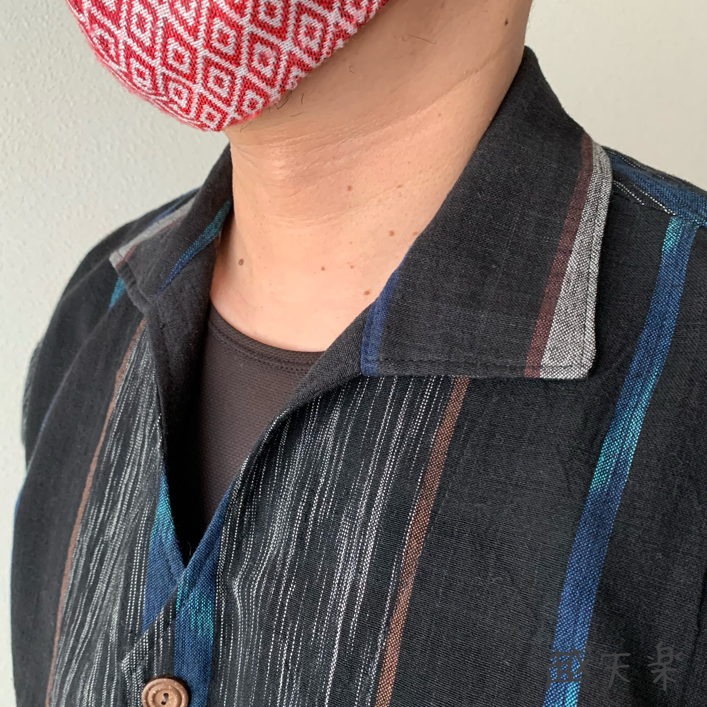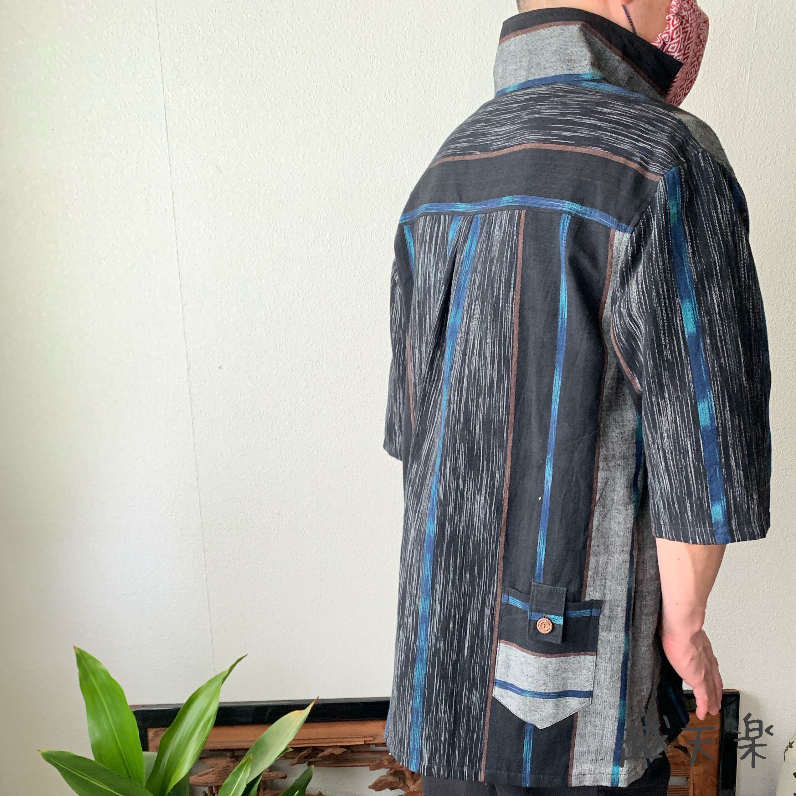 越天楽で男性に好まれる、シンプルな形だけど遊びを入れているメンズラインの手織り綿前開き半袖ブラウスです。