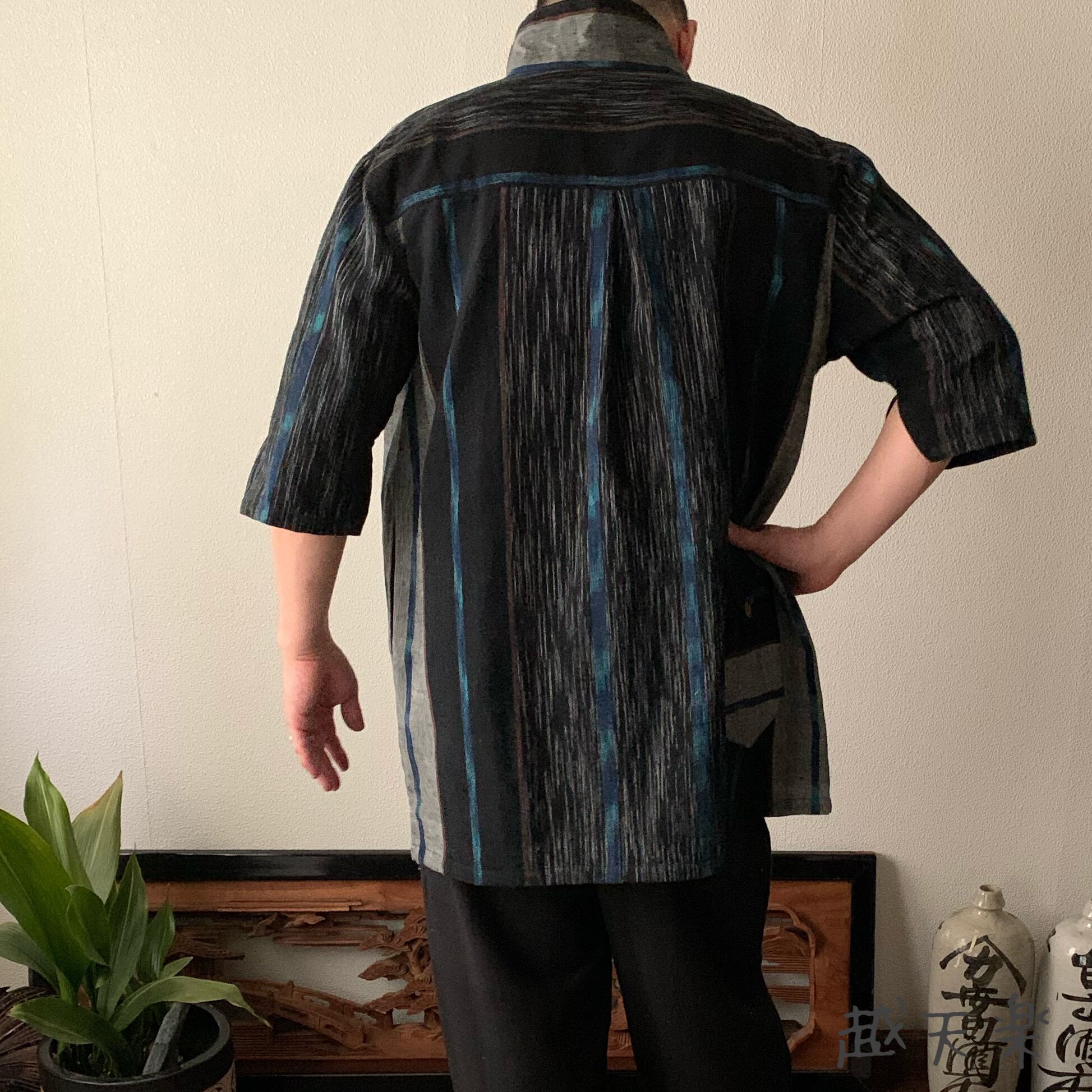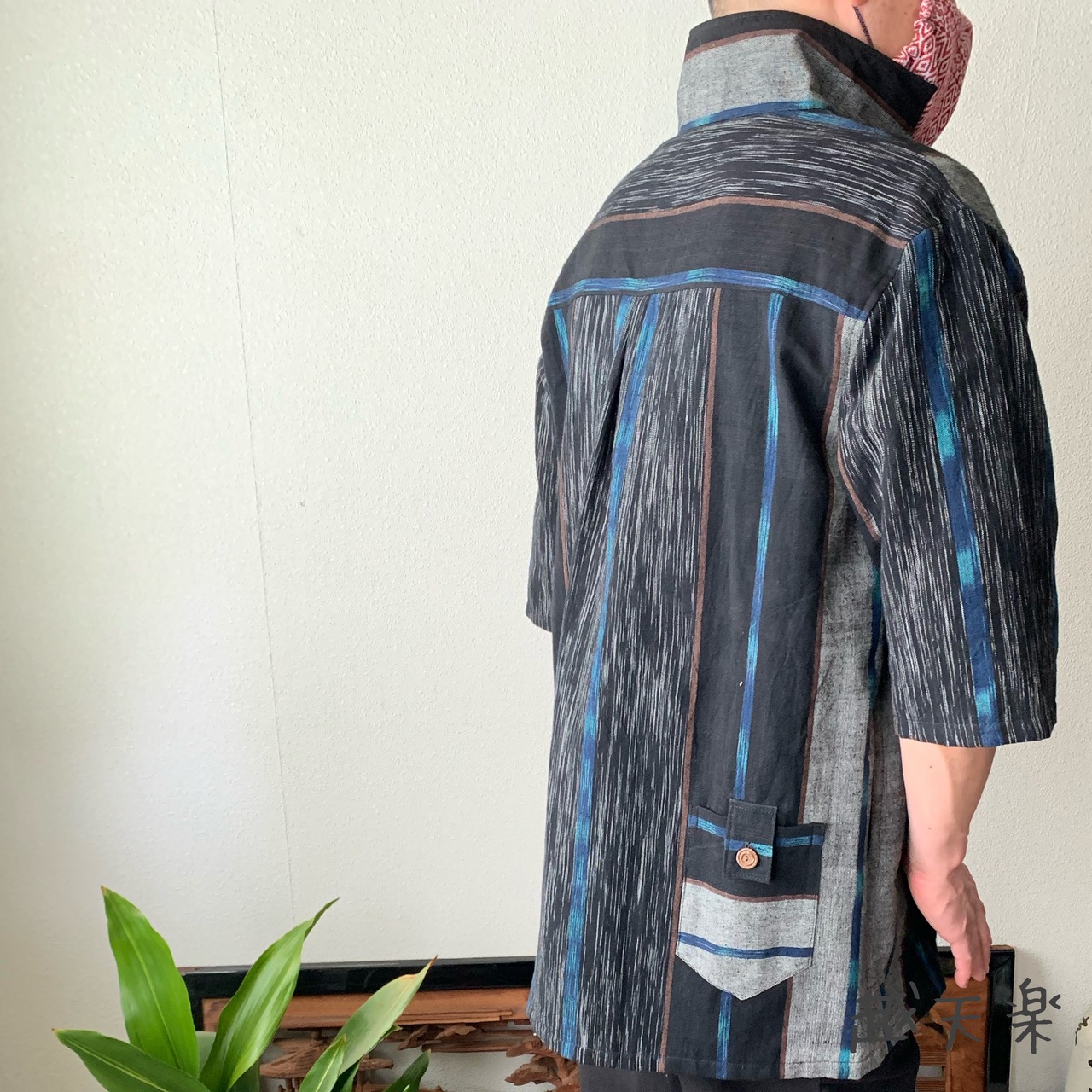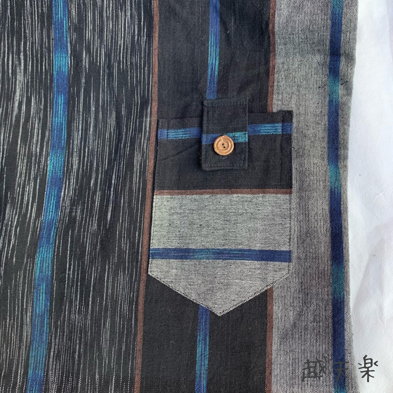 前身頃ワンサイド縦パッチポケット前開き手織り綿半袖メンズブラウス 青黒絣