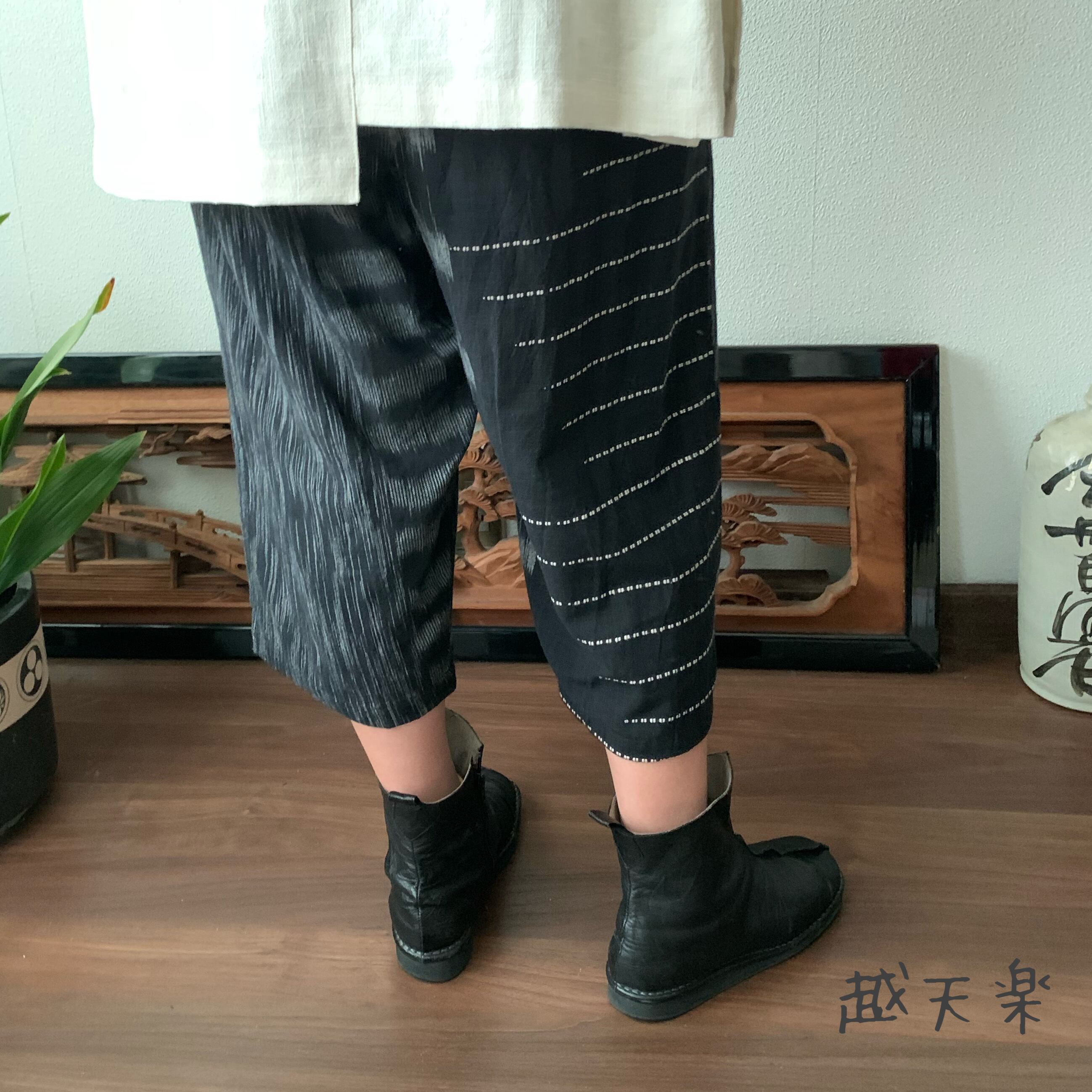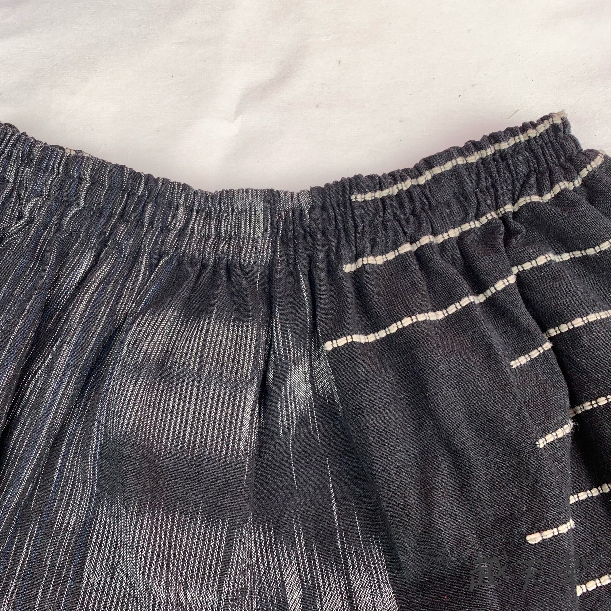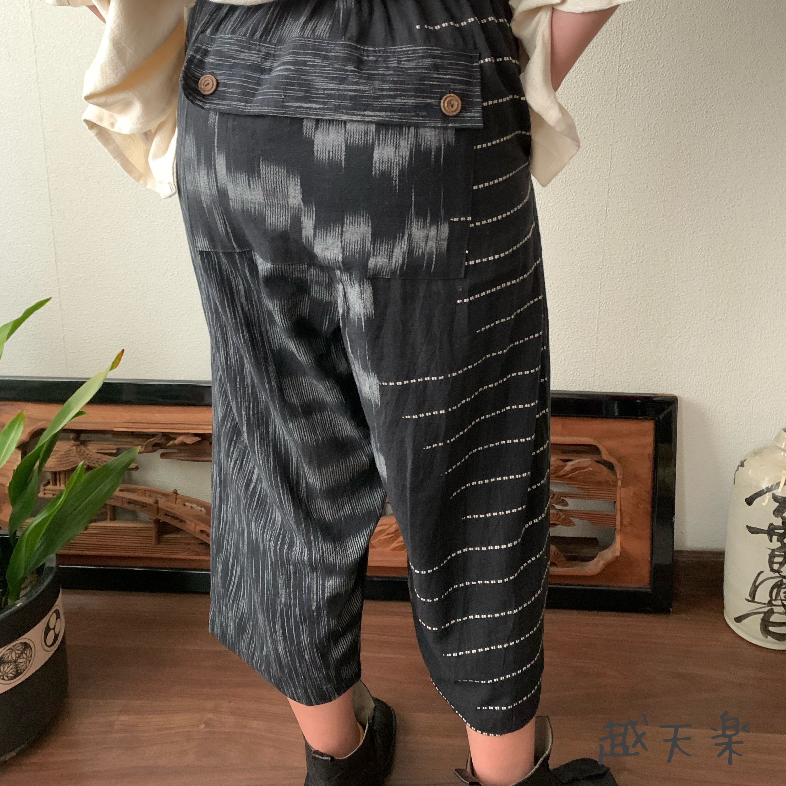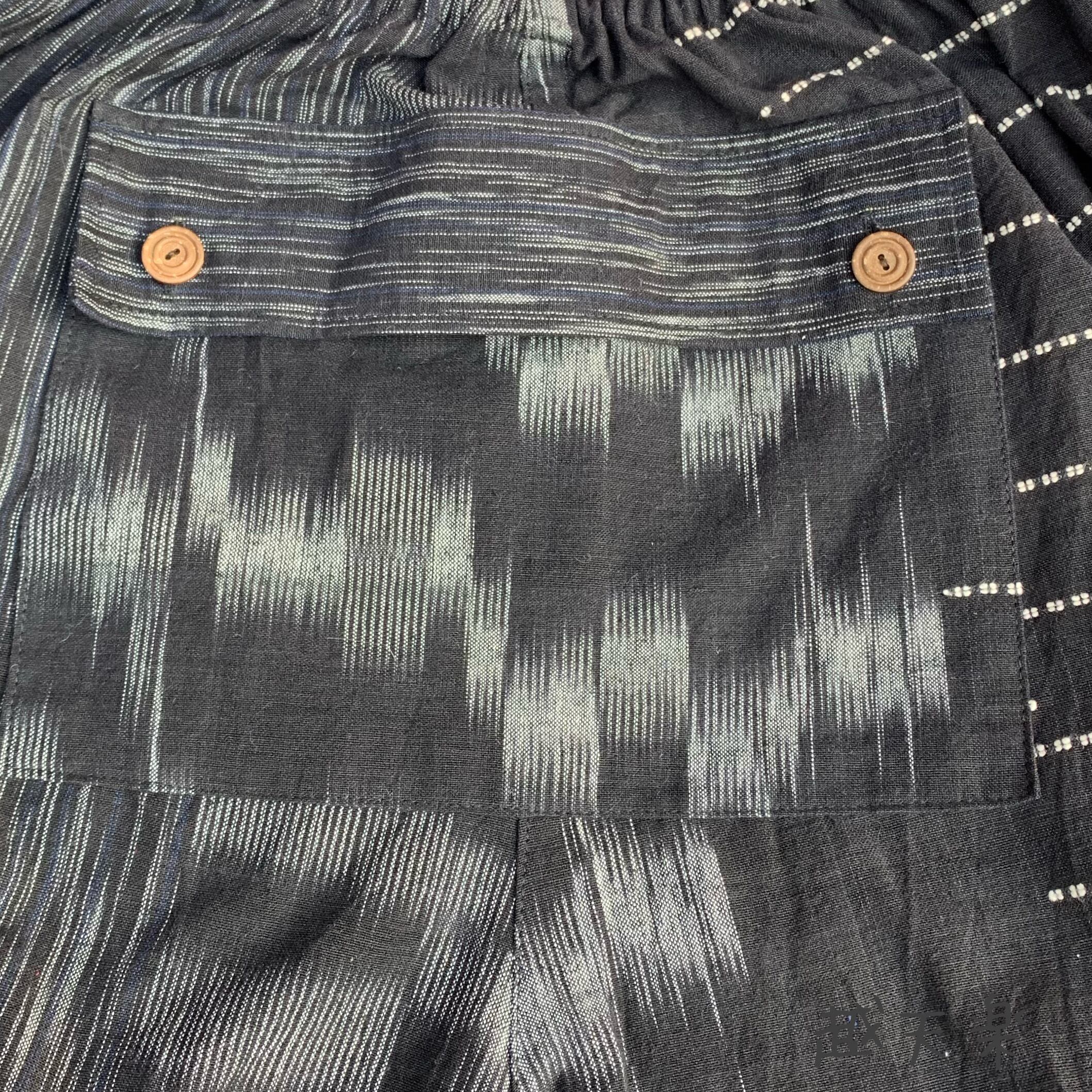 ヒップビックポケット手織り綿サルエルパンツ 黒グレイ絣