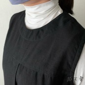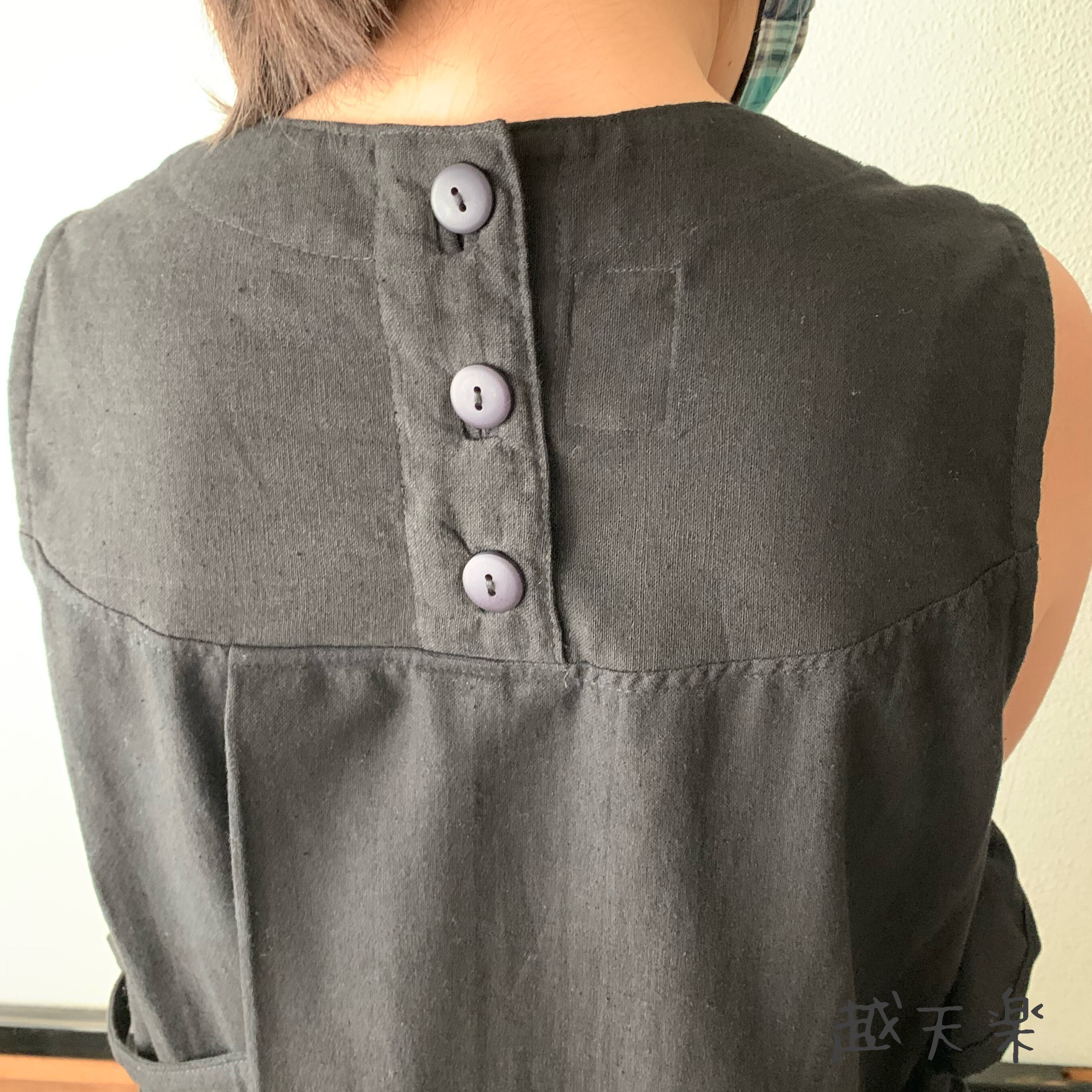 また、襟は丸首のかぶりタイプになりますが後ろ部分のアクセントにもなるボタンをつけていますので脱ぎ着しやすく、後ろ首がすっきり見えるデザインになっています。