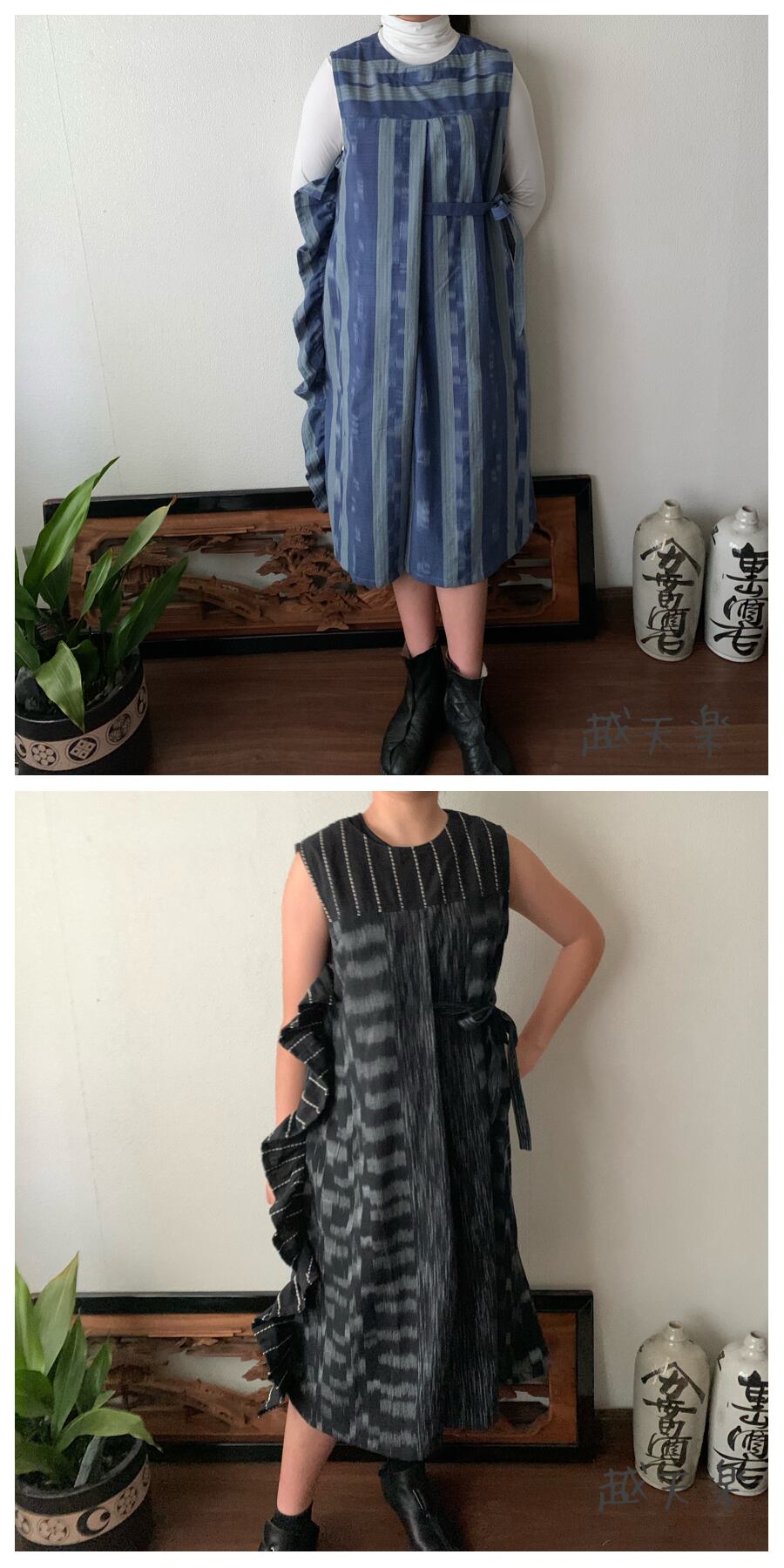 ワンサイドには上から下までたっぷりのフリルを、もうワンサイドには大きいプリーツに自分で調整して結べる紐リボンをつけ、ハイウエストで切り替え部分にはギャザーを、と遊び心満載の手織り綿ワンピースです。