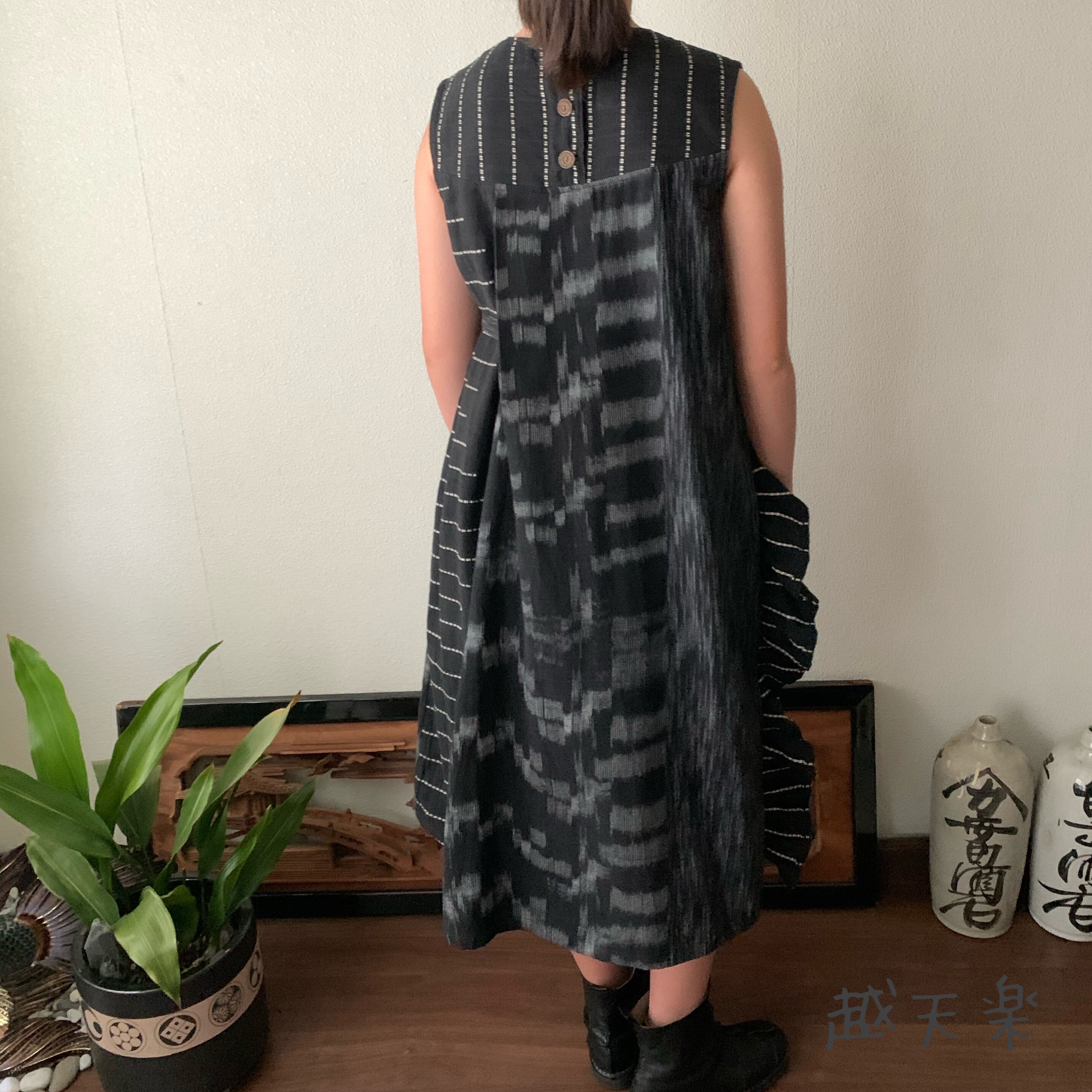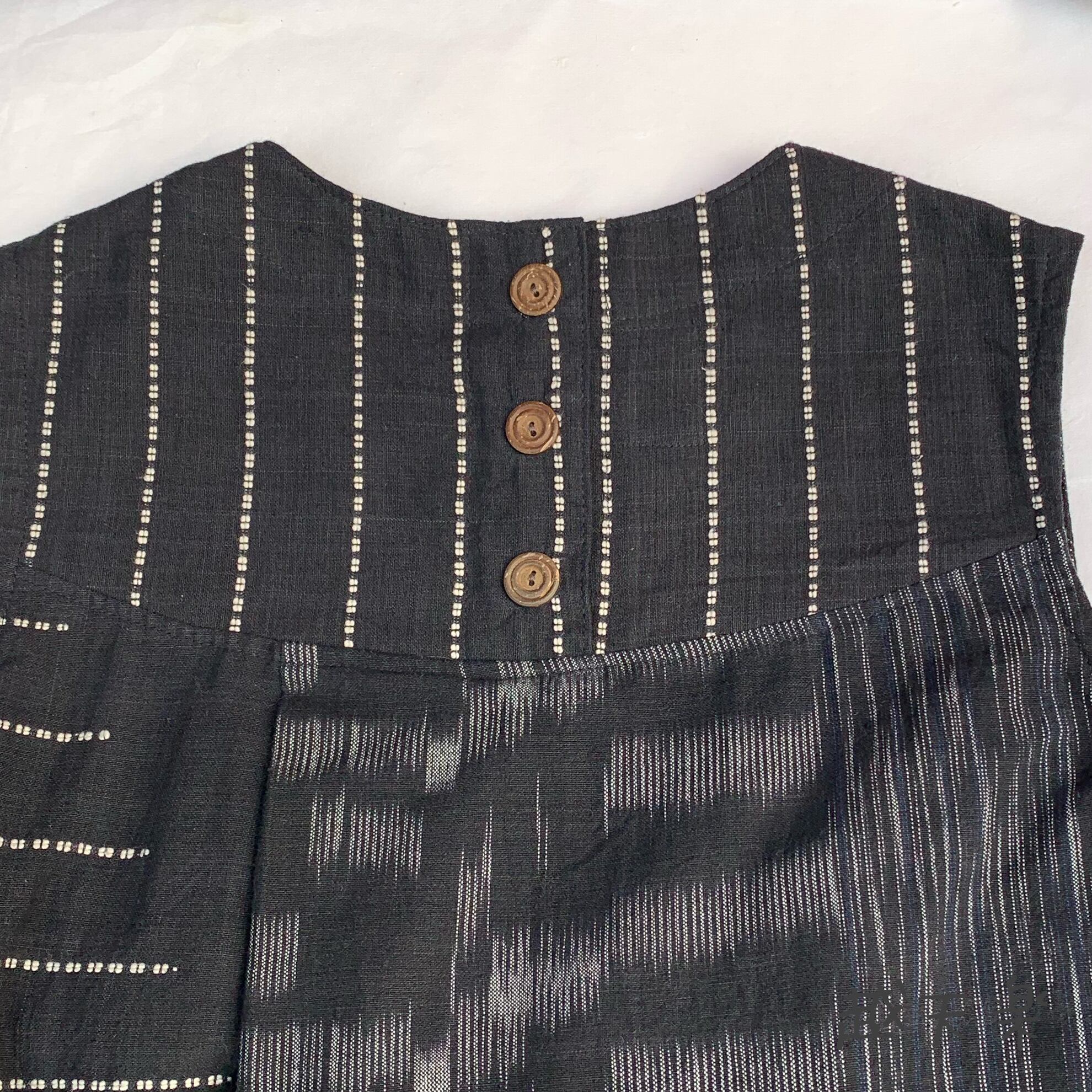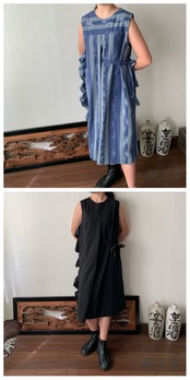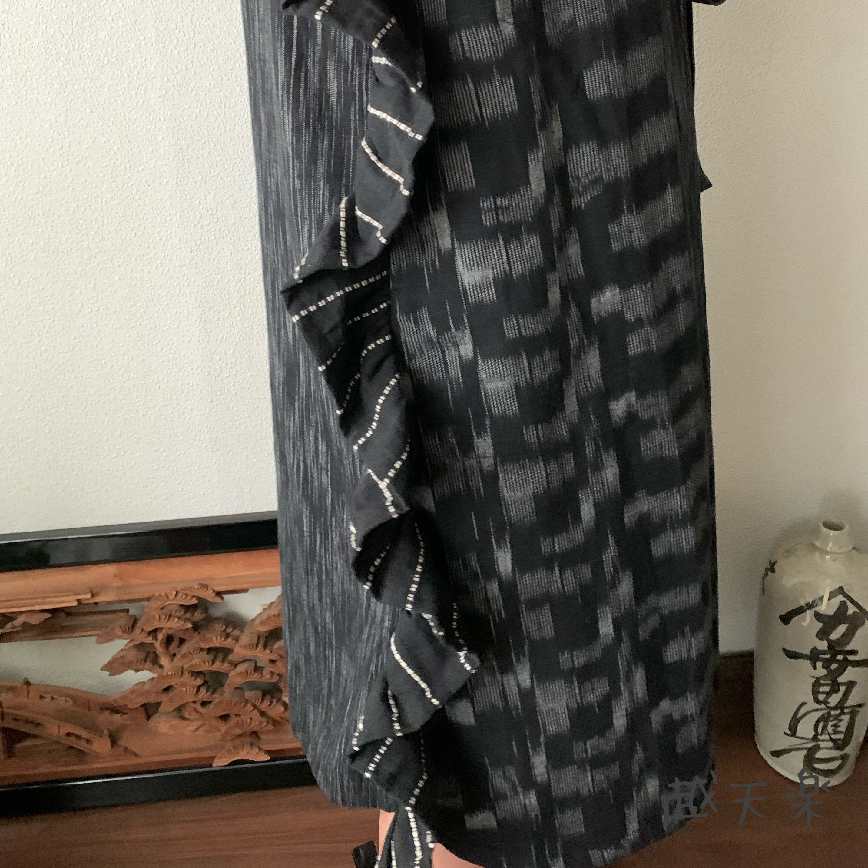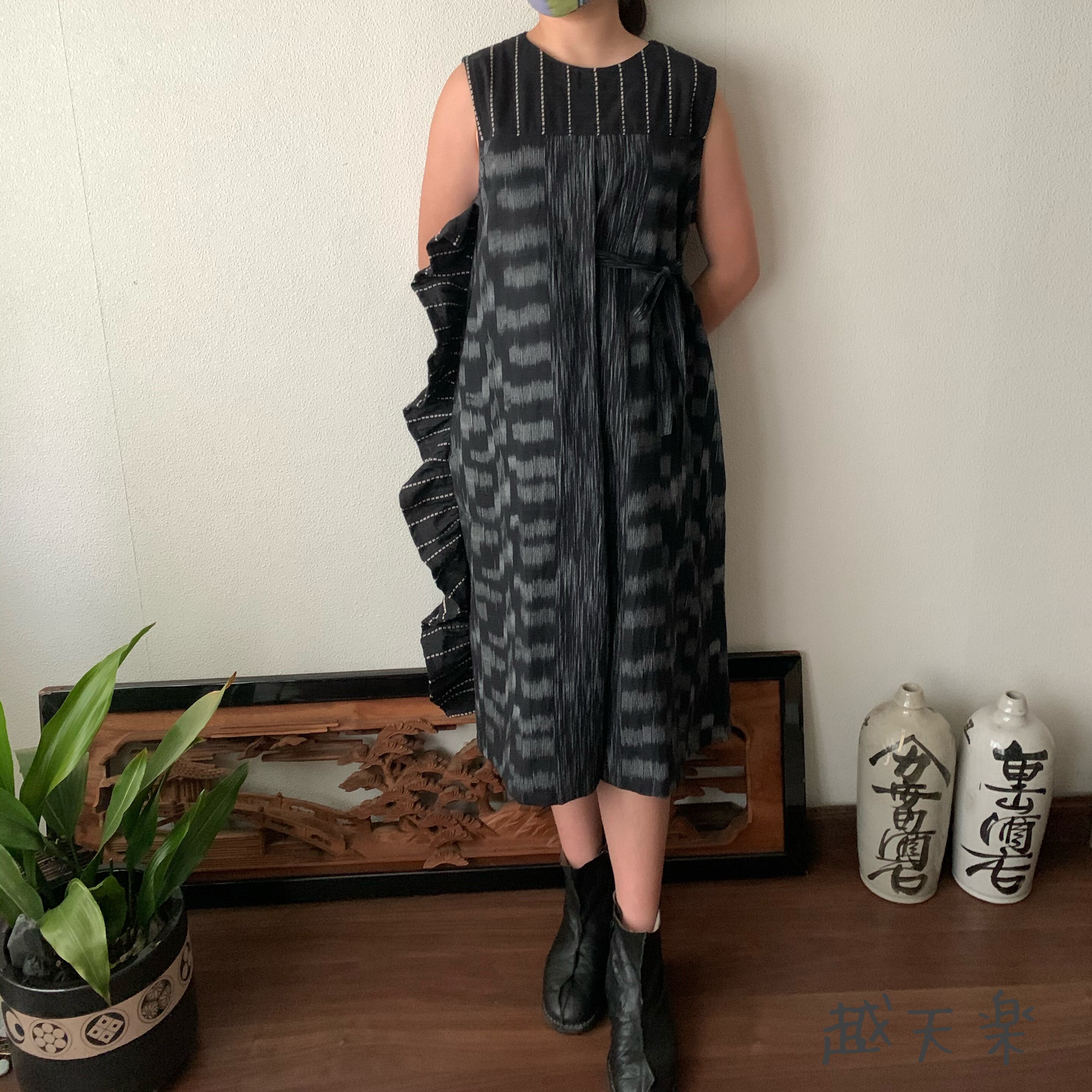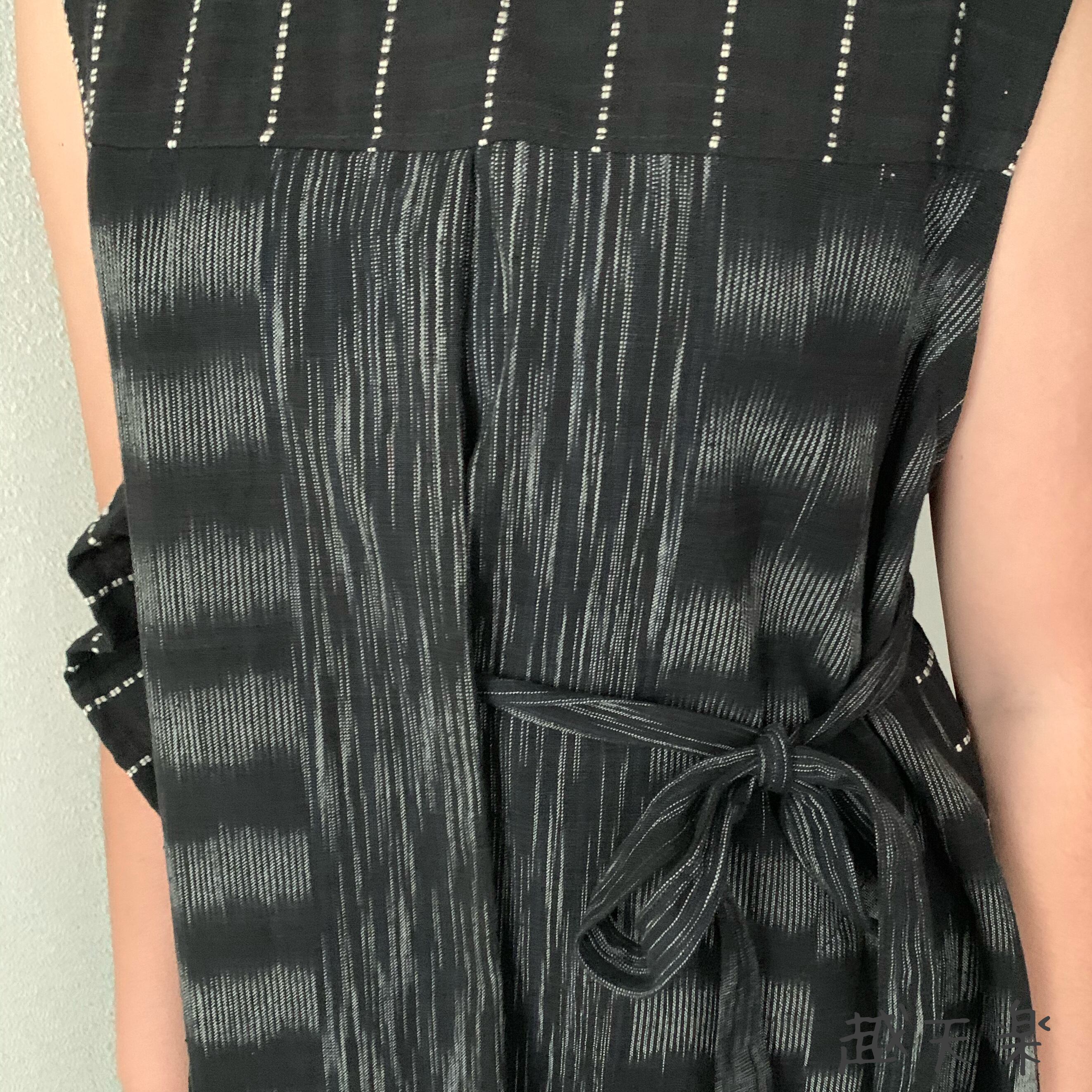 ワンサイドには上から下までたっぷりのフリルを、もうワンサイドには大きいプリーツに自分で調整して結べる紐リボンをつけ、ハイウエストで切り替え部分にはギャザーを、と遊び心満載の手織り綿ワンピースです。