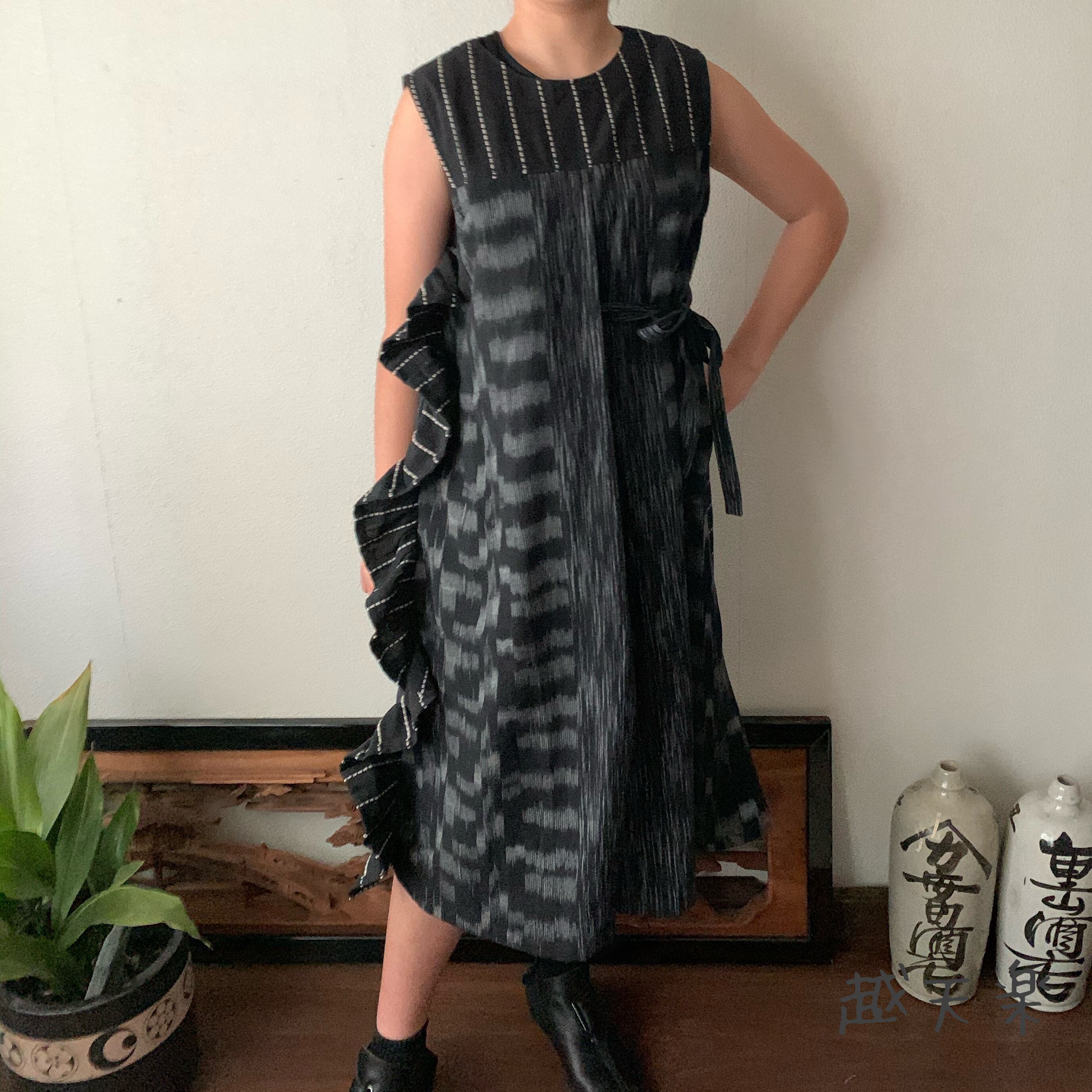 『サイドフリルとサイドリボンとハイウエストの贅沢手織り綿ワンピース 全方位遊び心のアクセント満載なワンピース』