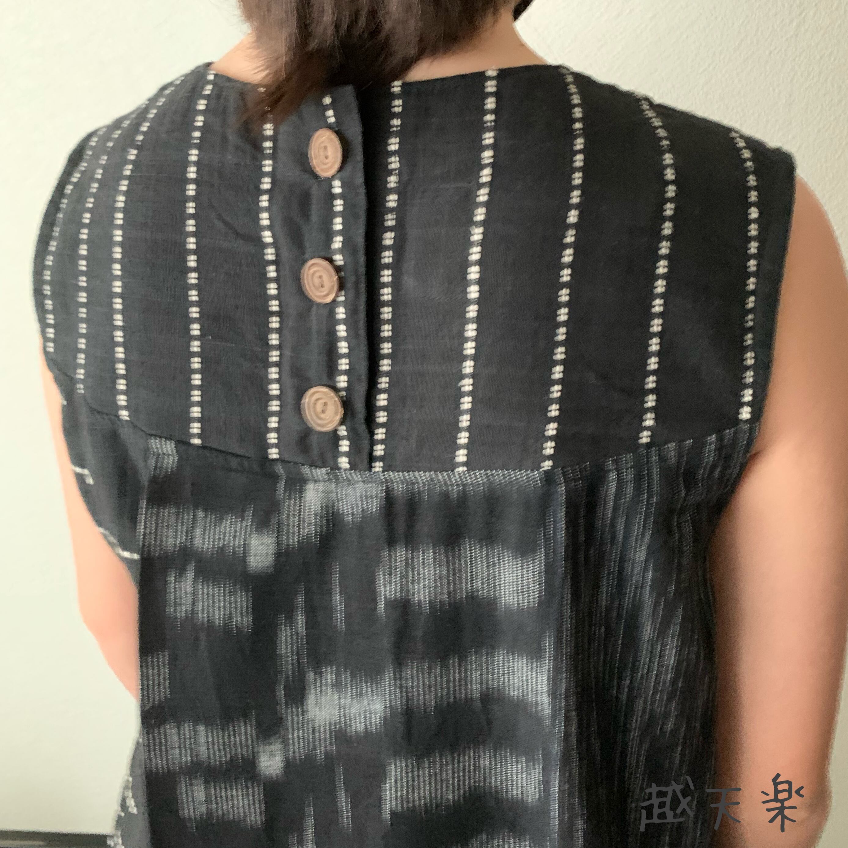 また、襟は丸首のかぶりタイプになりますが後ろ部分のアクセントにもなるボタンをつけていますので脱ぎ着しやすく、後ろ首がすっきり見えるデザインになっています。