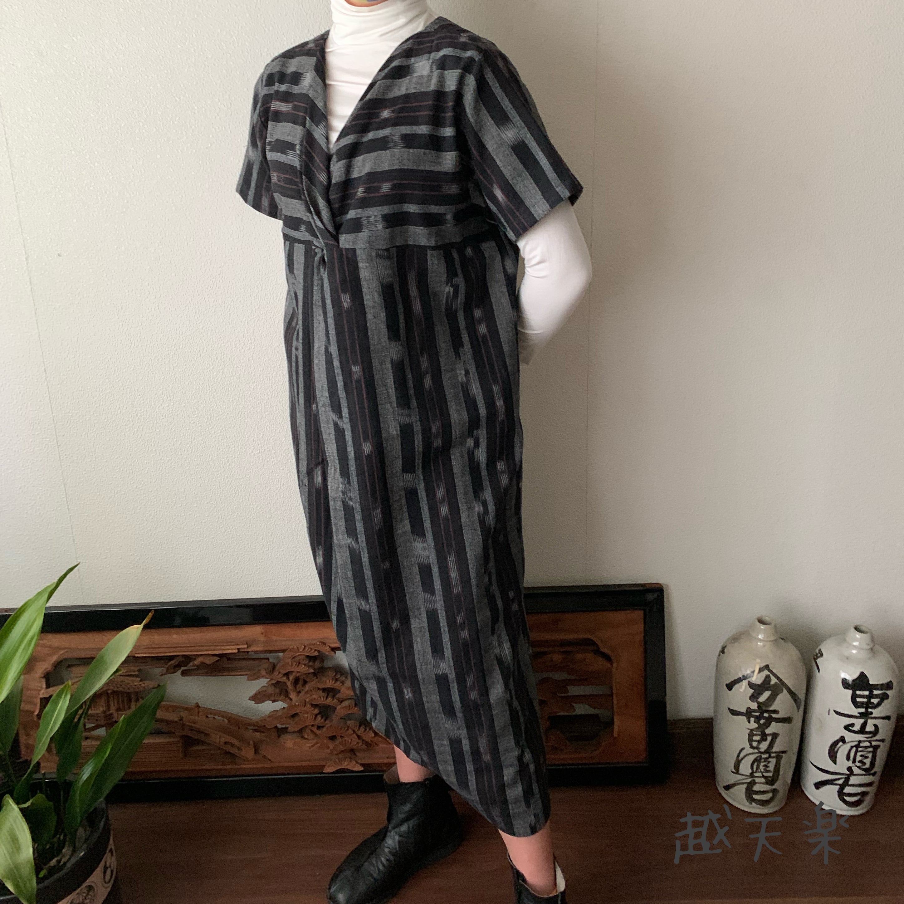 『後ろカシュクールが前後で表情を変えるハイウエスト生地切り替え手織り綿ワンピース』