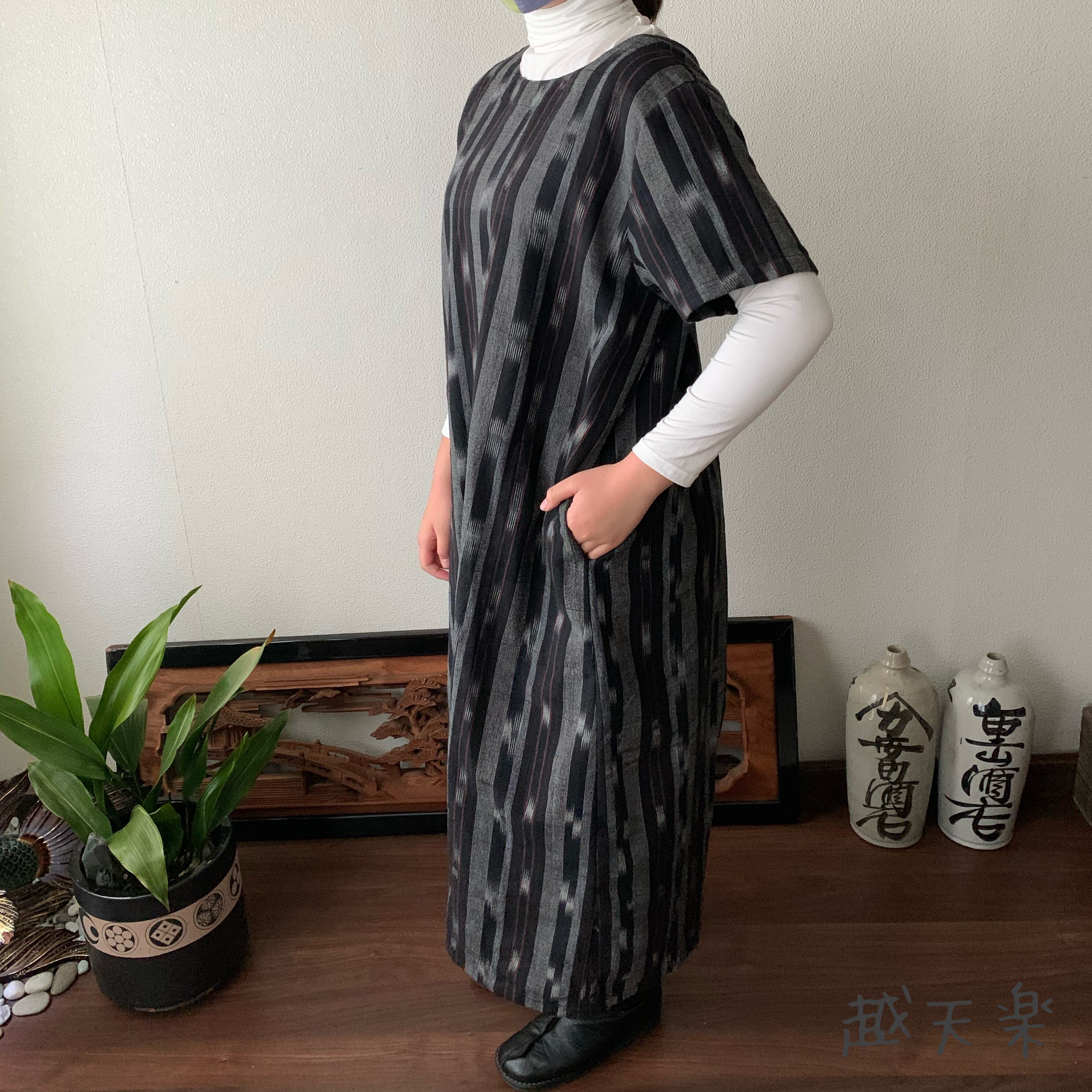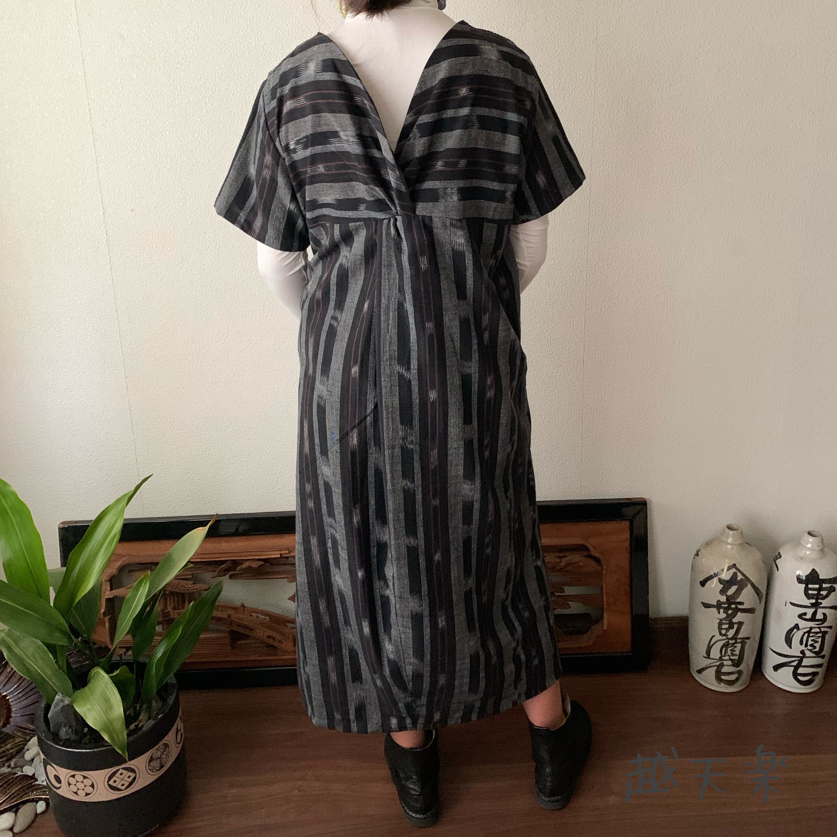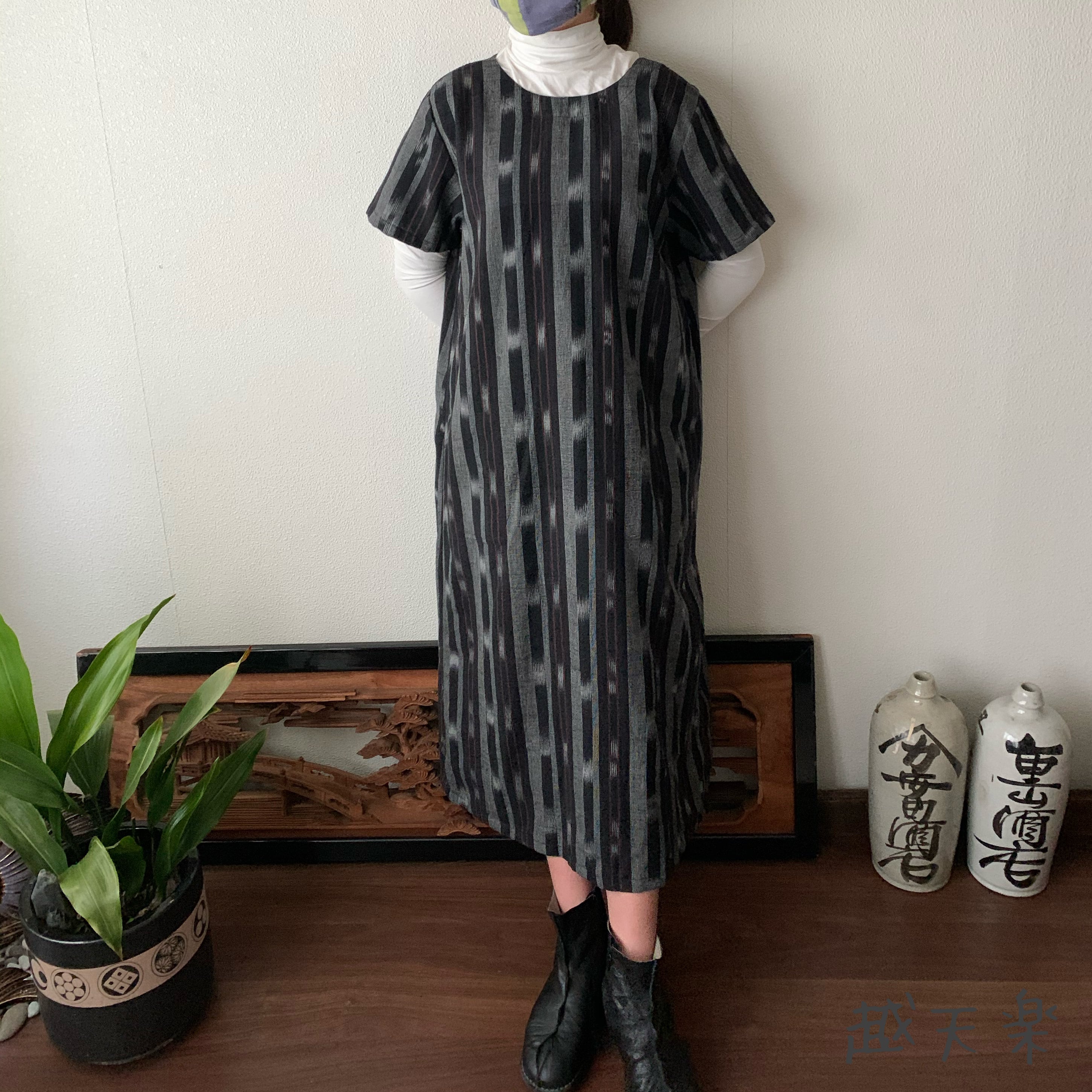 背中にあるカシュクールがポイントの、前にも後ろにも着ることのできる楽しい手織り綿のワンピースです。