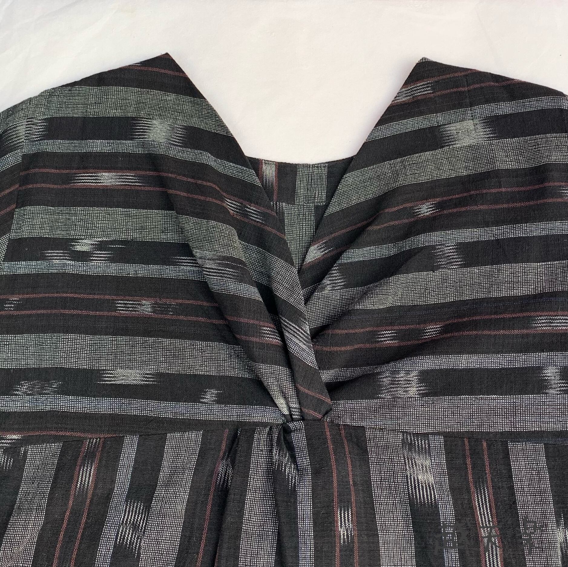 前身頃は縦ラインですっきりしていますが、後ろ身頃のカシュクール部分は高い位置で生地向きも縦横に切り替えています。