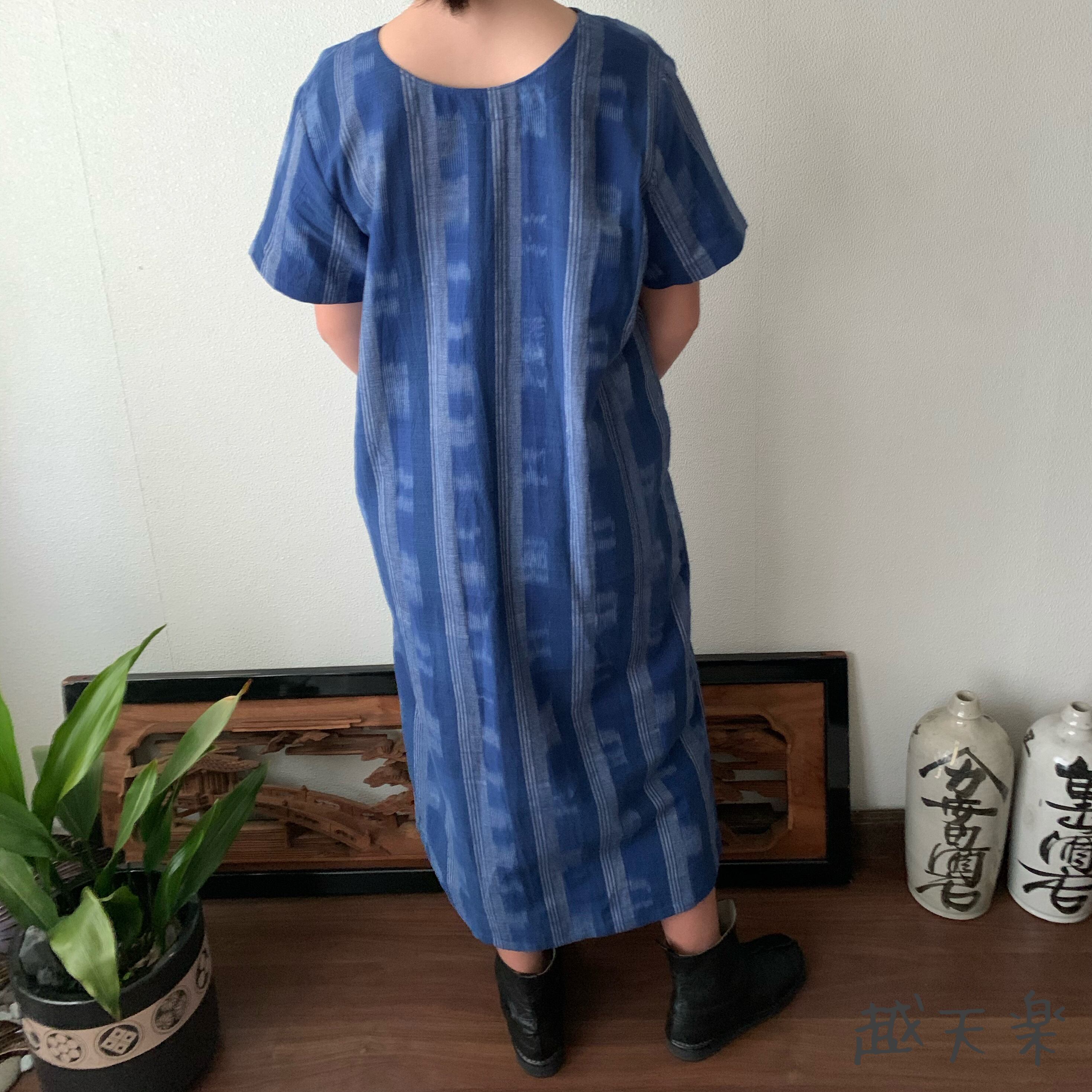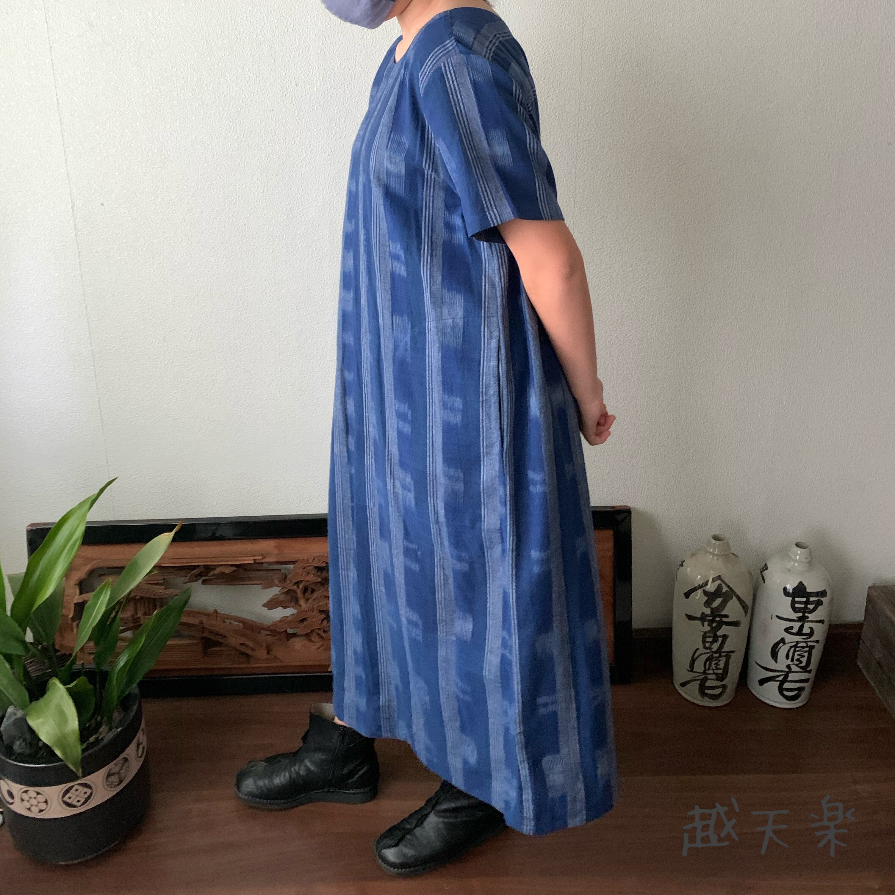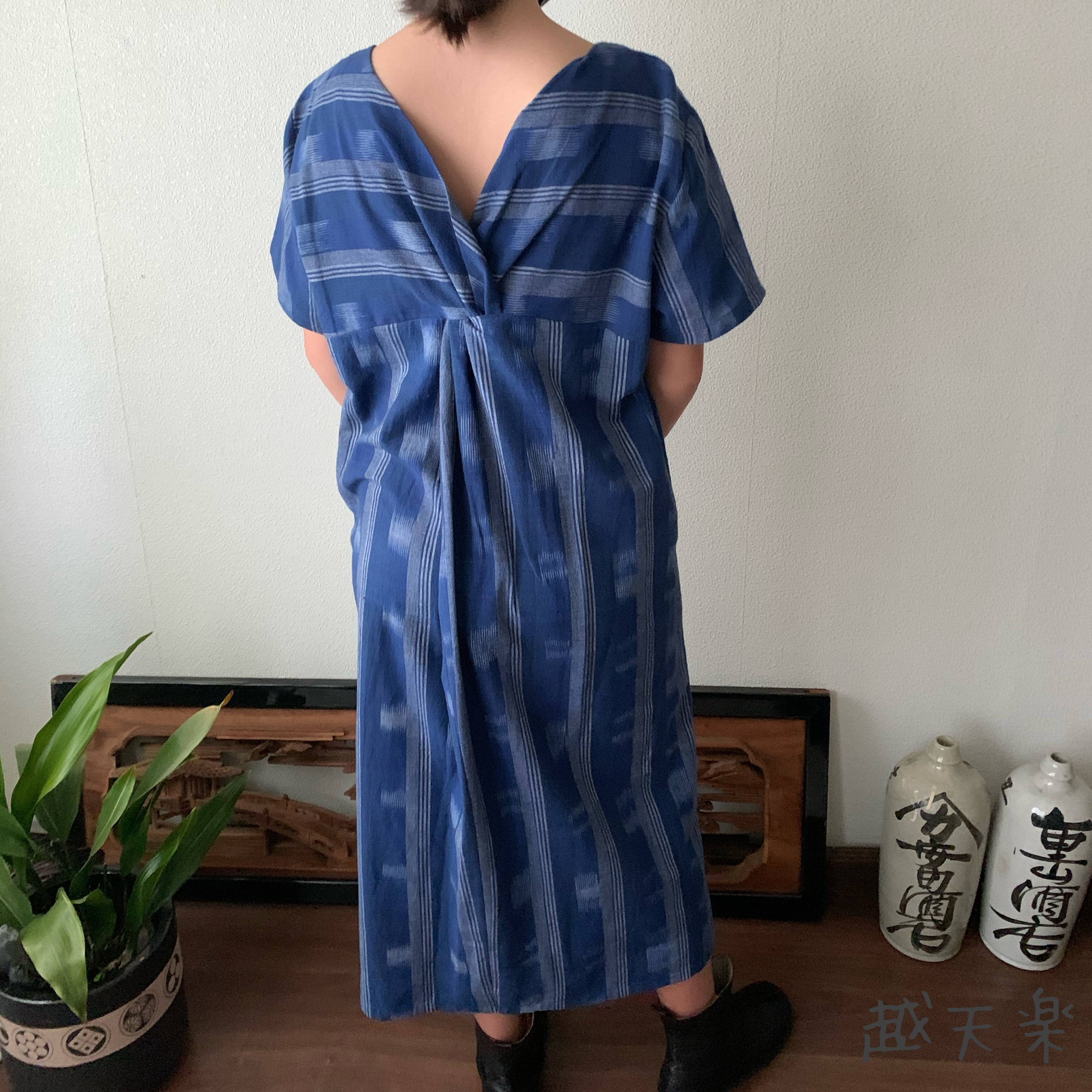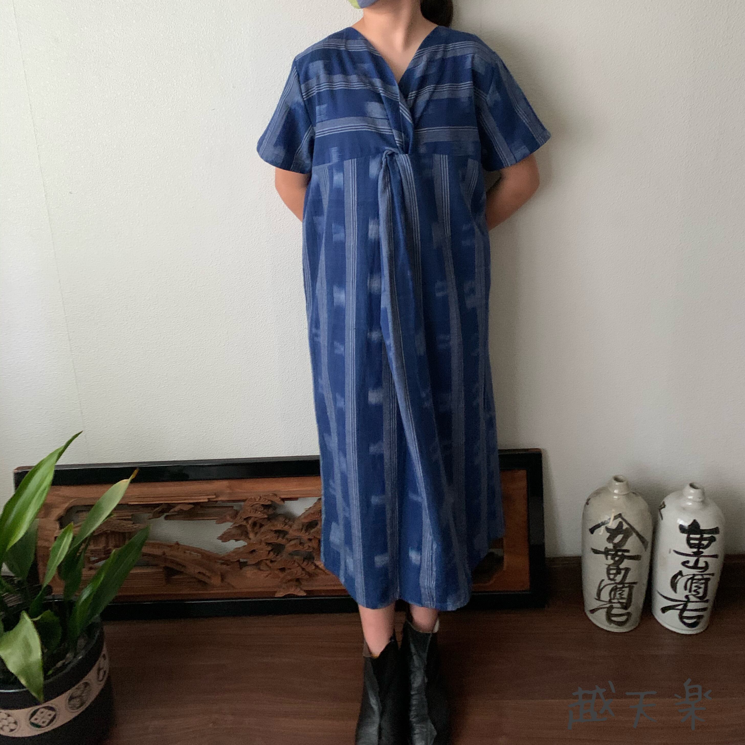 後ろカシュクールが前後で表情を変えるハイウエスト生地切り替え手織り綿ワンピース 青絣