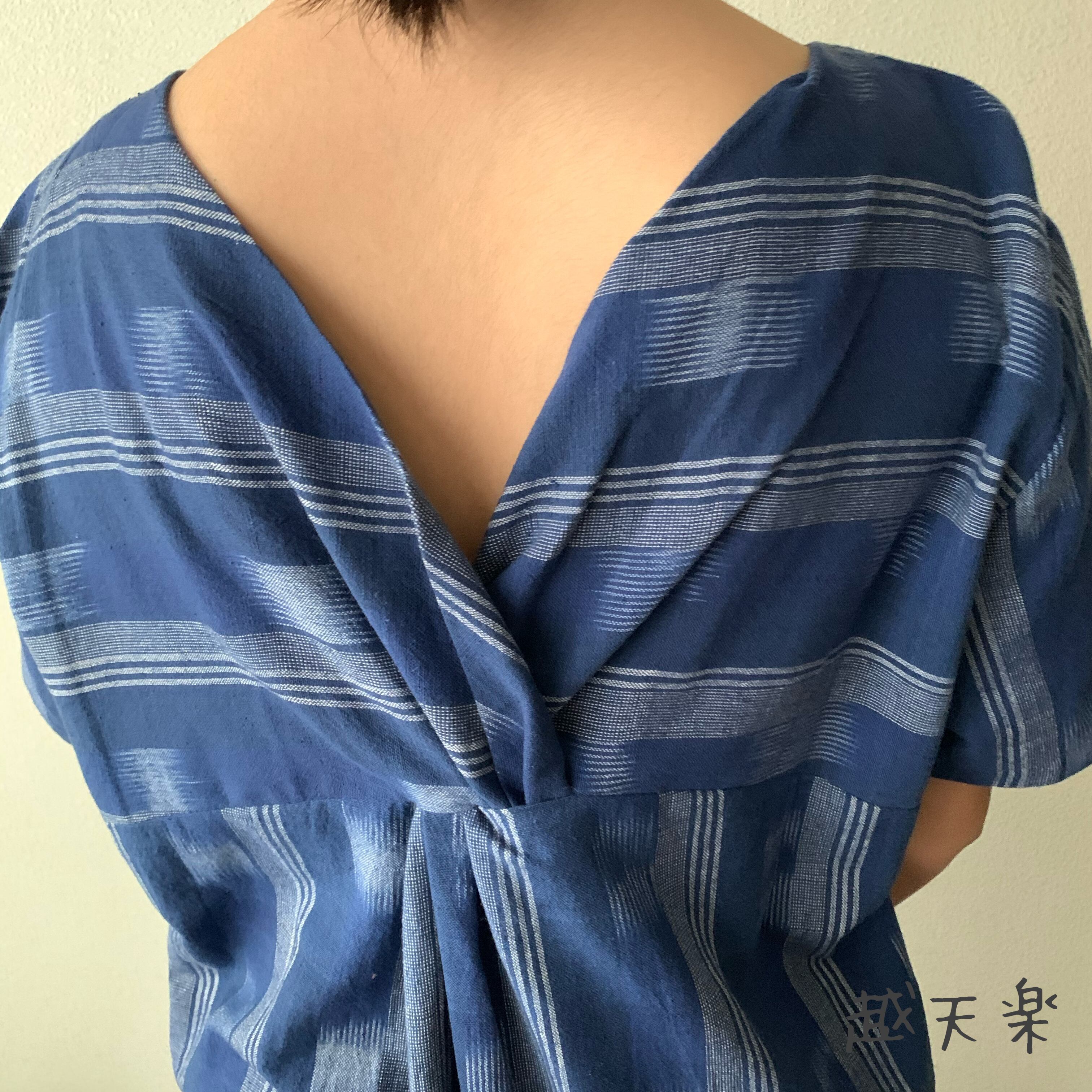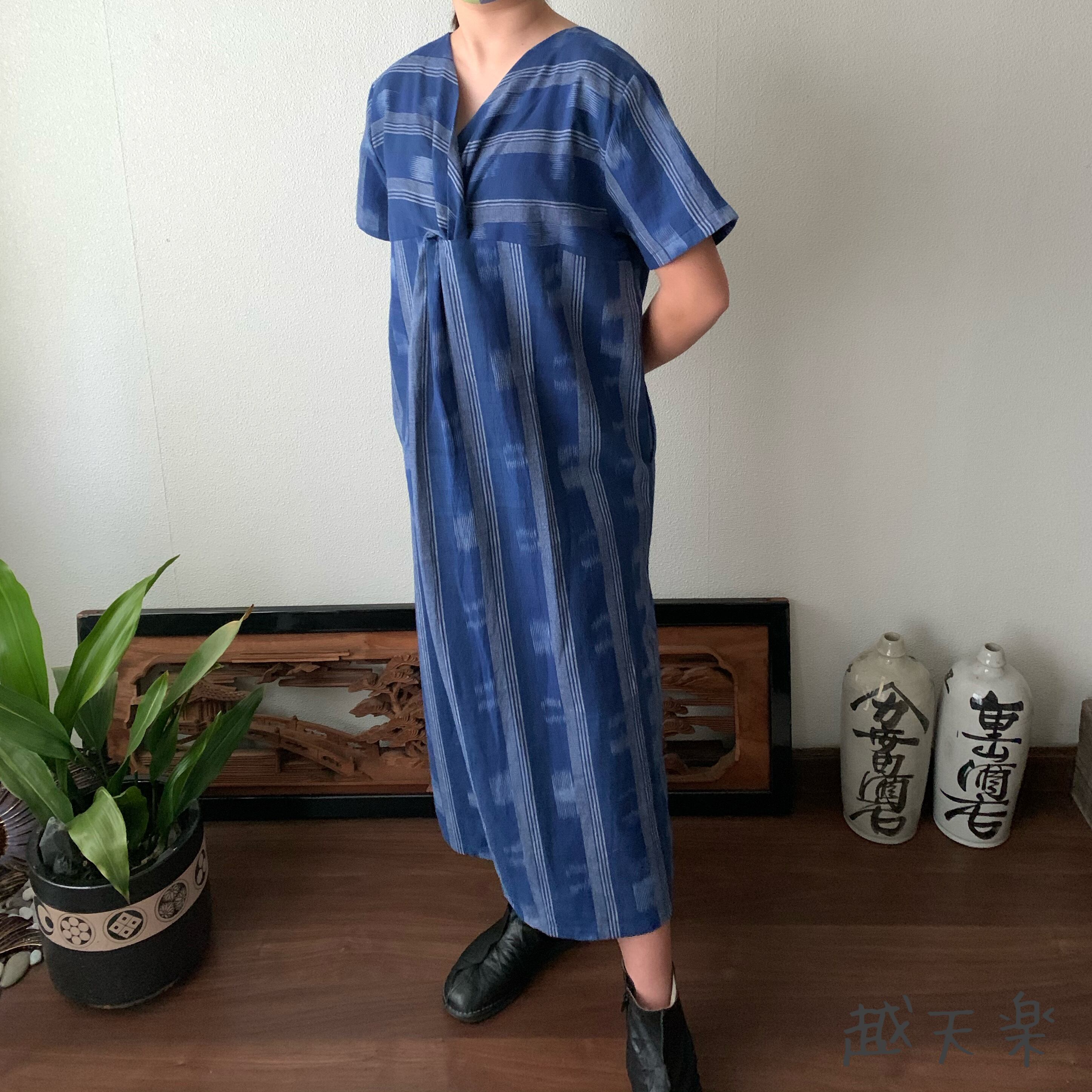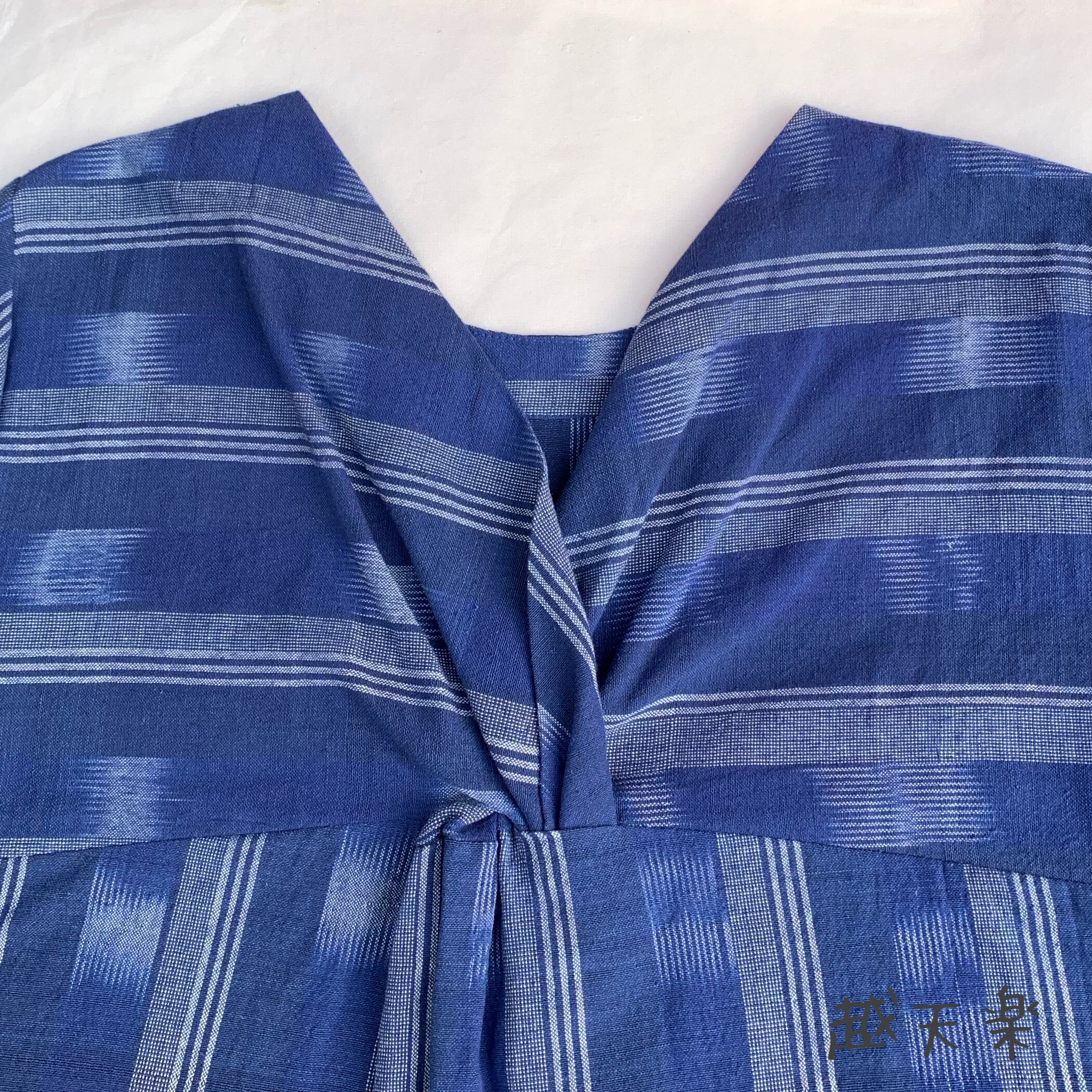 後ろカシュクールが前後で表情を変えるハイウエスト生地切り替え手織り綿ワンピース 青絣