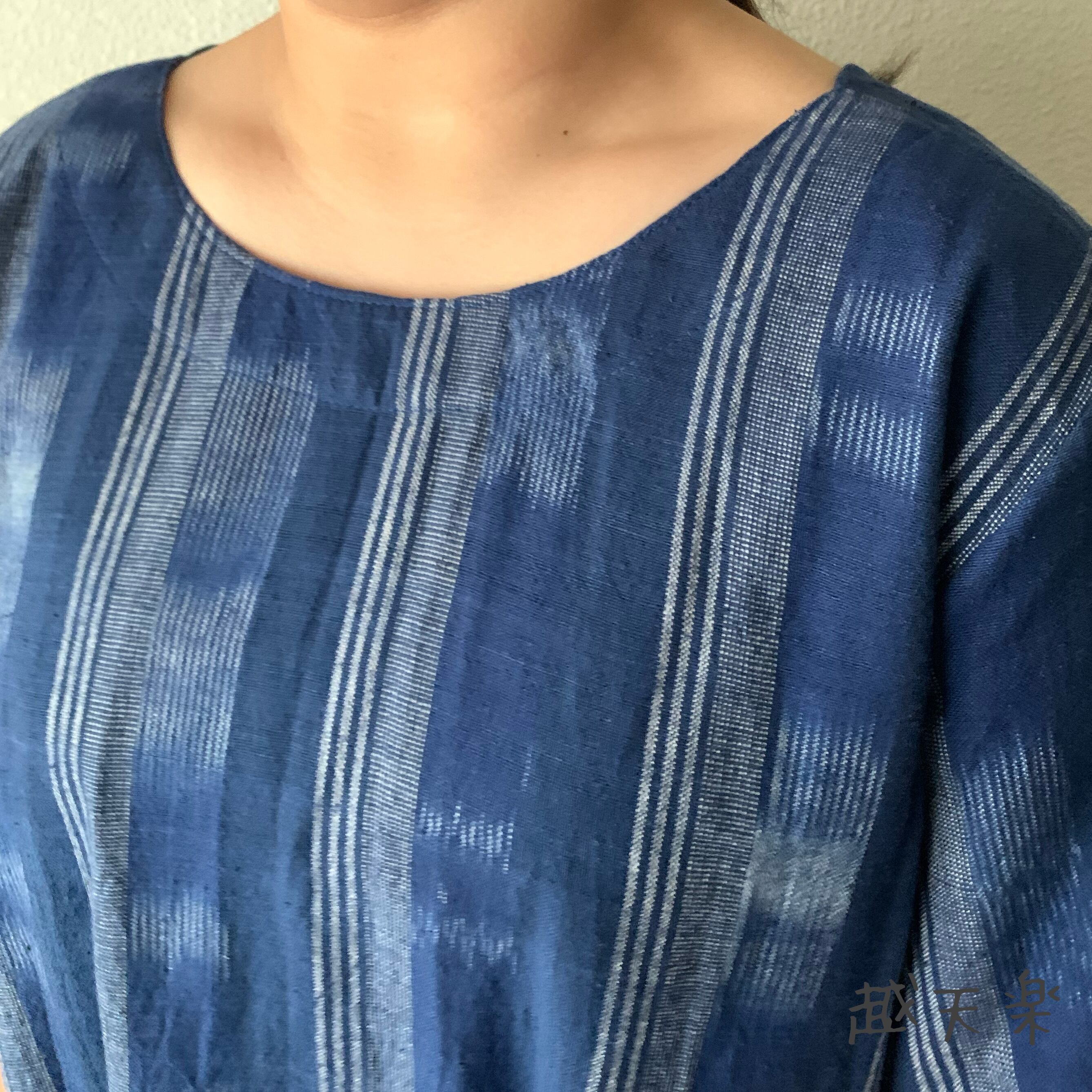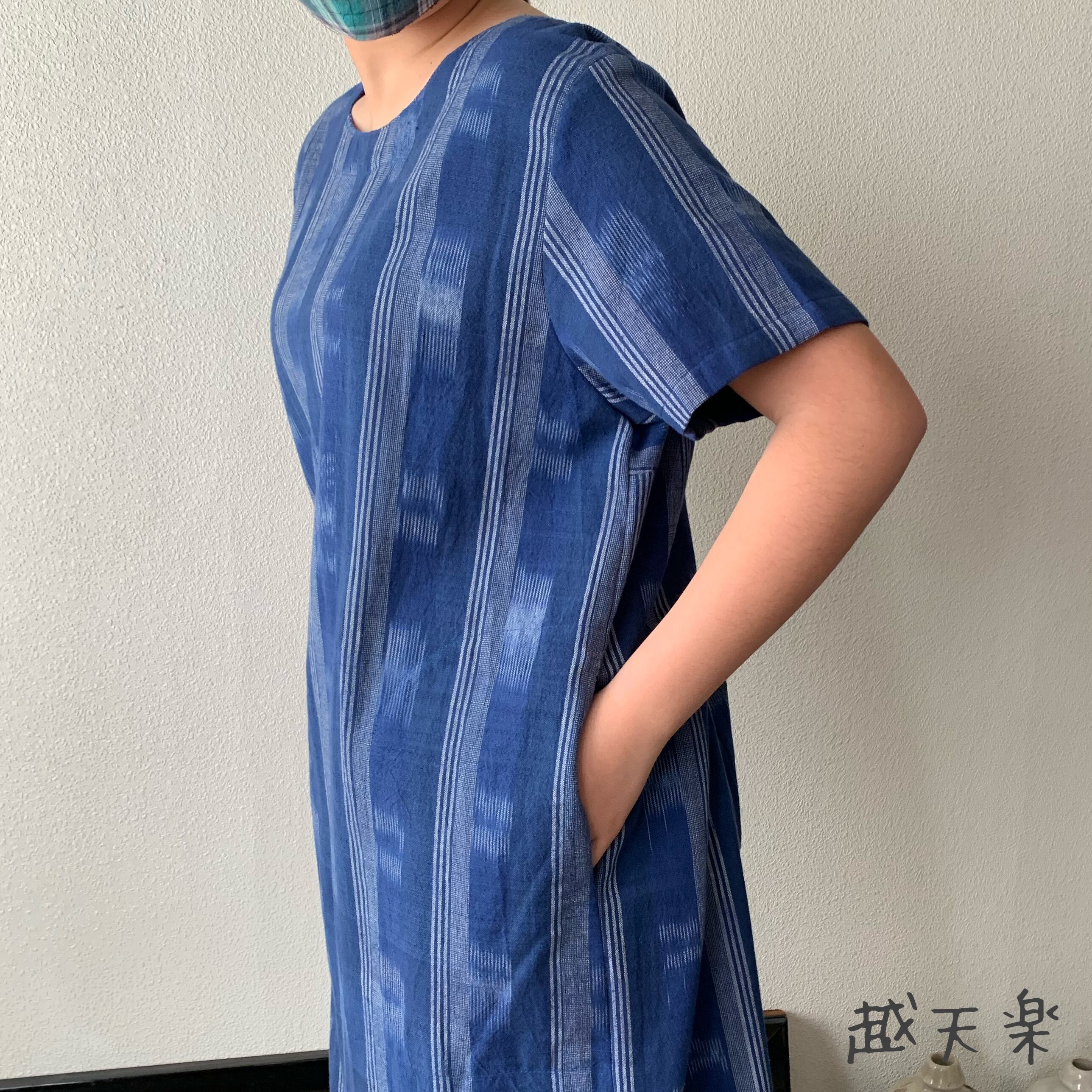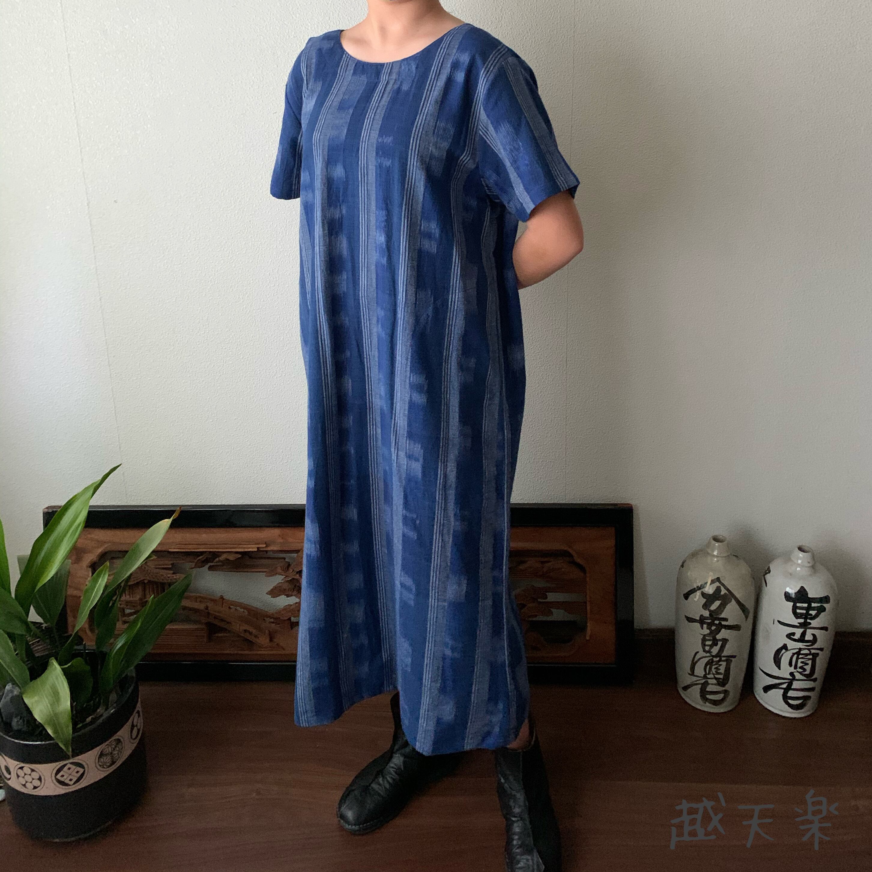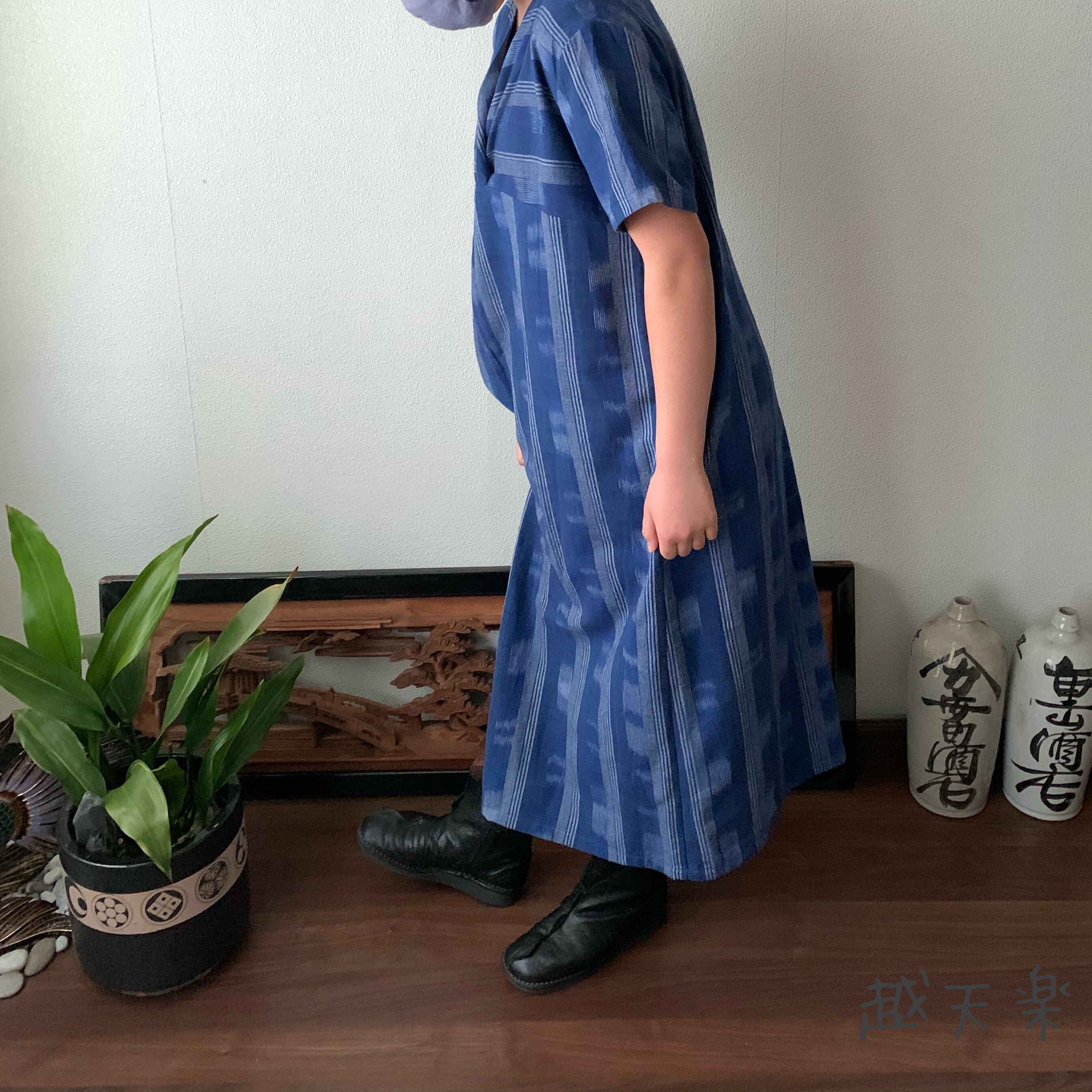 後ろカシュクールが前後で表情を変えるハイウエスト生地切り替え手織り綿ワンピース 青絣