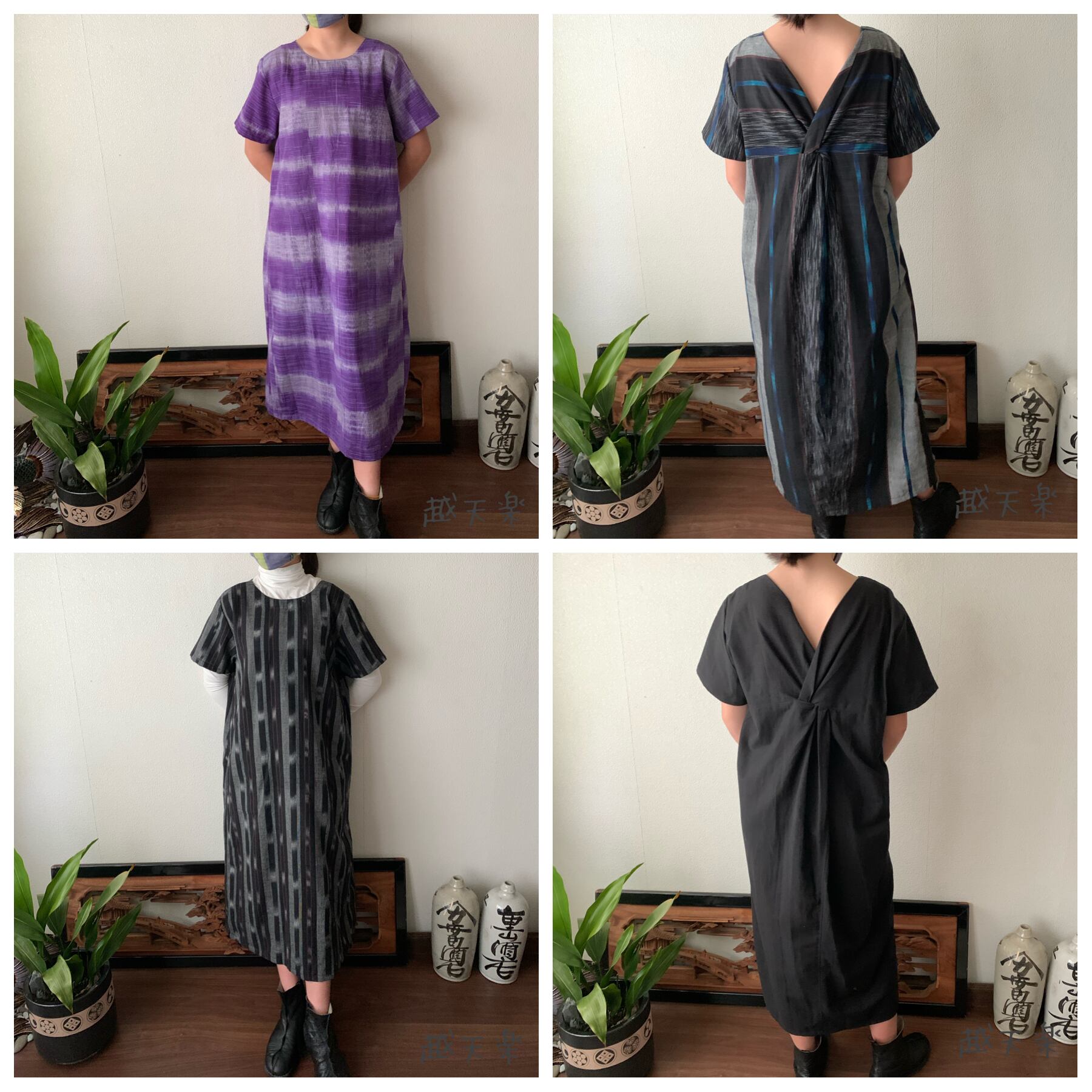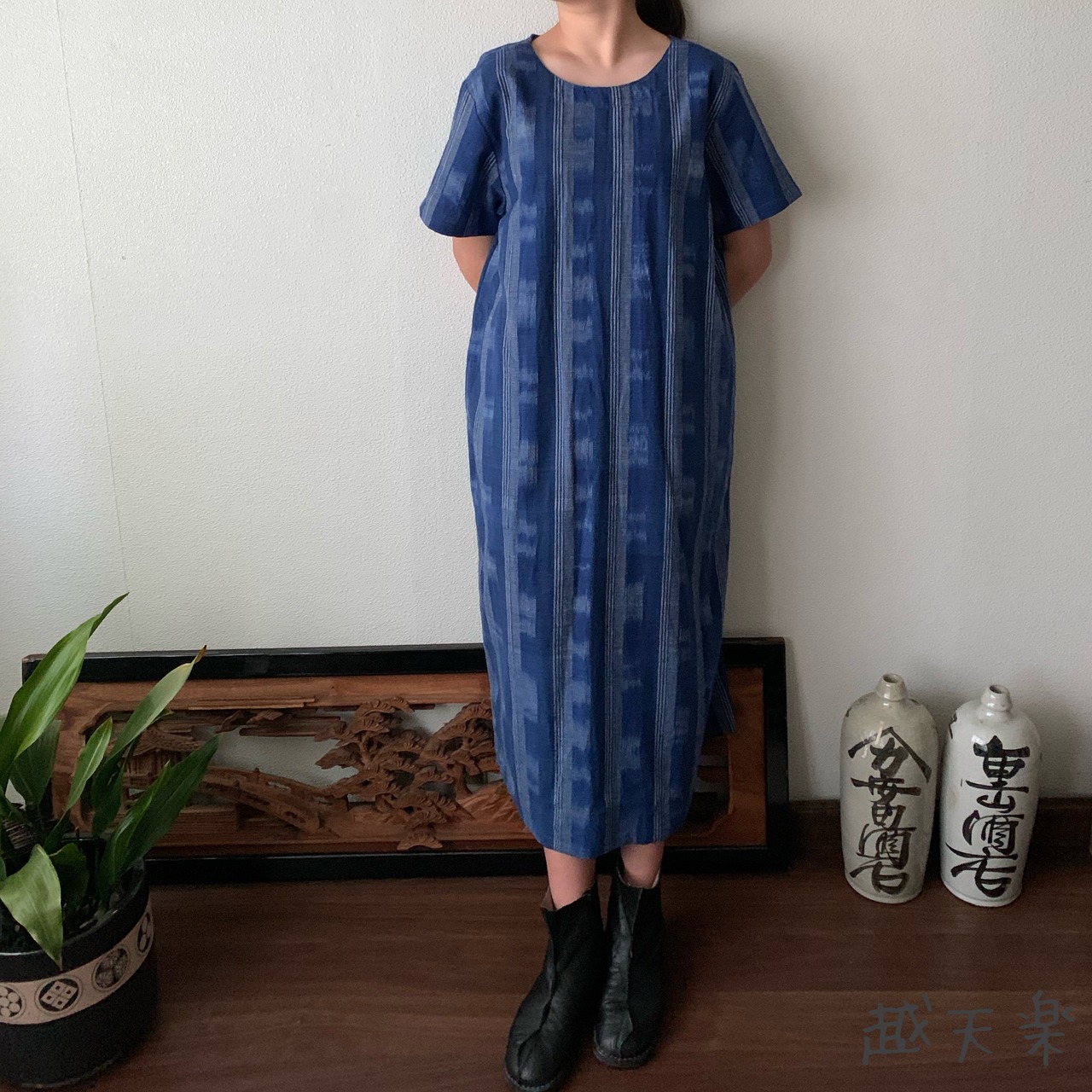 『2021年「越天楽」春夏新作作品 後ろカシュクールが前後で表情を変えるハイウエスト生地切り替え手織り綿ワンピース』