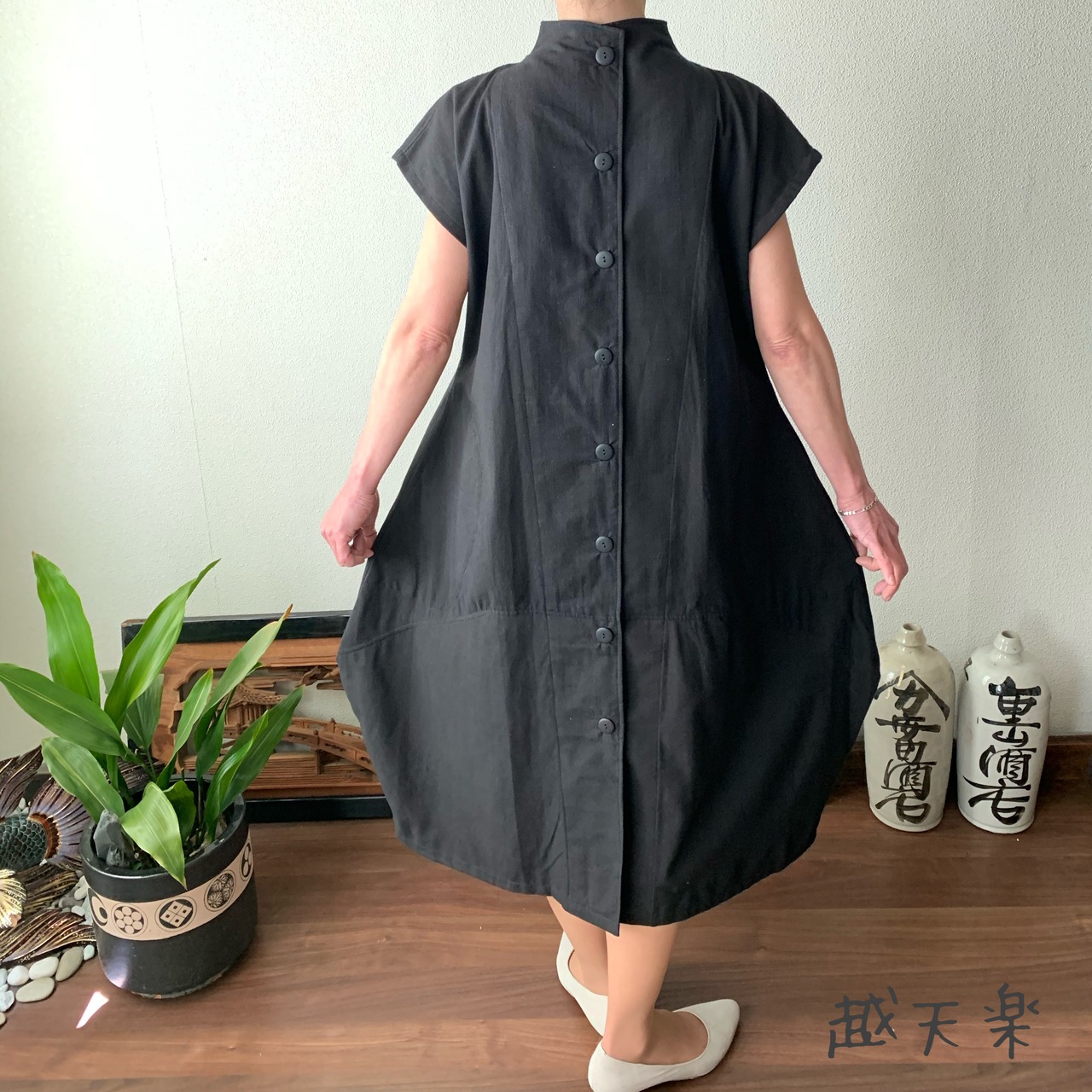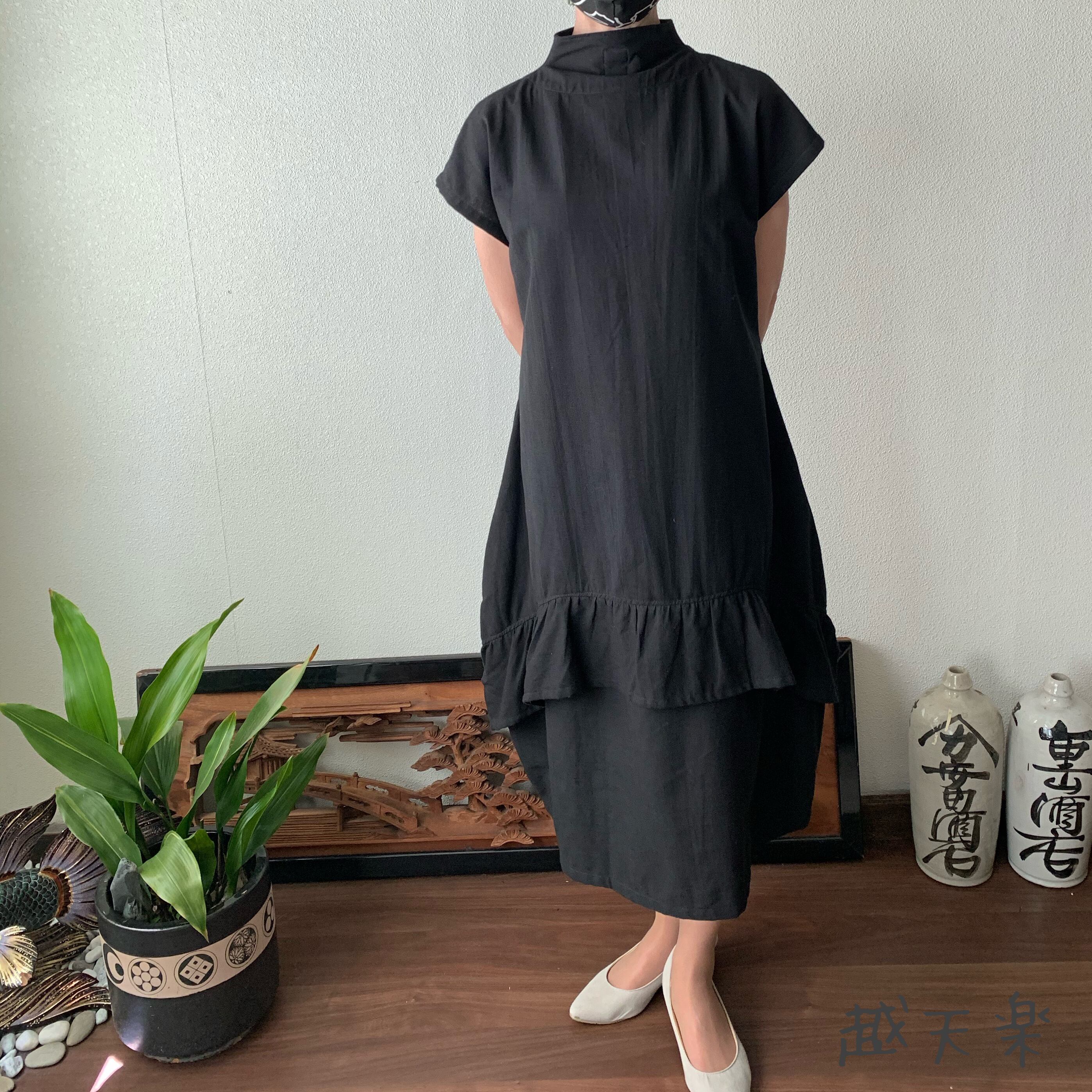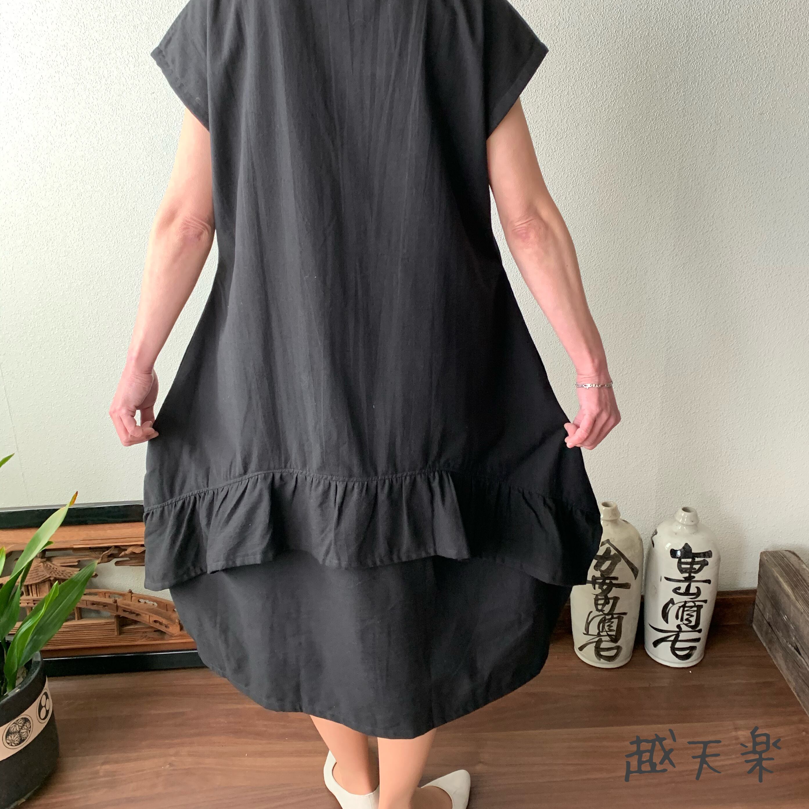 裾切り替えバルーンと裾フリルが前と後ろで表情を変える前開き手織り綿ワンピース 黒無地