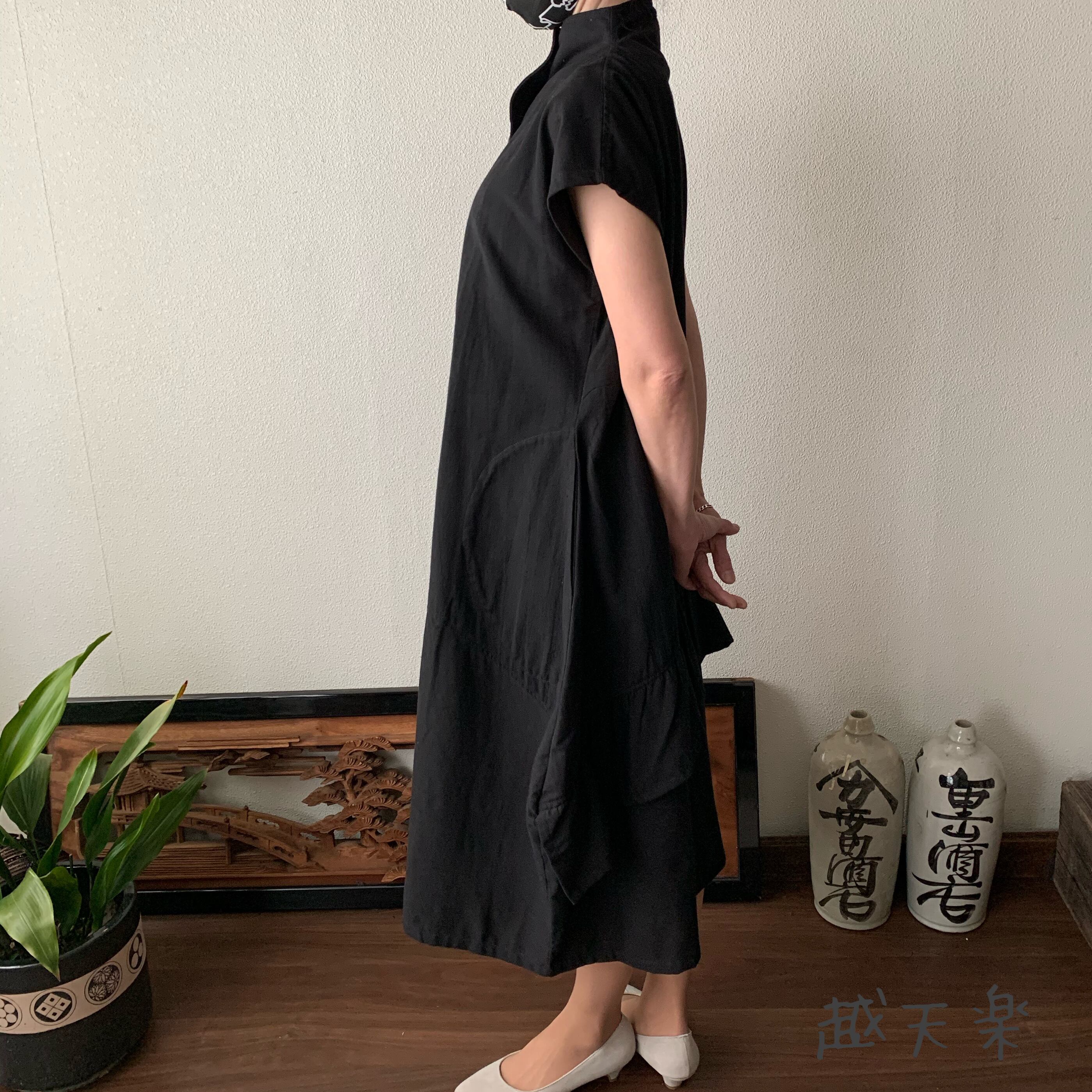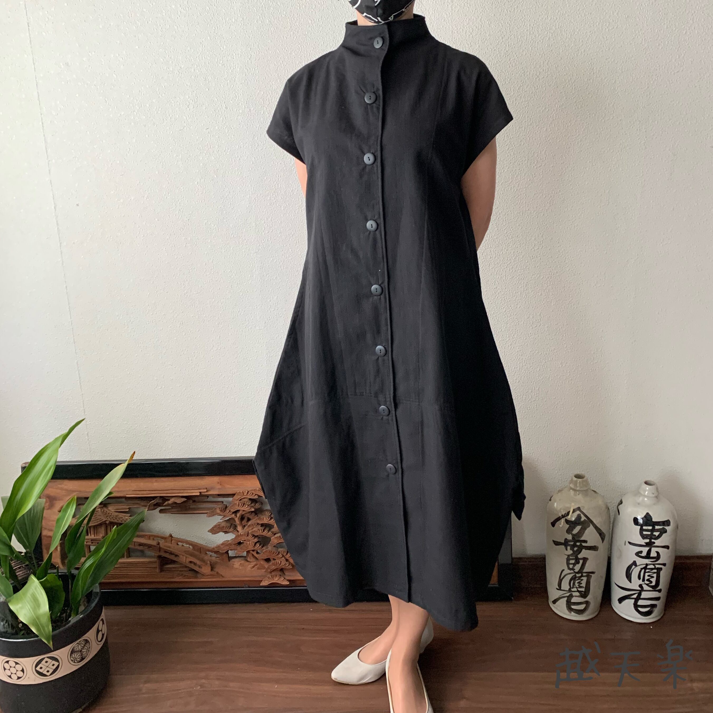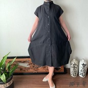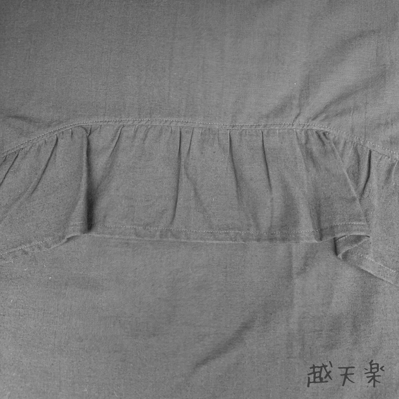 裾切り替えバルーンと裾フリルが前と後ろで表情を変える前開き手織り綿ワンピース 黒無地
