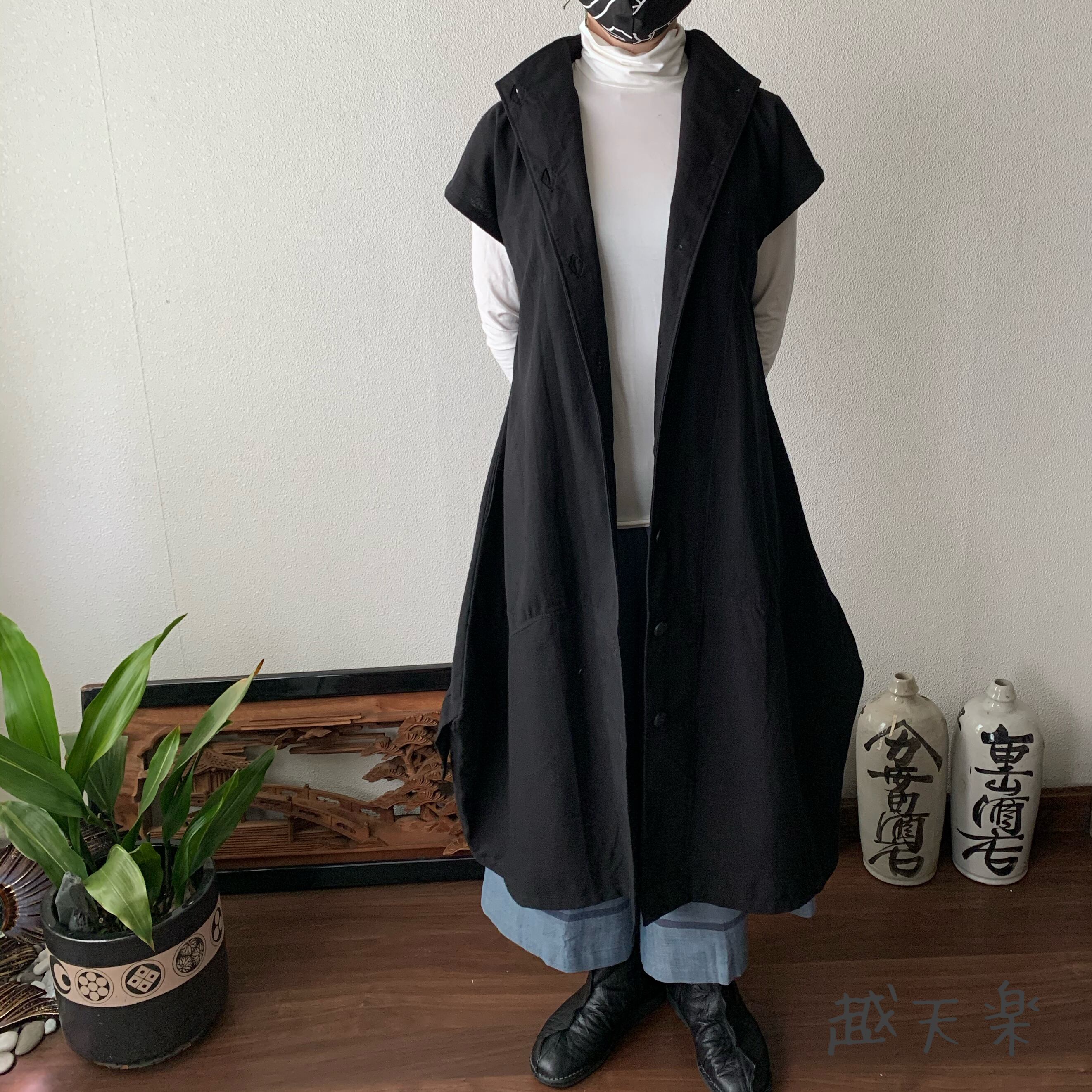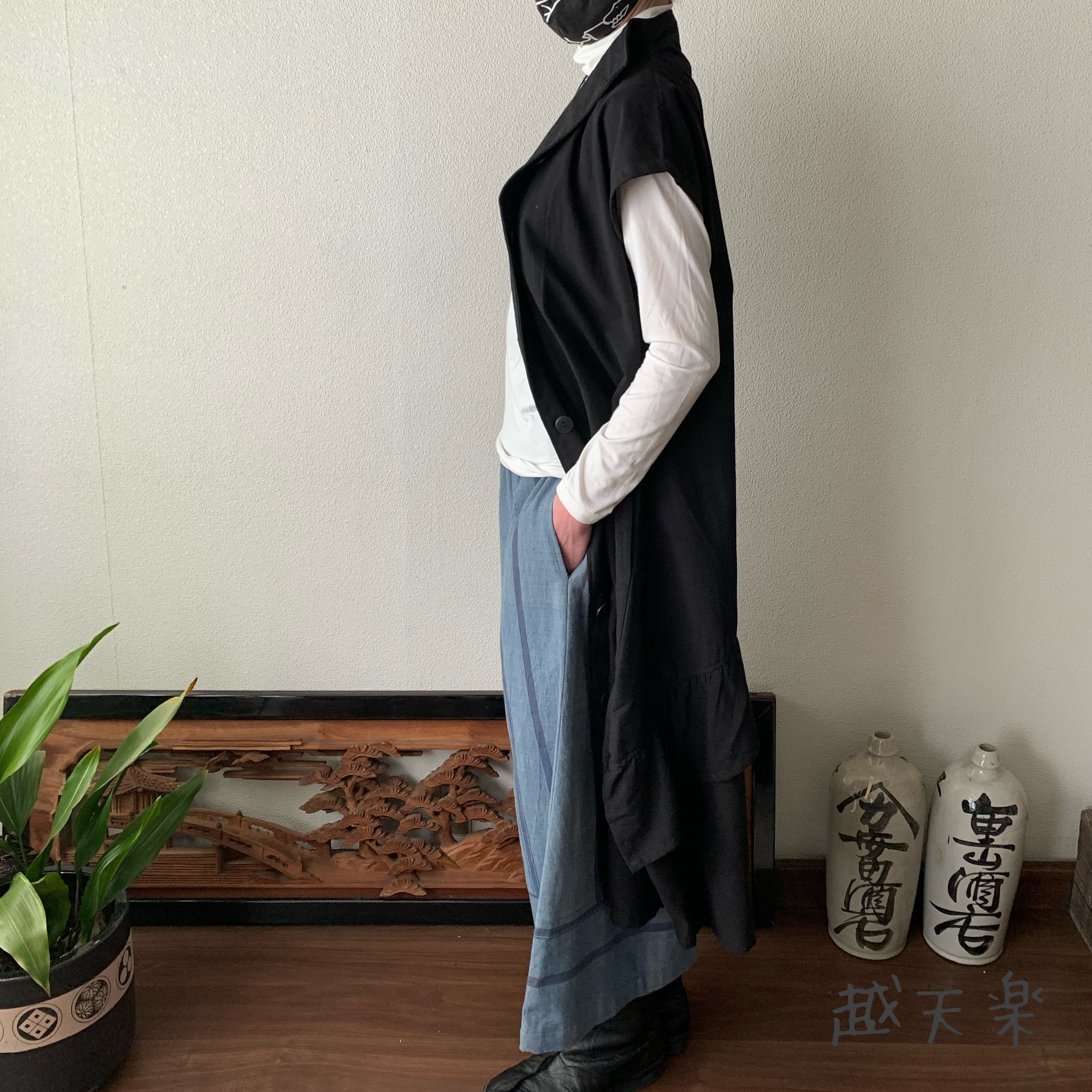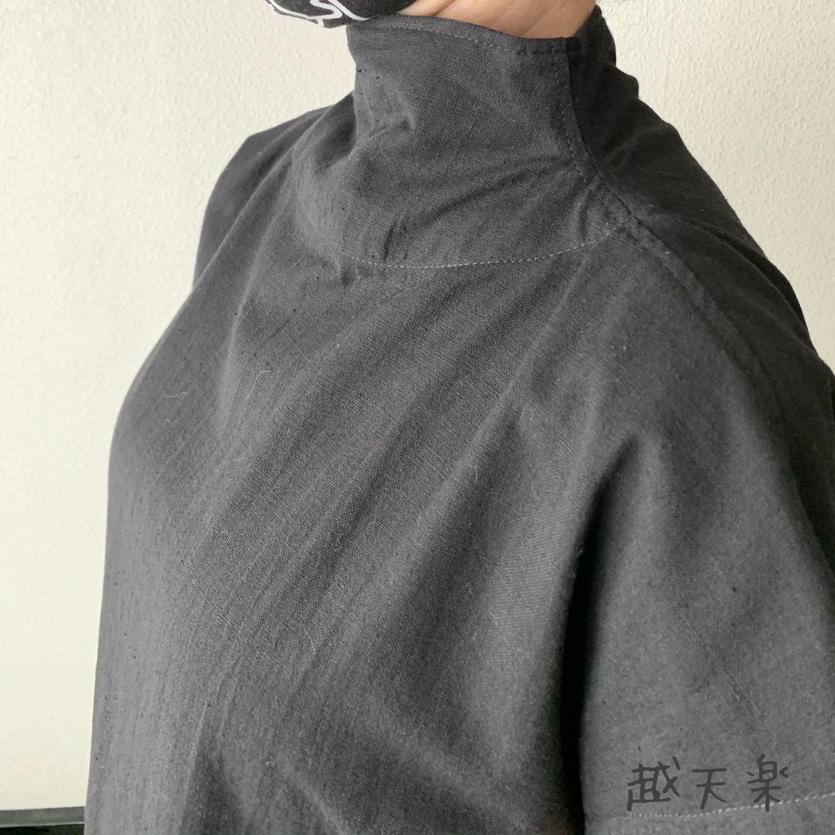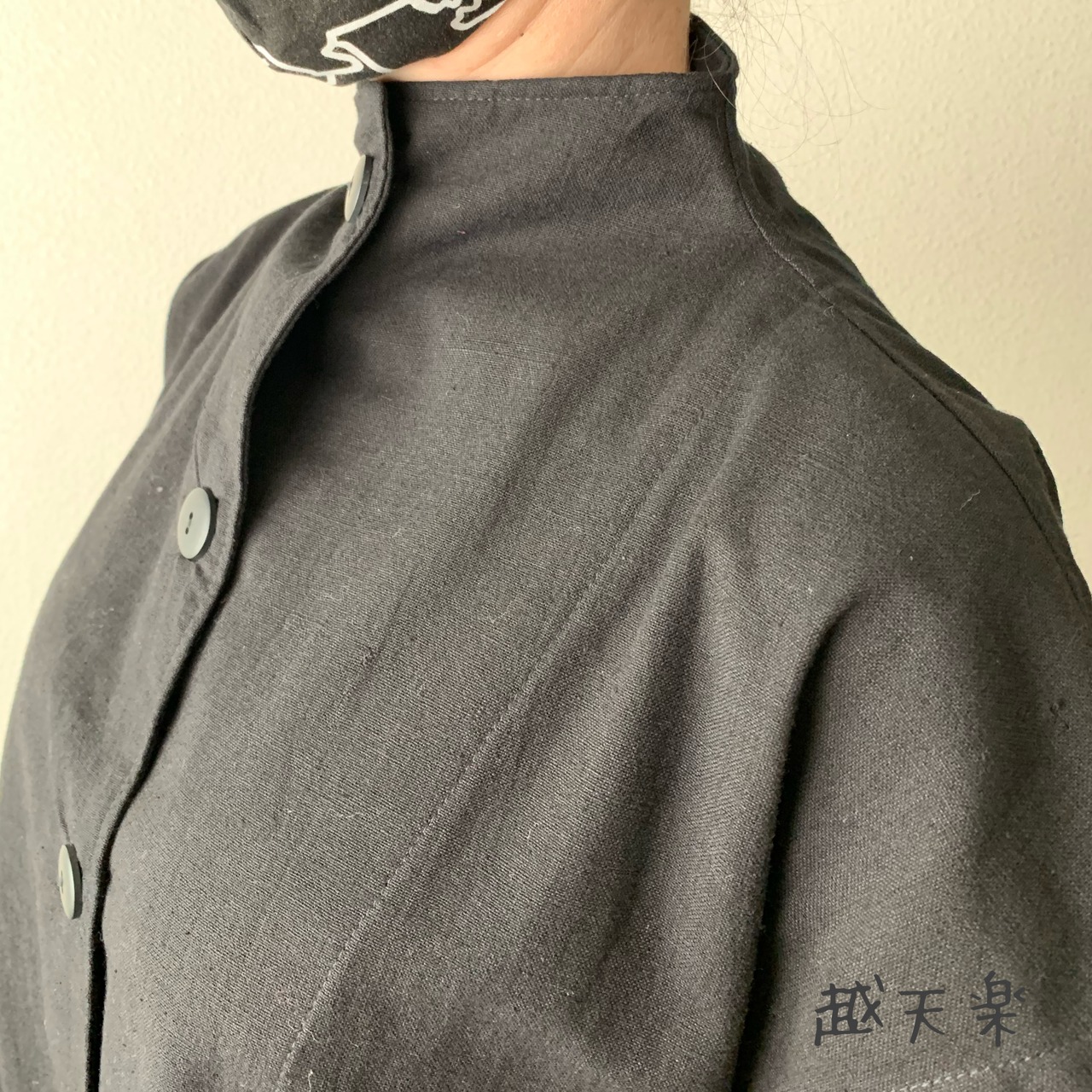 襟のハイネックが首筋をきれいにカバーしてくれ、中にタートル等着こなしても楽しめますし、フレンチスリーブなので一枚でも着やすいです。前を開いて着用する時は長めの羽織やロングベストとしても遊んでいただけます。