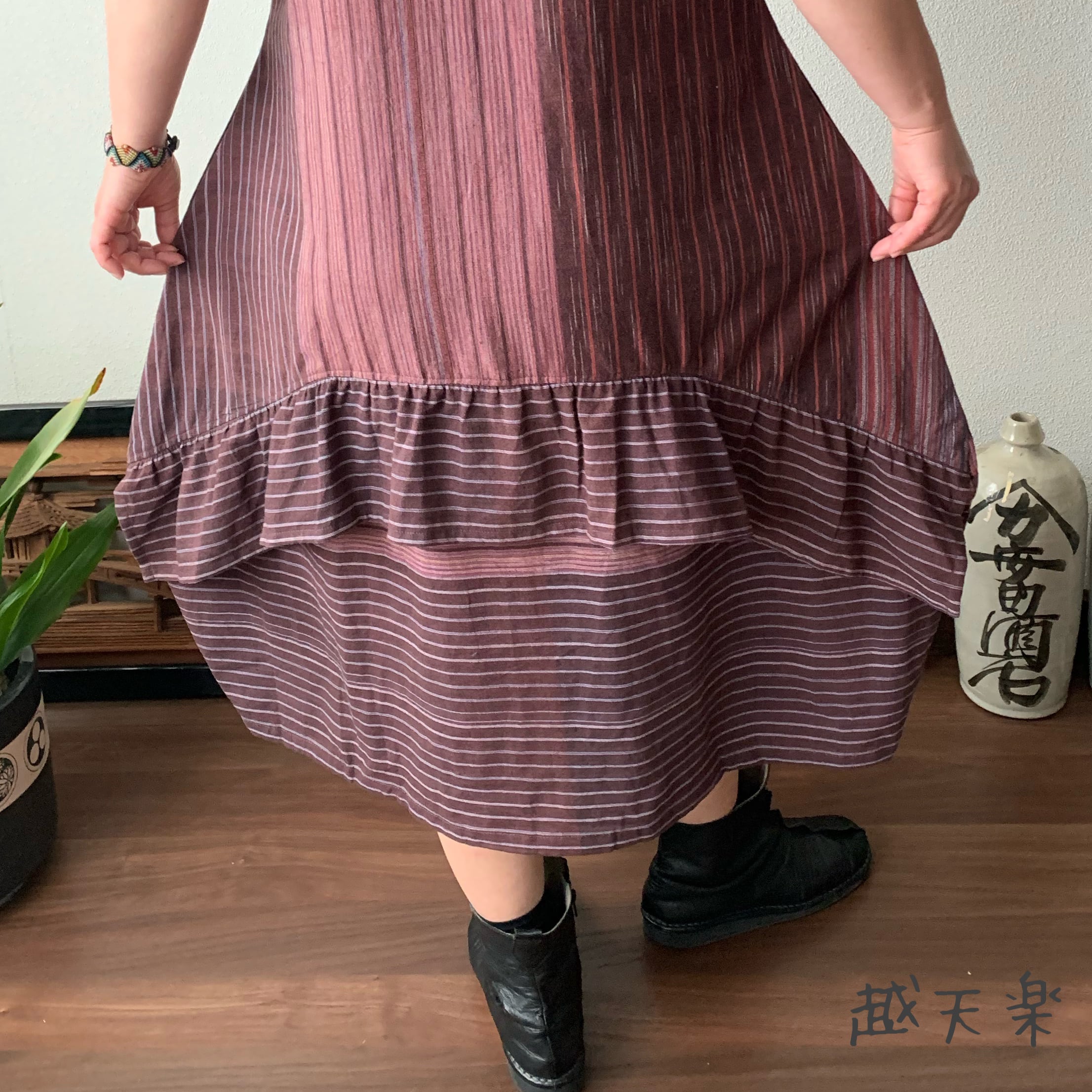 裾切り替えバルーンと裾フリルが前と後ろで表情を変える前開き手織り綿ワンピース あずき絣