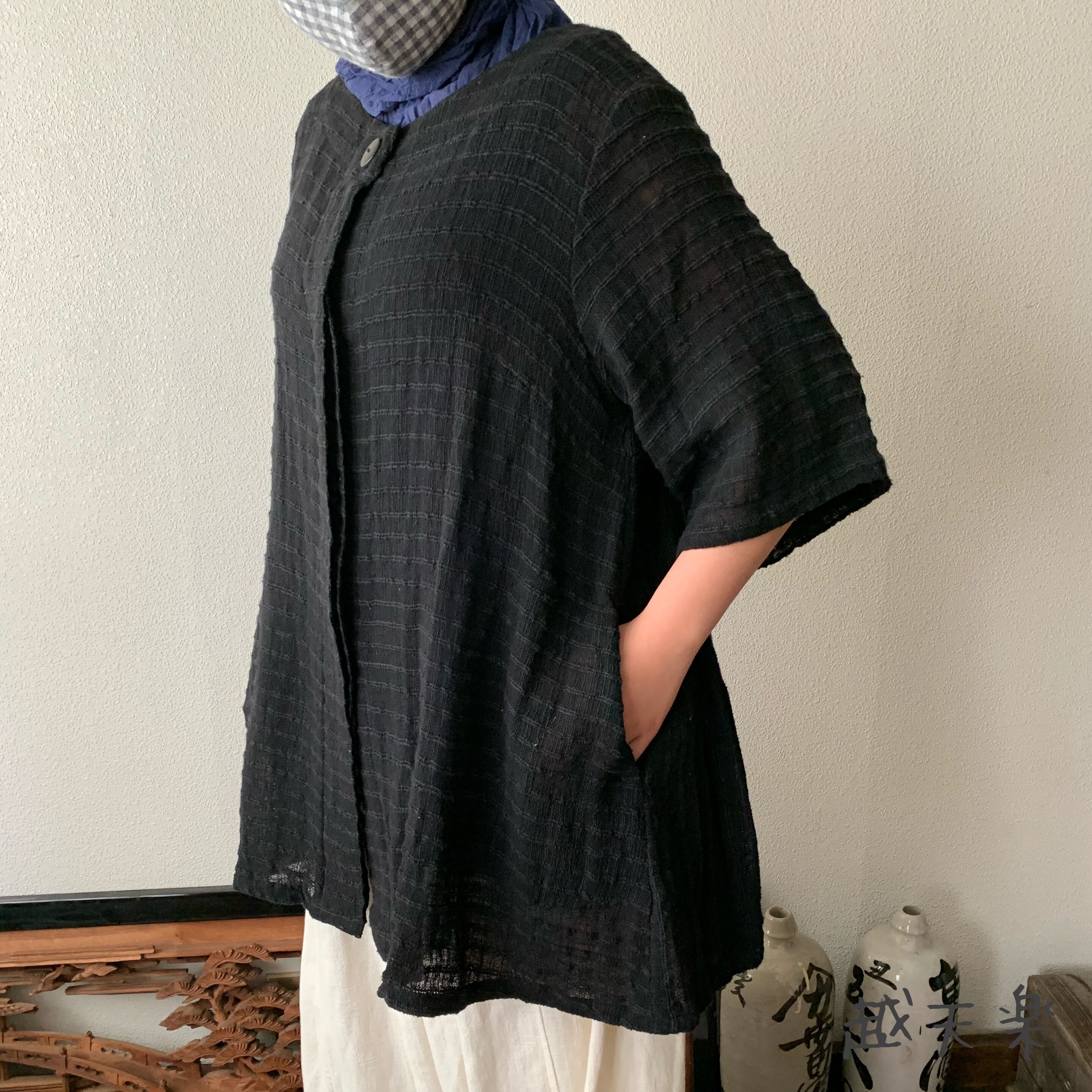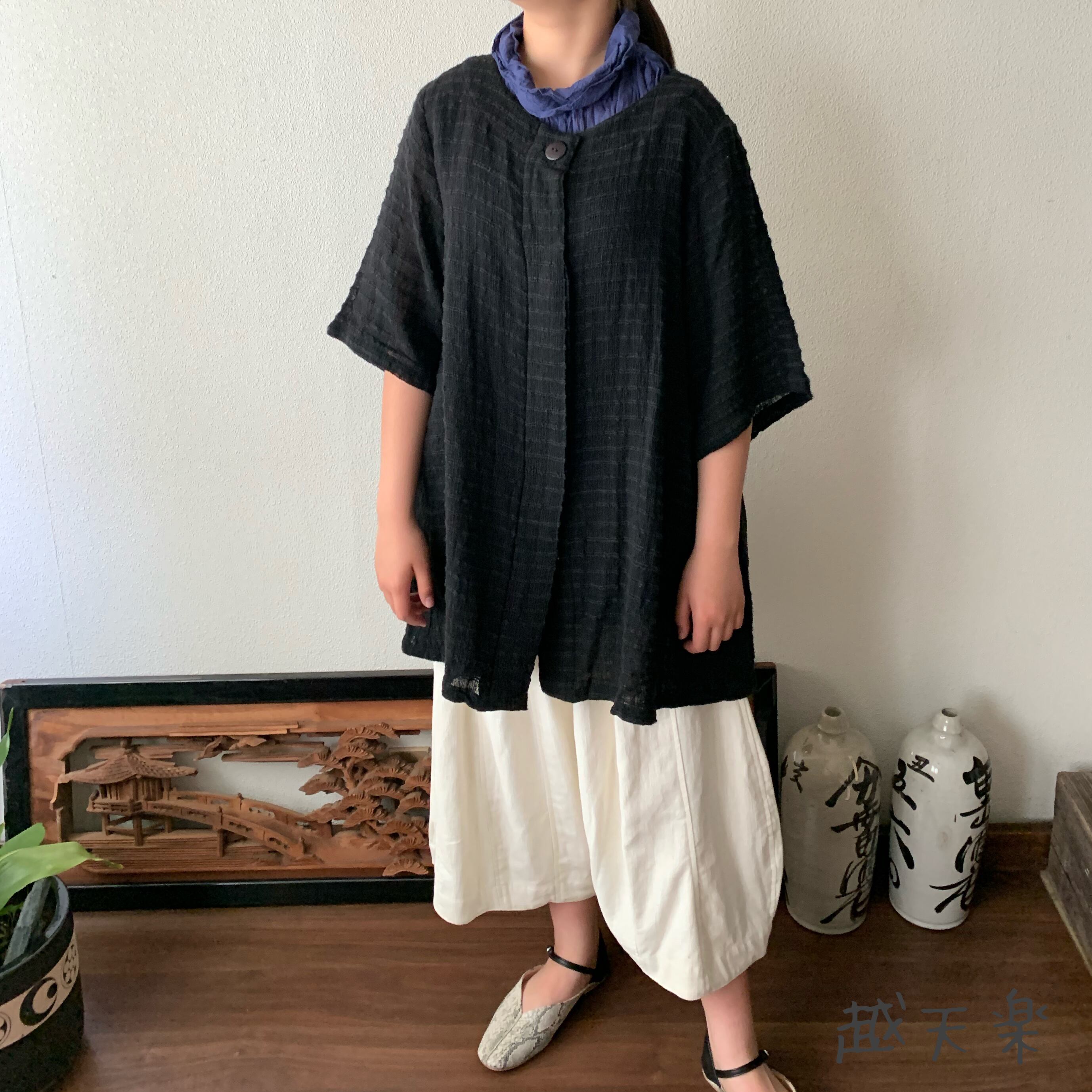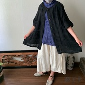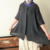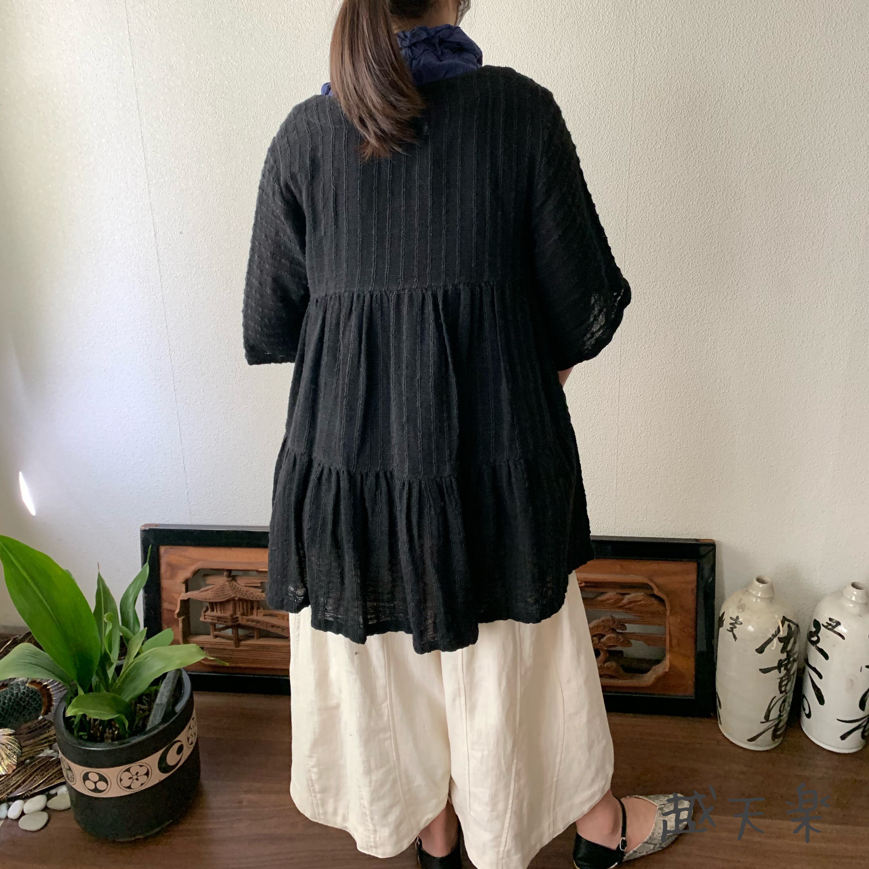『バックサイドティアードが楽しい前開き手織り綿チュニックブラウス 隠しボタンと丸襟ですっきり着こなし』