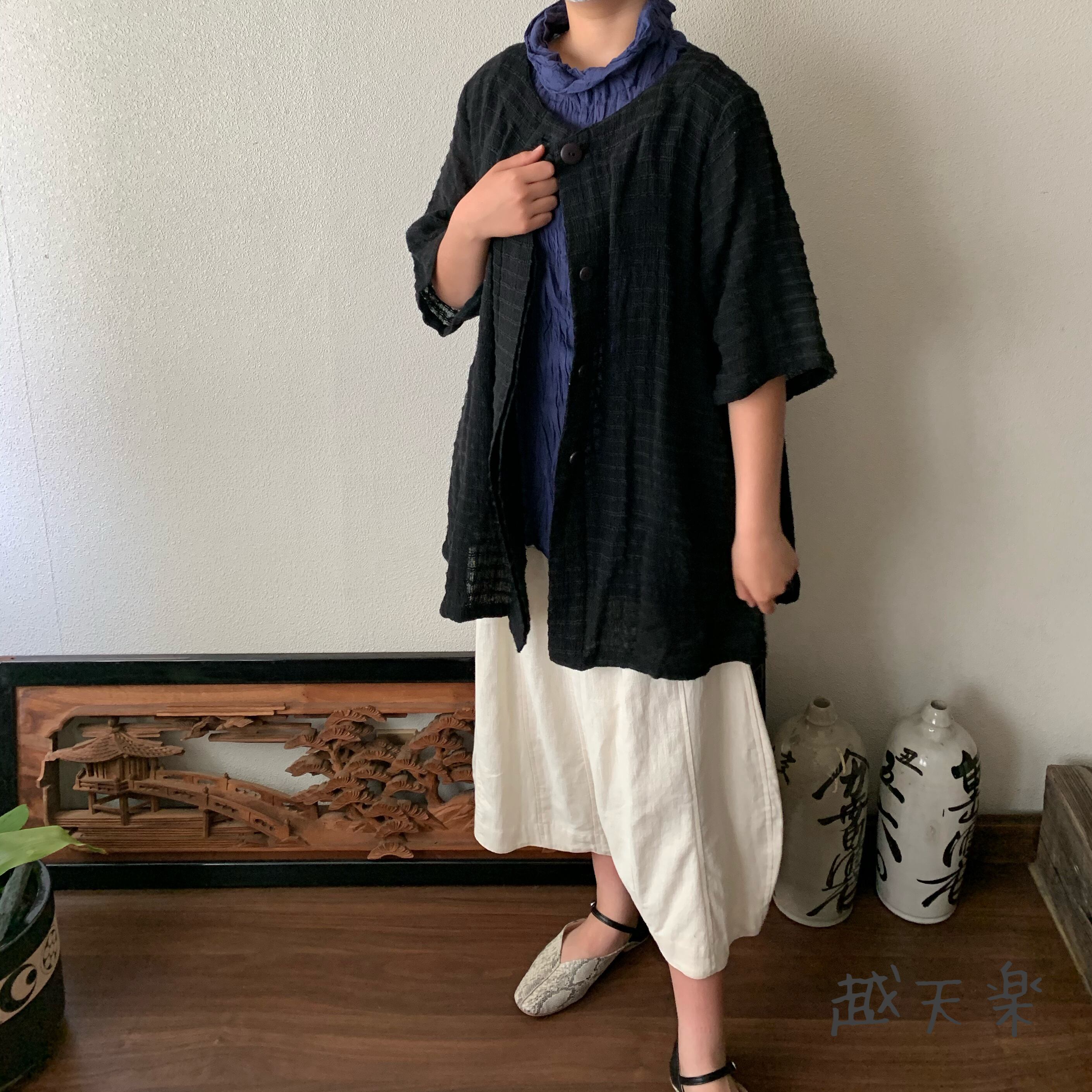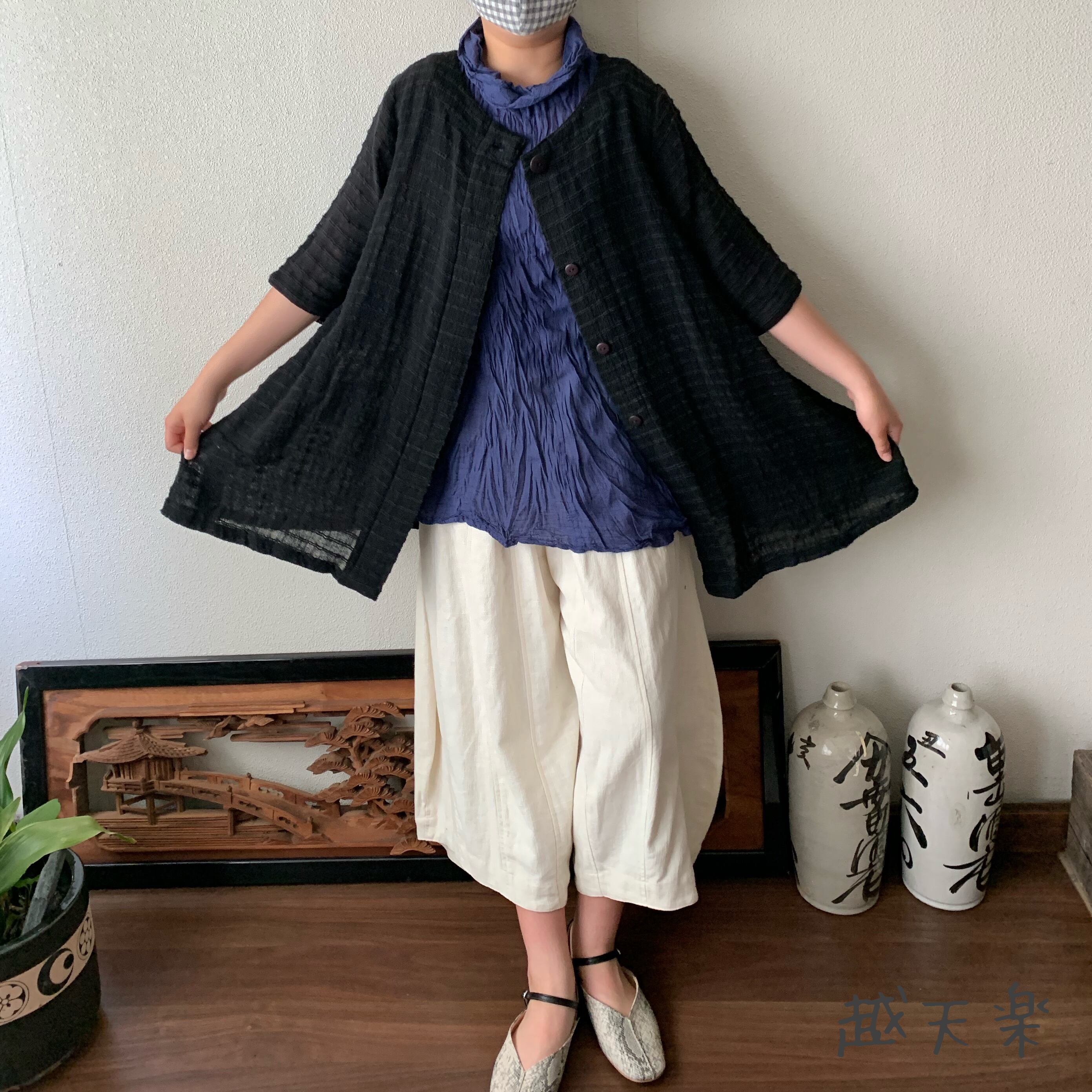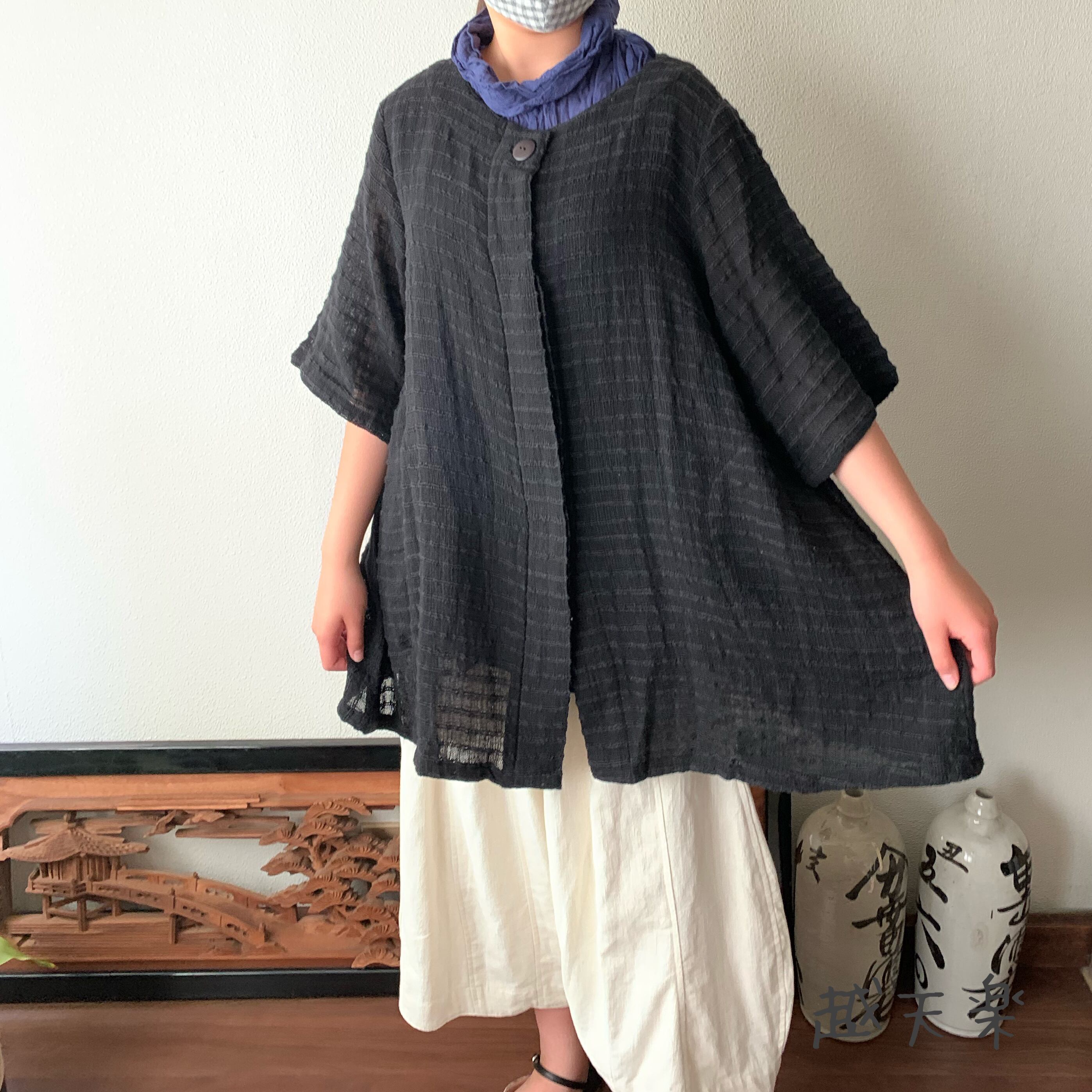 『バックサイドティアードが楽しい前開き手織り綿チュニックブラウス 隠しボタンと丸襟ですっきり着こなし』