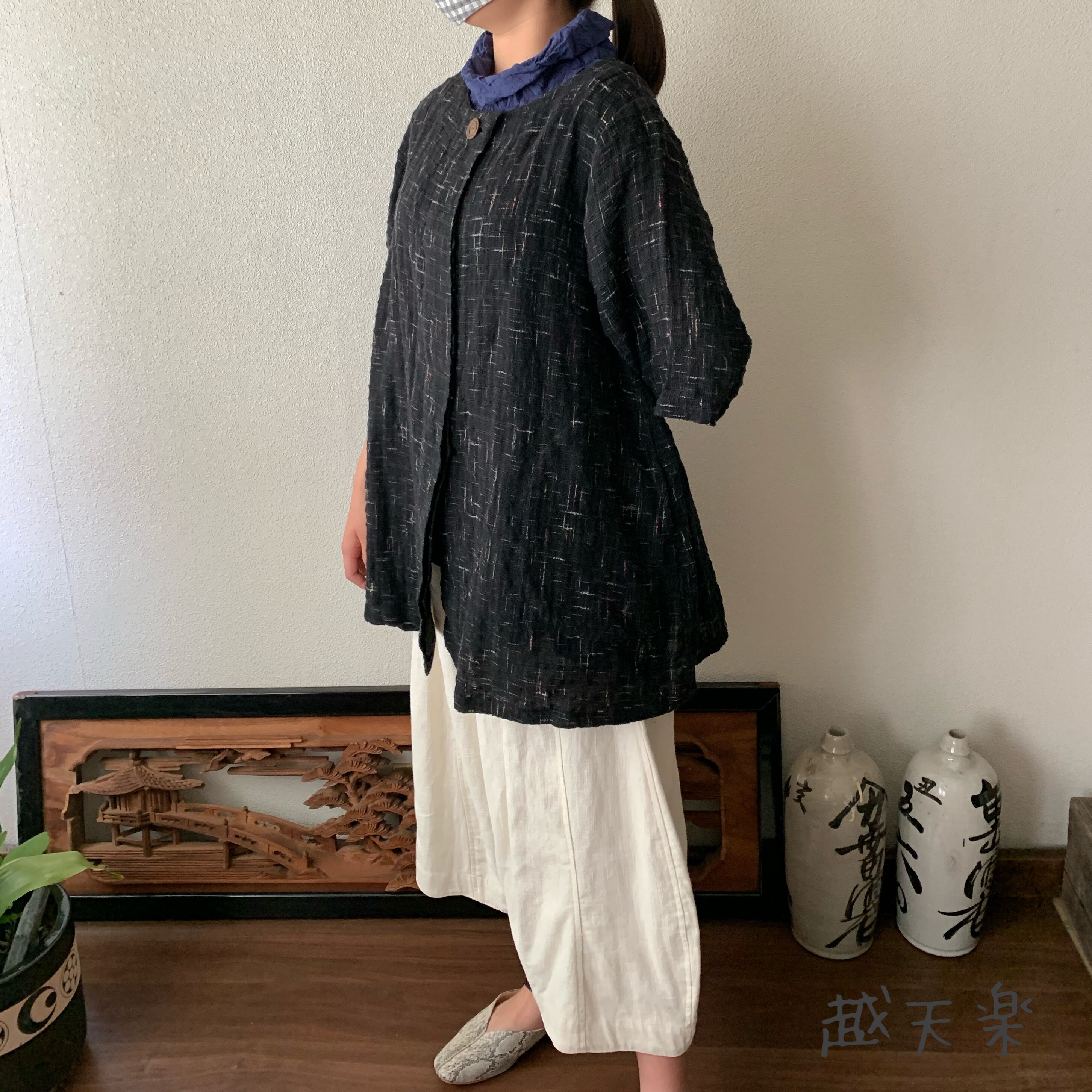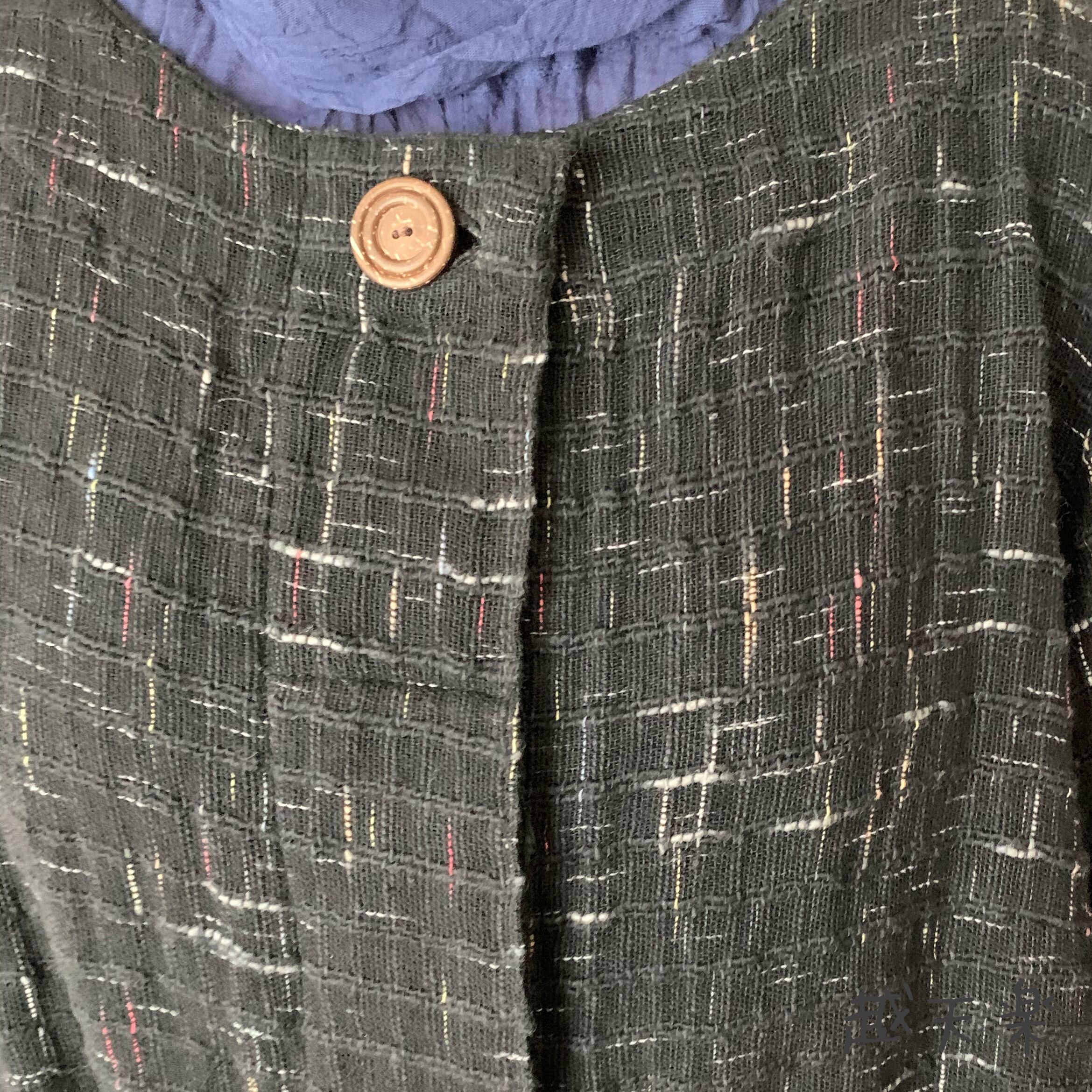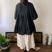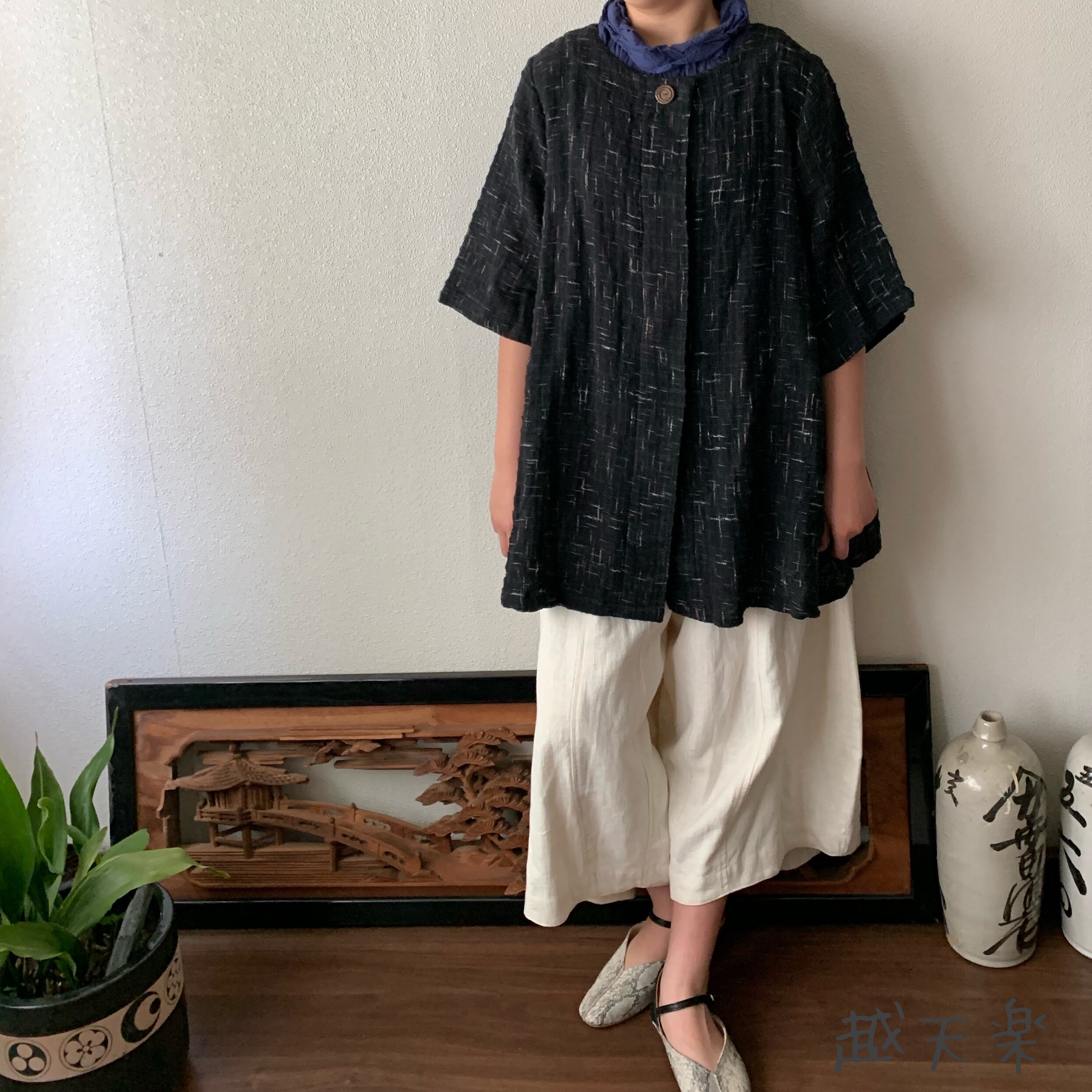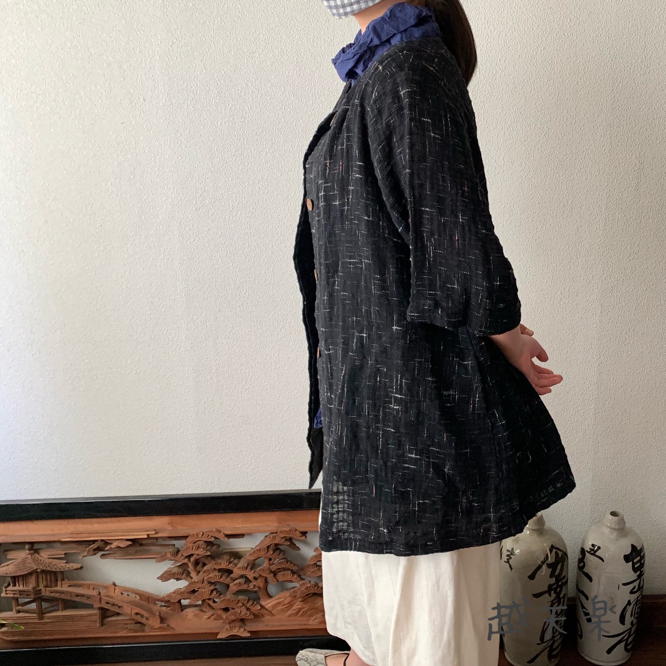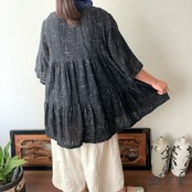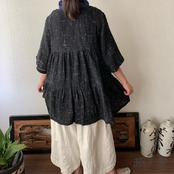 バックサイドティアードが楽しい前開き手織り綿チュニックブラウス 隠しボタンと丸襟ですっきり着こなし 黒絣