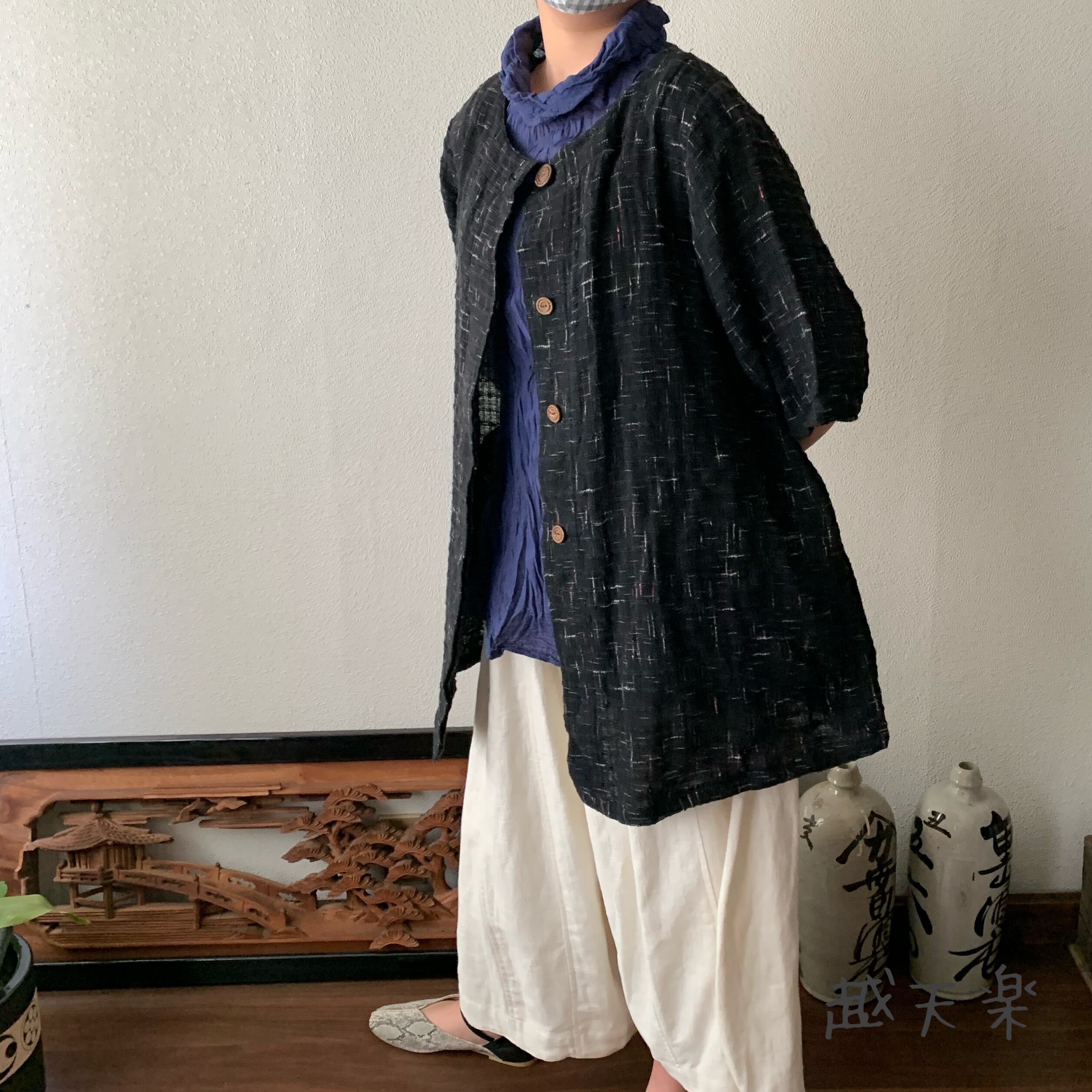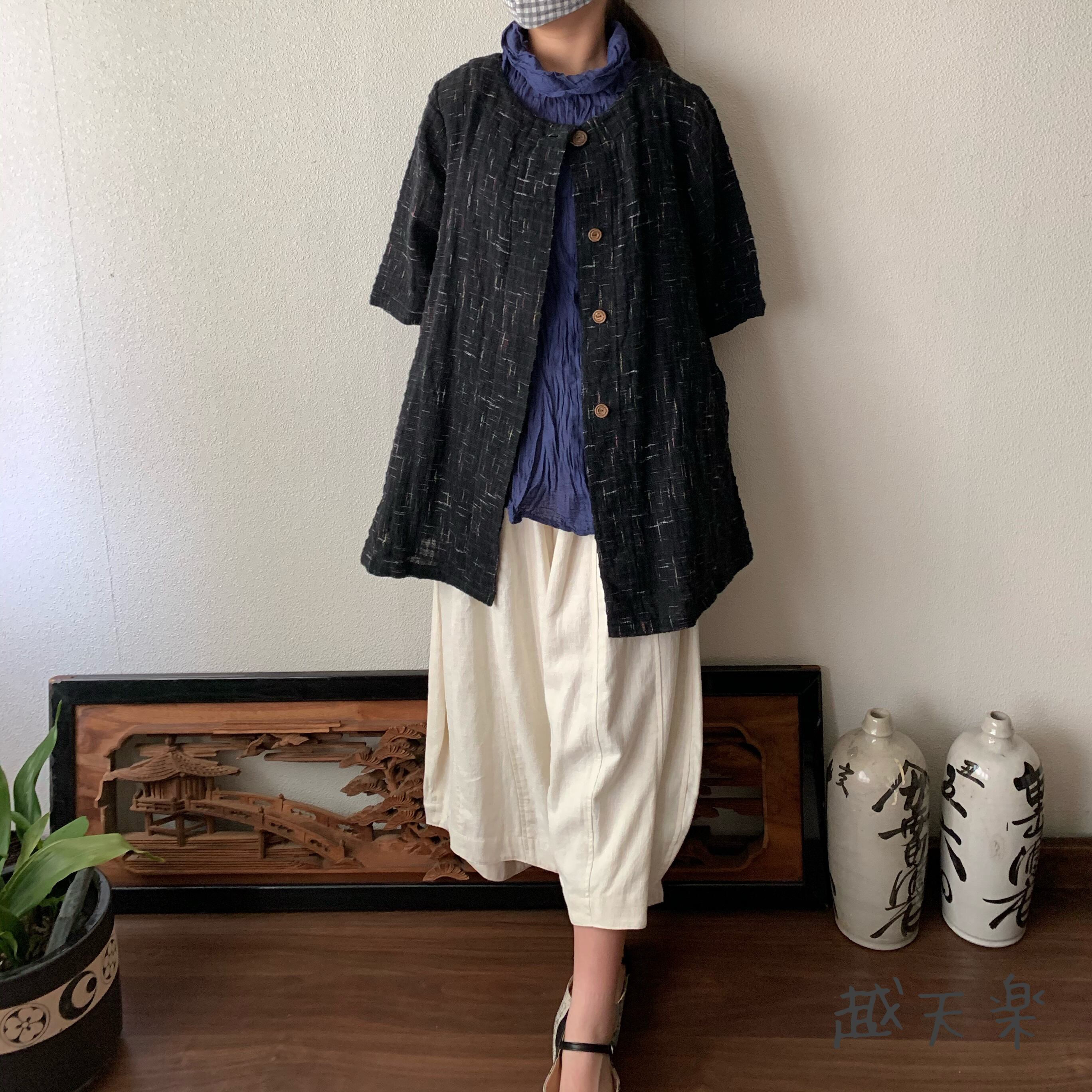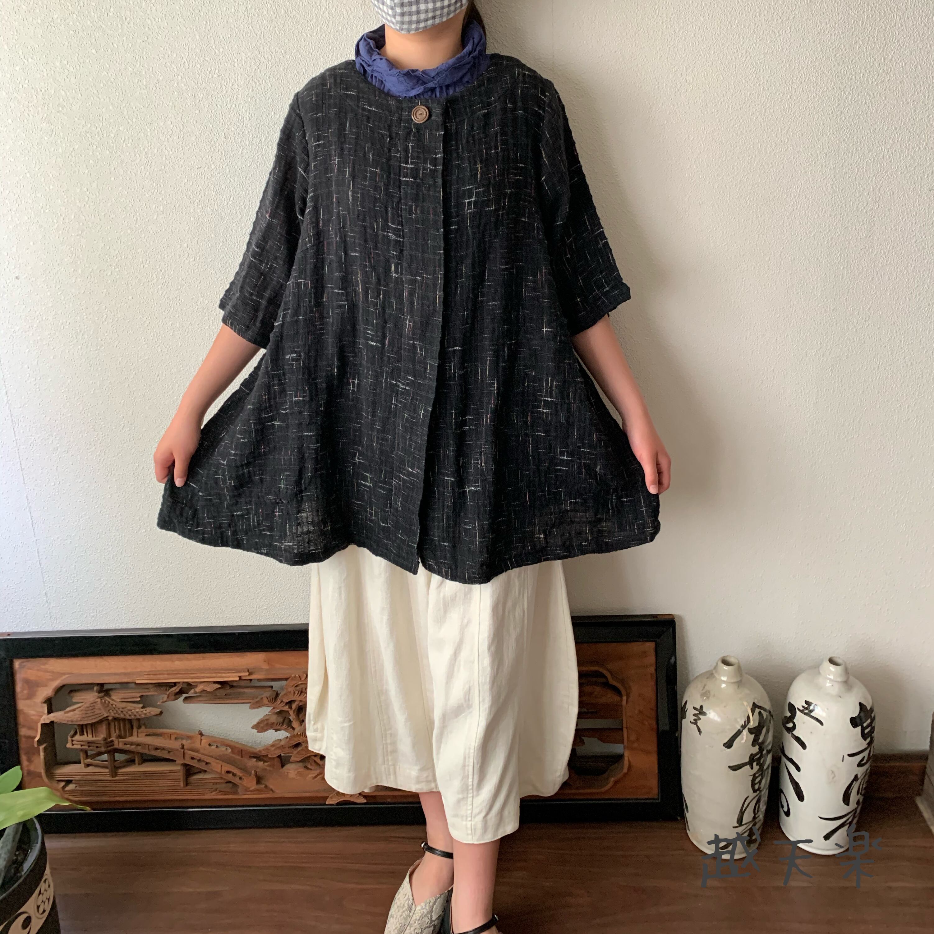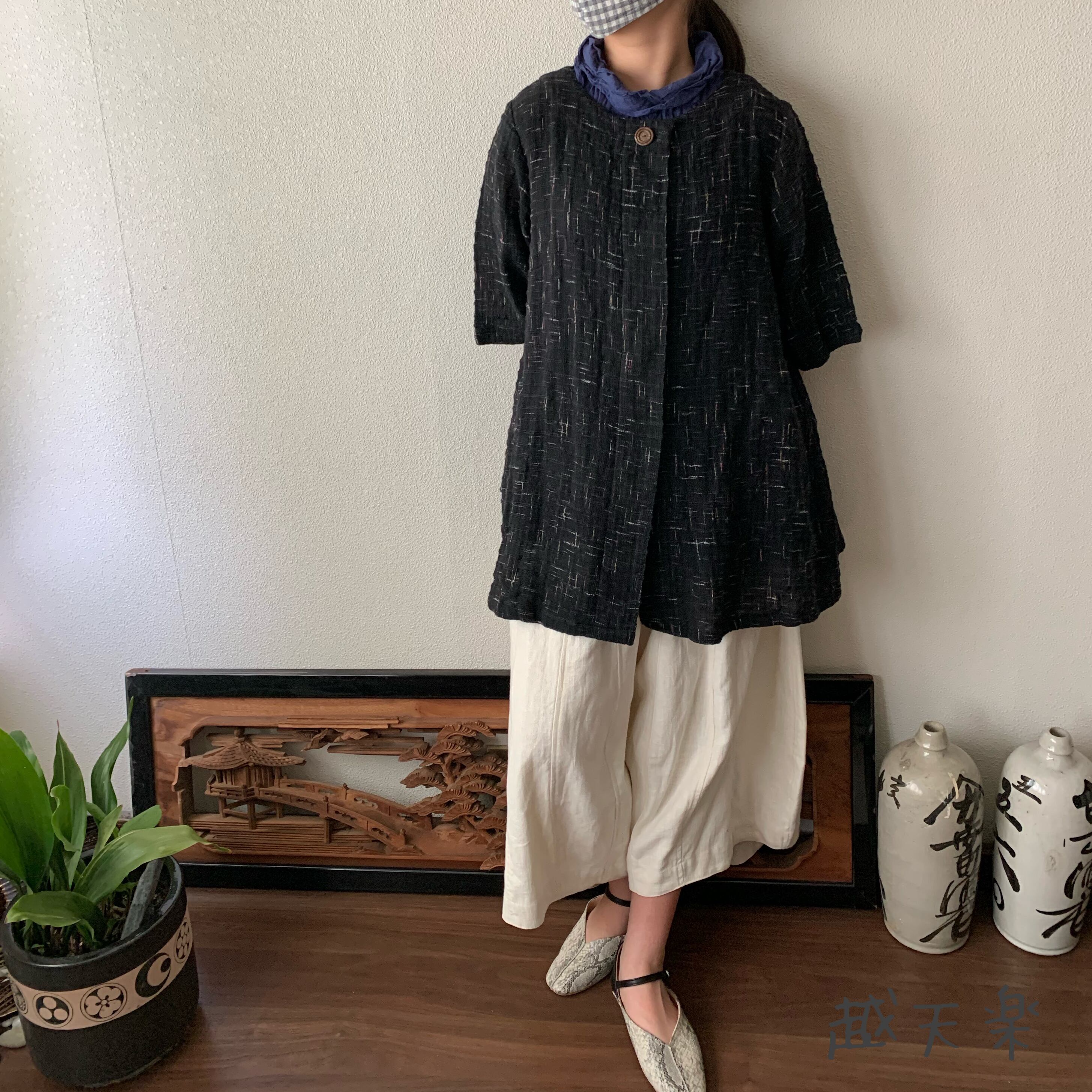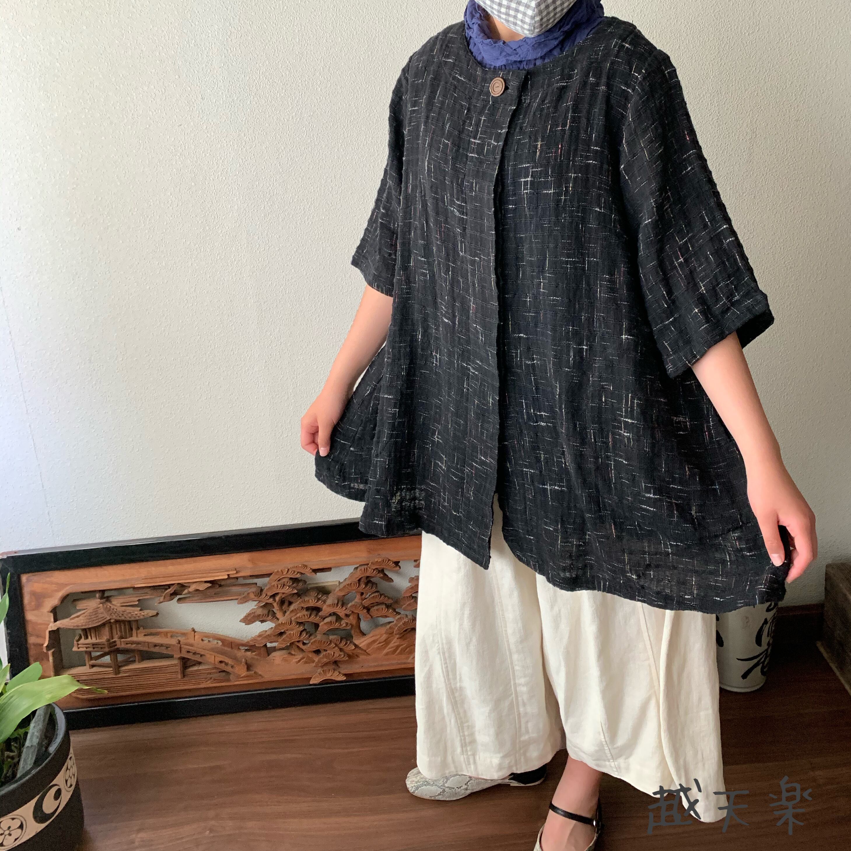バックサイドティアードが楽しい前開き手織り綿チュニックブラウス 隠しボタンと丸襟ですっきり着こなし 黒絣