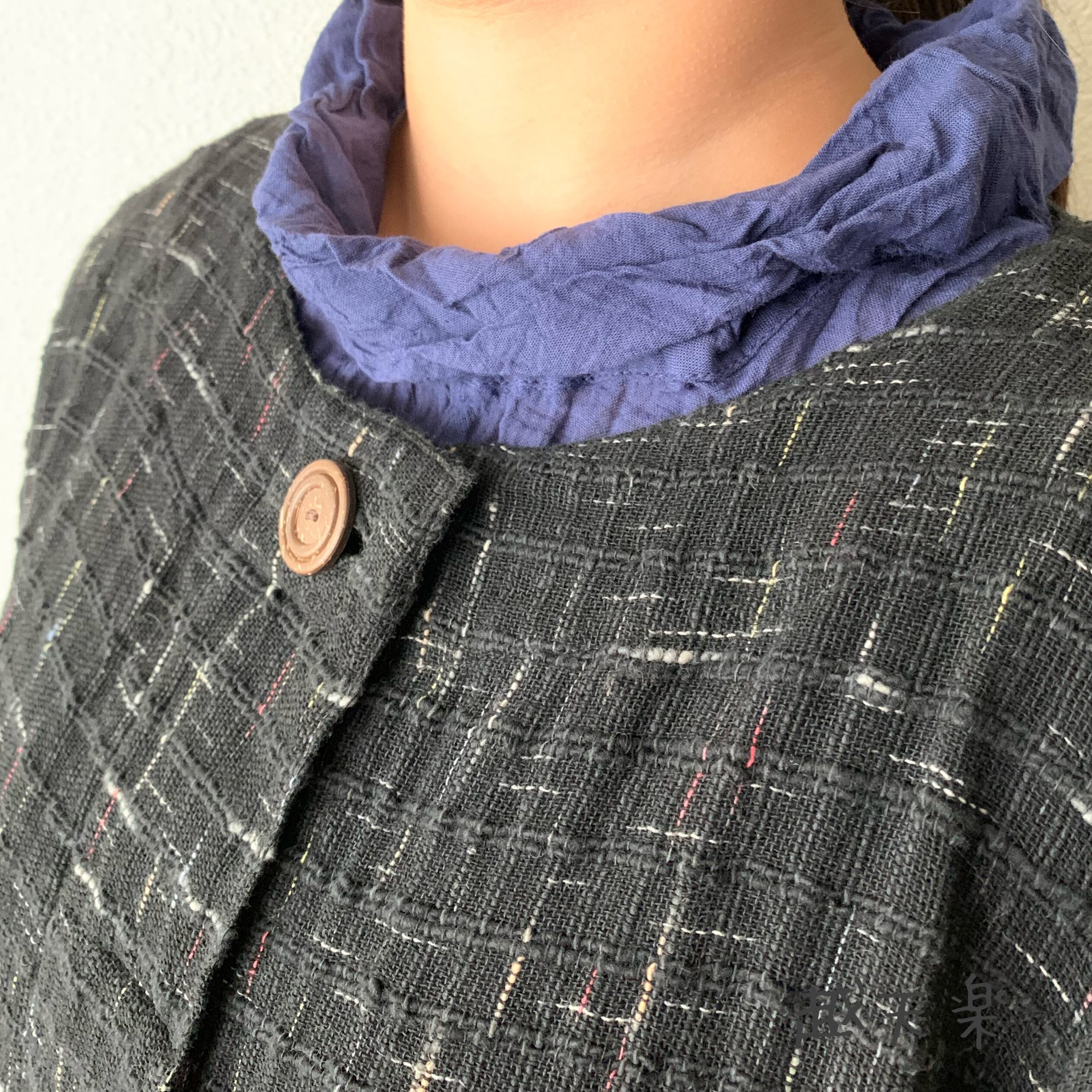 前を開いてジャケットとして羽織っても使えますし、前を留めると隠しボタンですっきりとチュニックとしても着ていただけます。