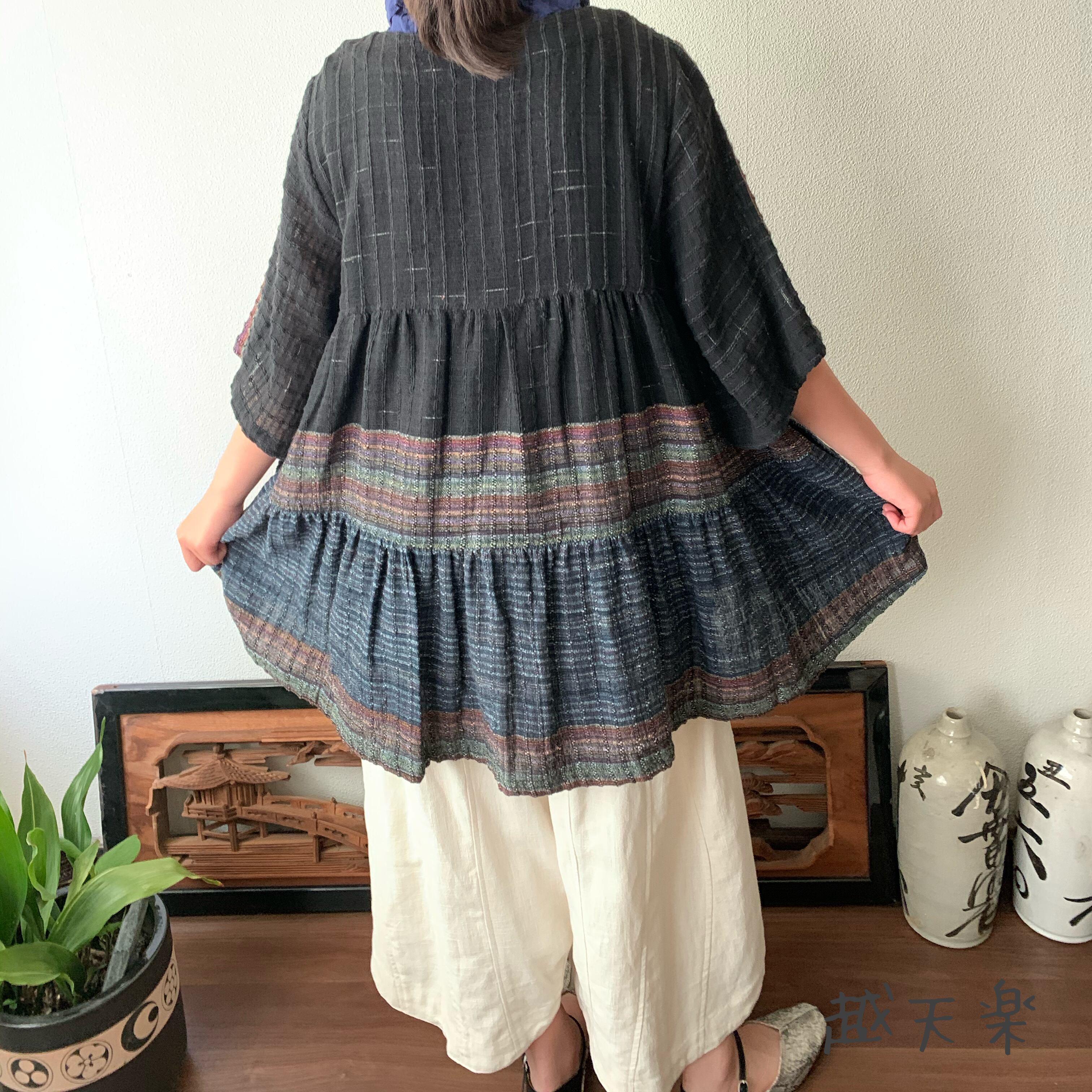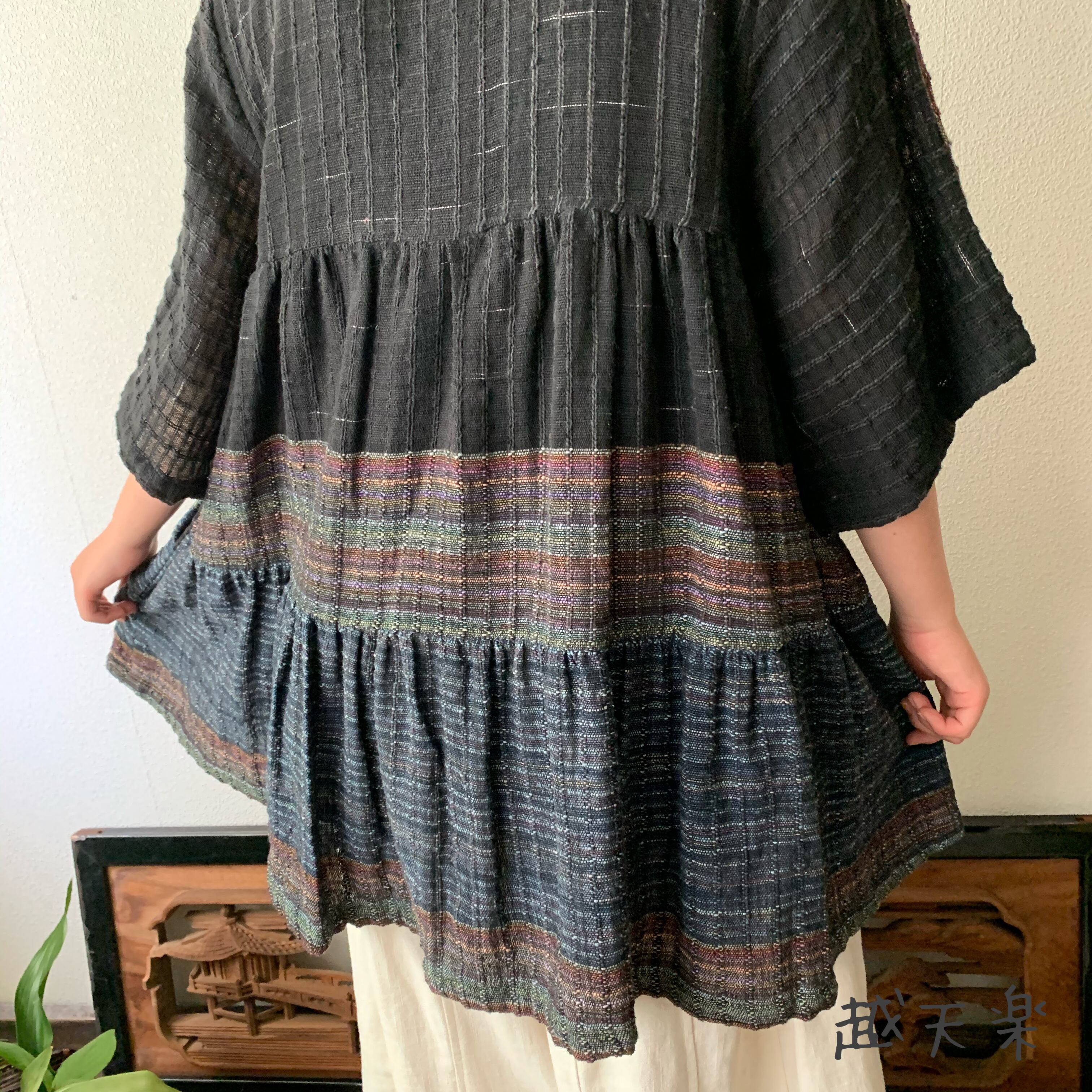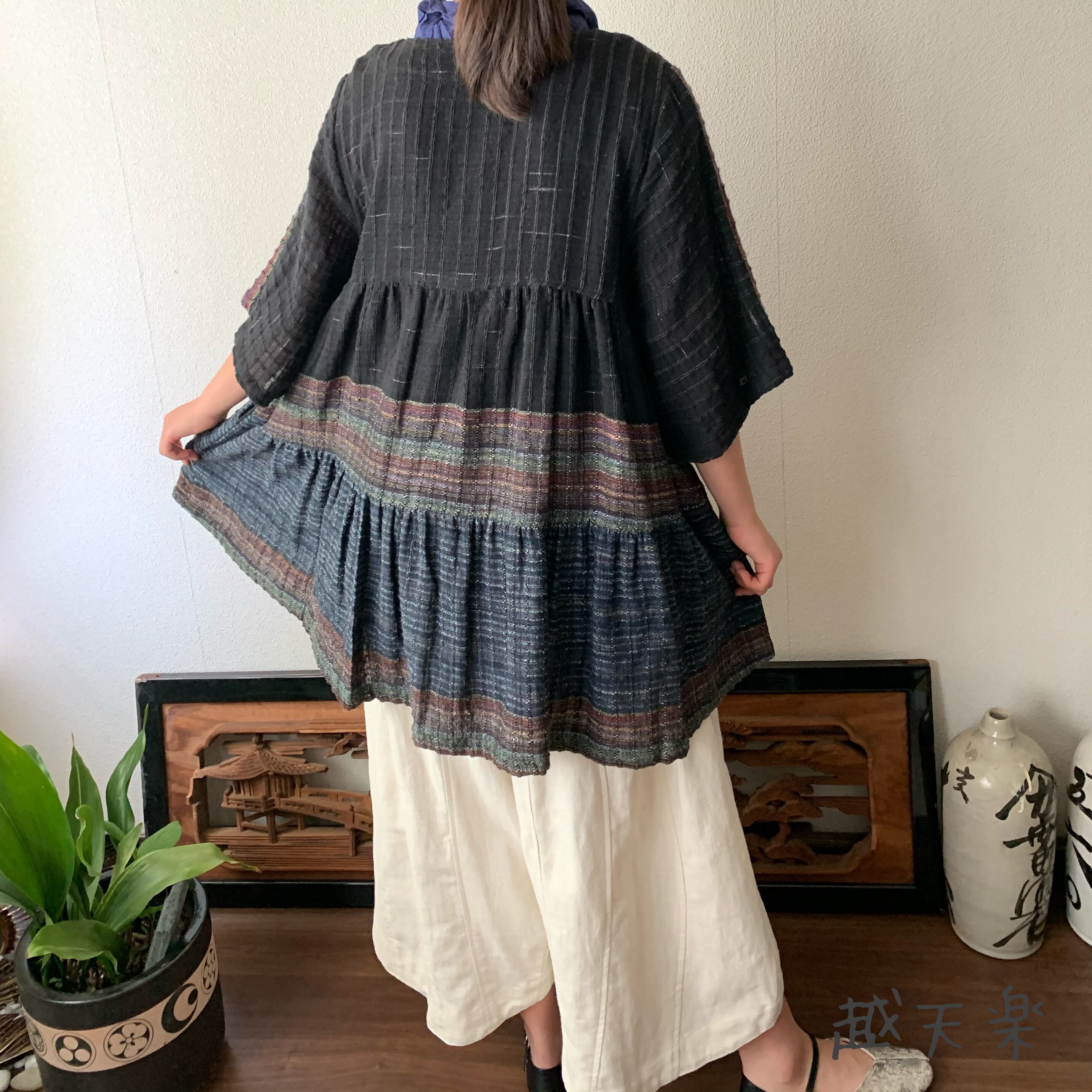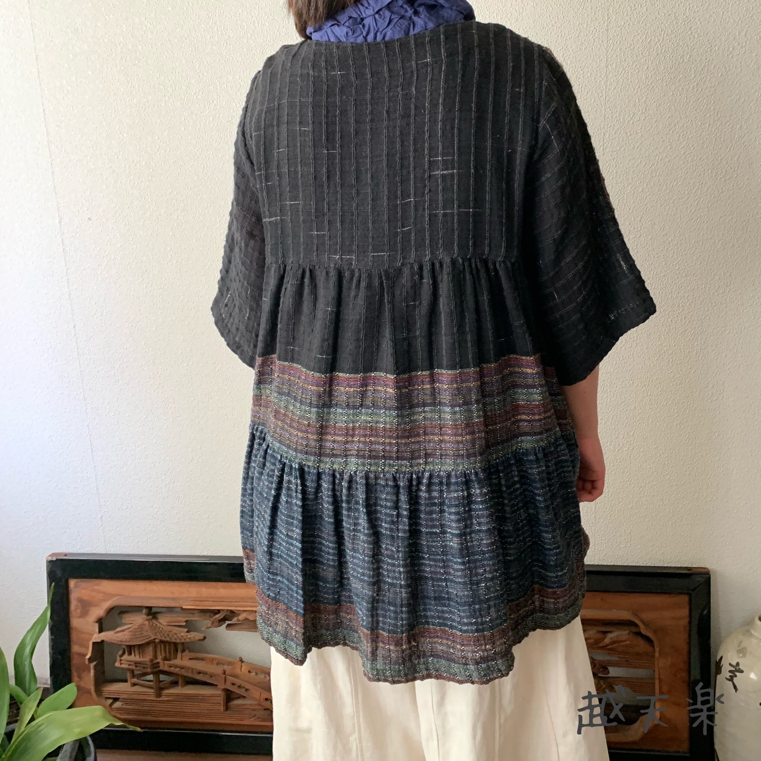 『バックサイドティアードが楽しい前開き手織り綿チュニックブラウス 隠しボタンと丸襟ですっきり着こなし』