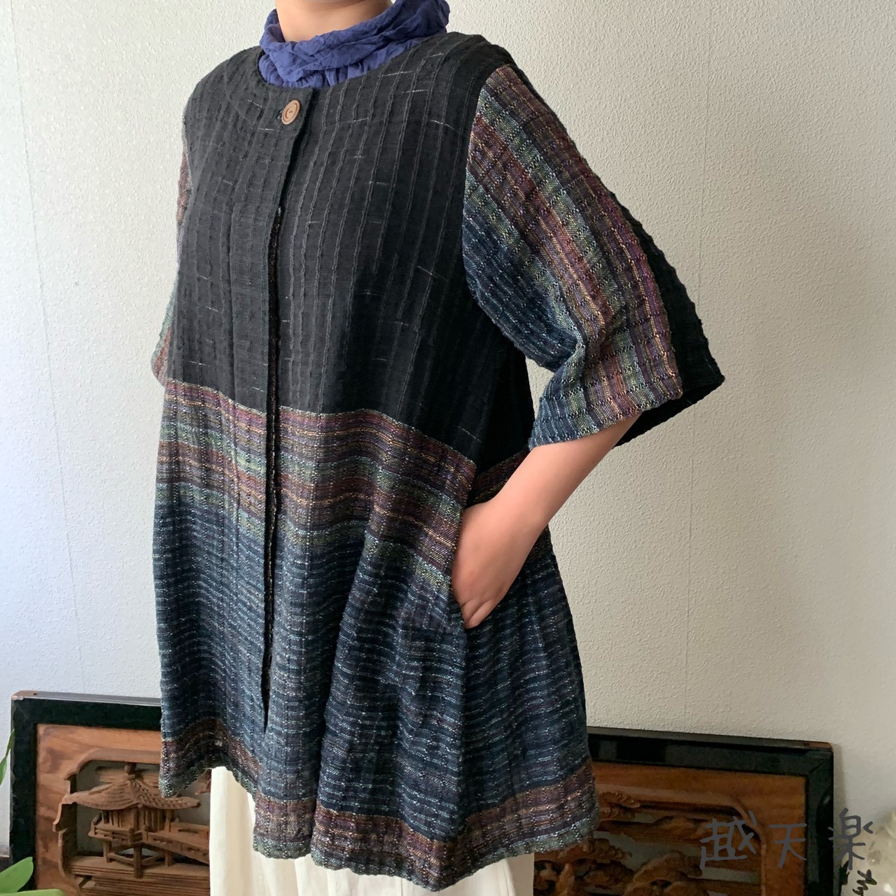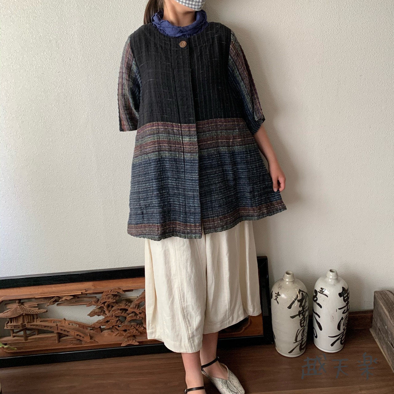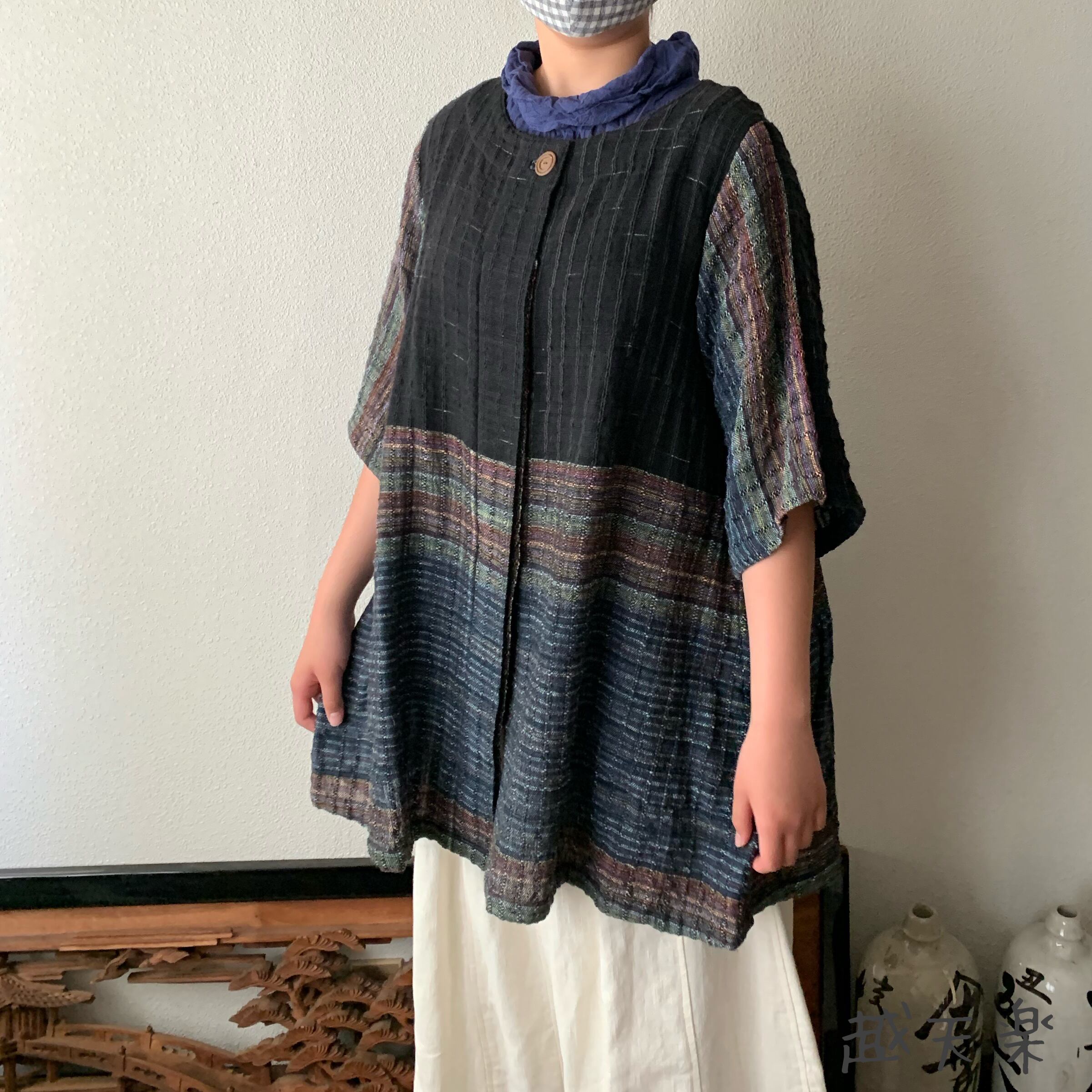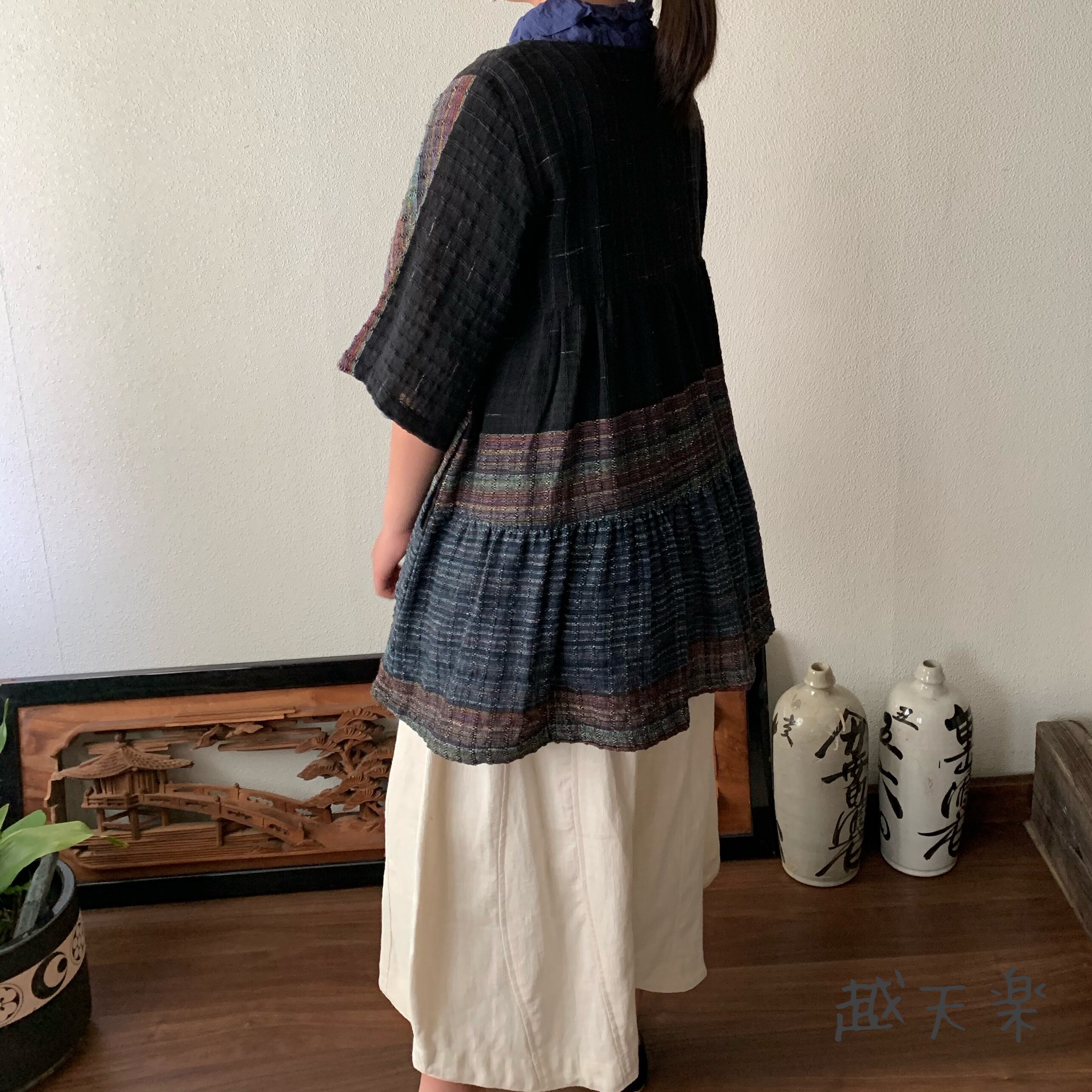『バックサイドティアードが楽しい前開き手織り綿チュニックブラウス 隠しボタンと丸襟ですっきり着こなし』