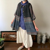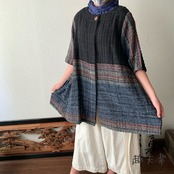 バックサイドティアードが楽しい前開き手織り綿チュニックブラウス 隠しボタンと丸襟ですっきり着こなし ブルーグレイ絣
