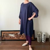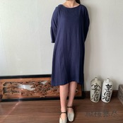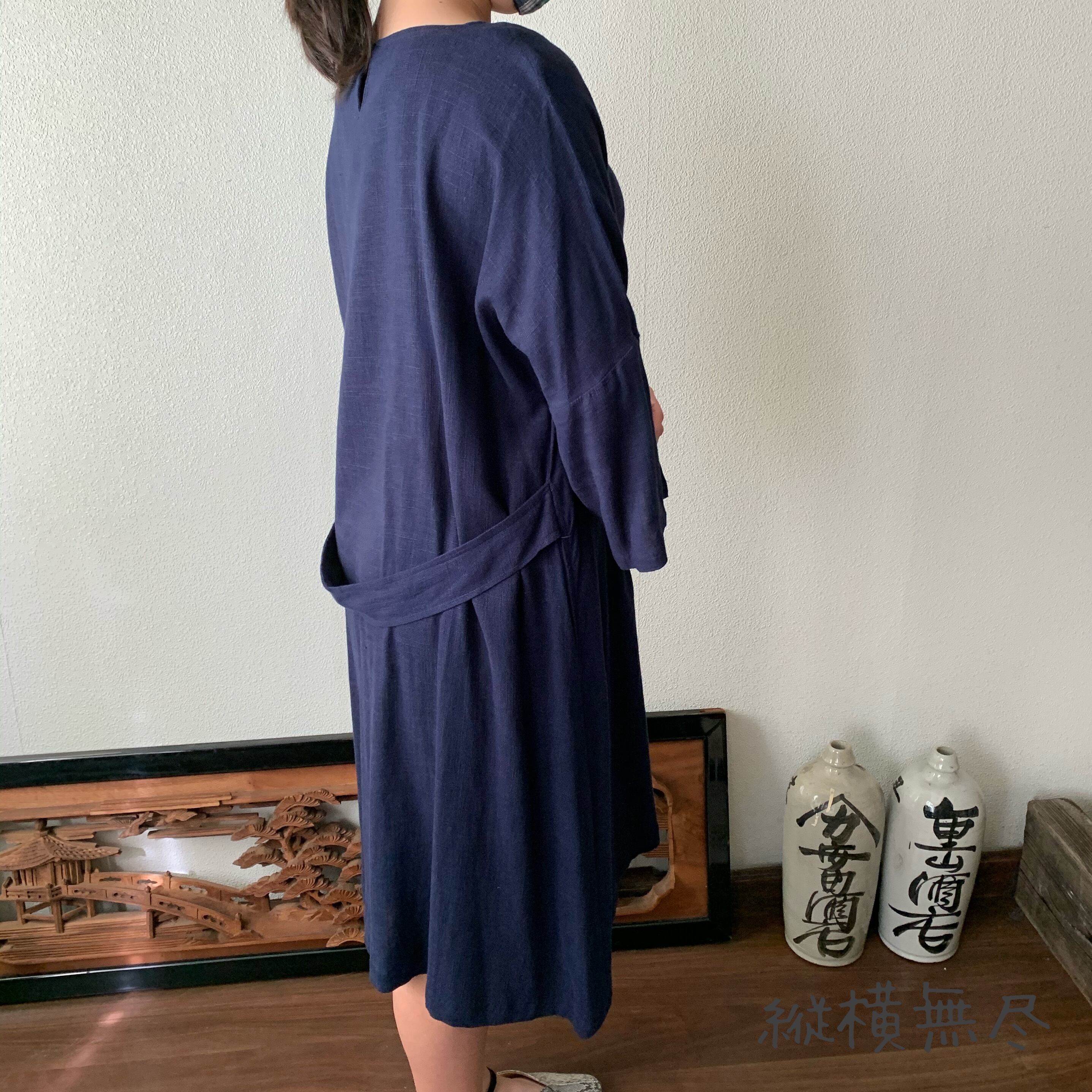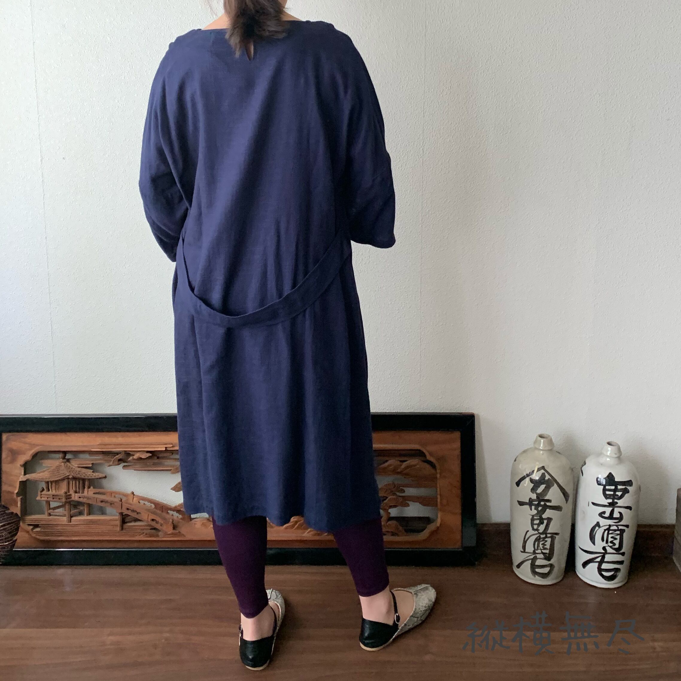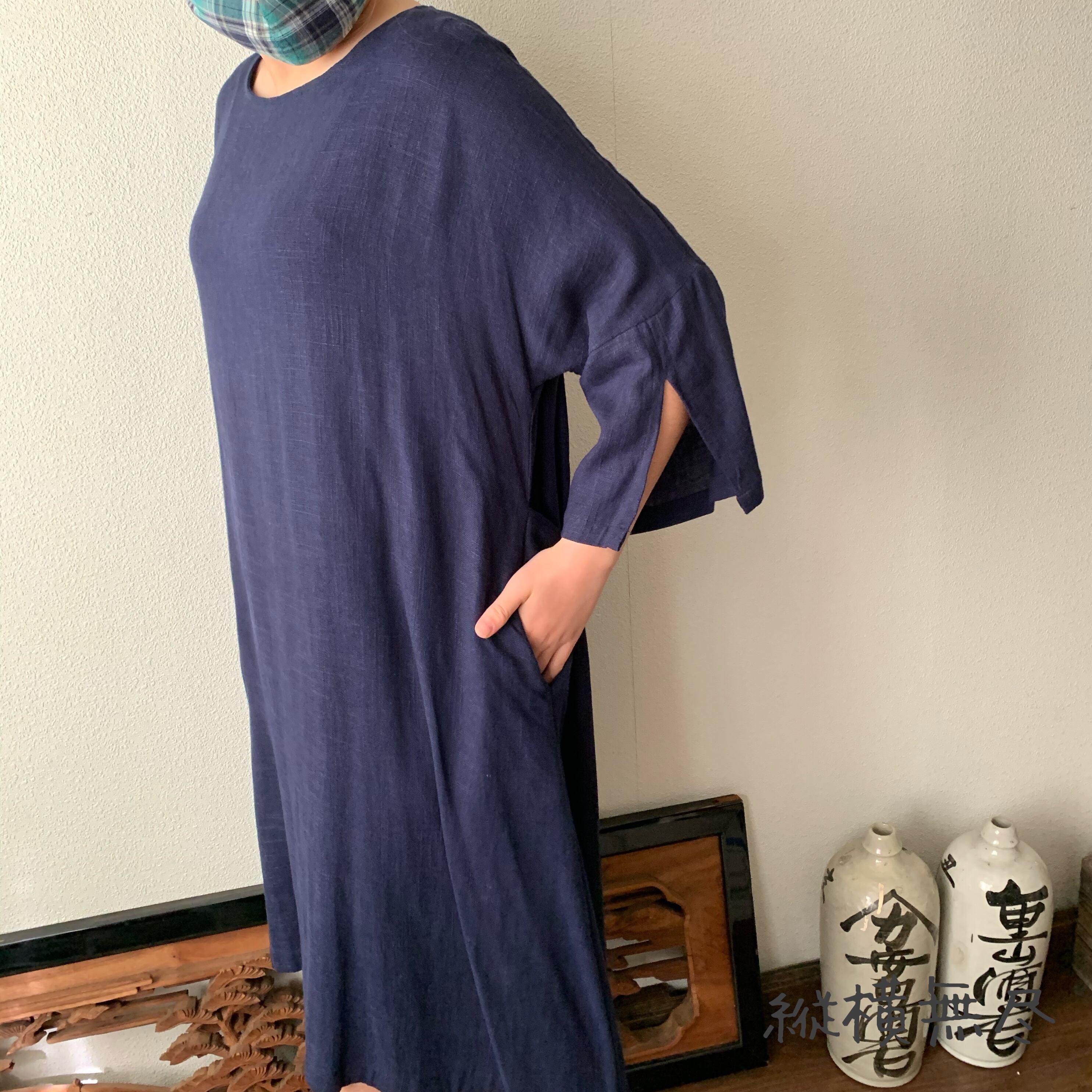 ゆったりAラインヘンプワンピース 楽ちんなサイズだけど袖スリットと後ろベルト付ですっきり 紺