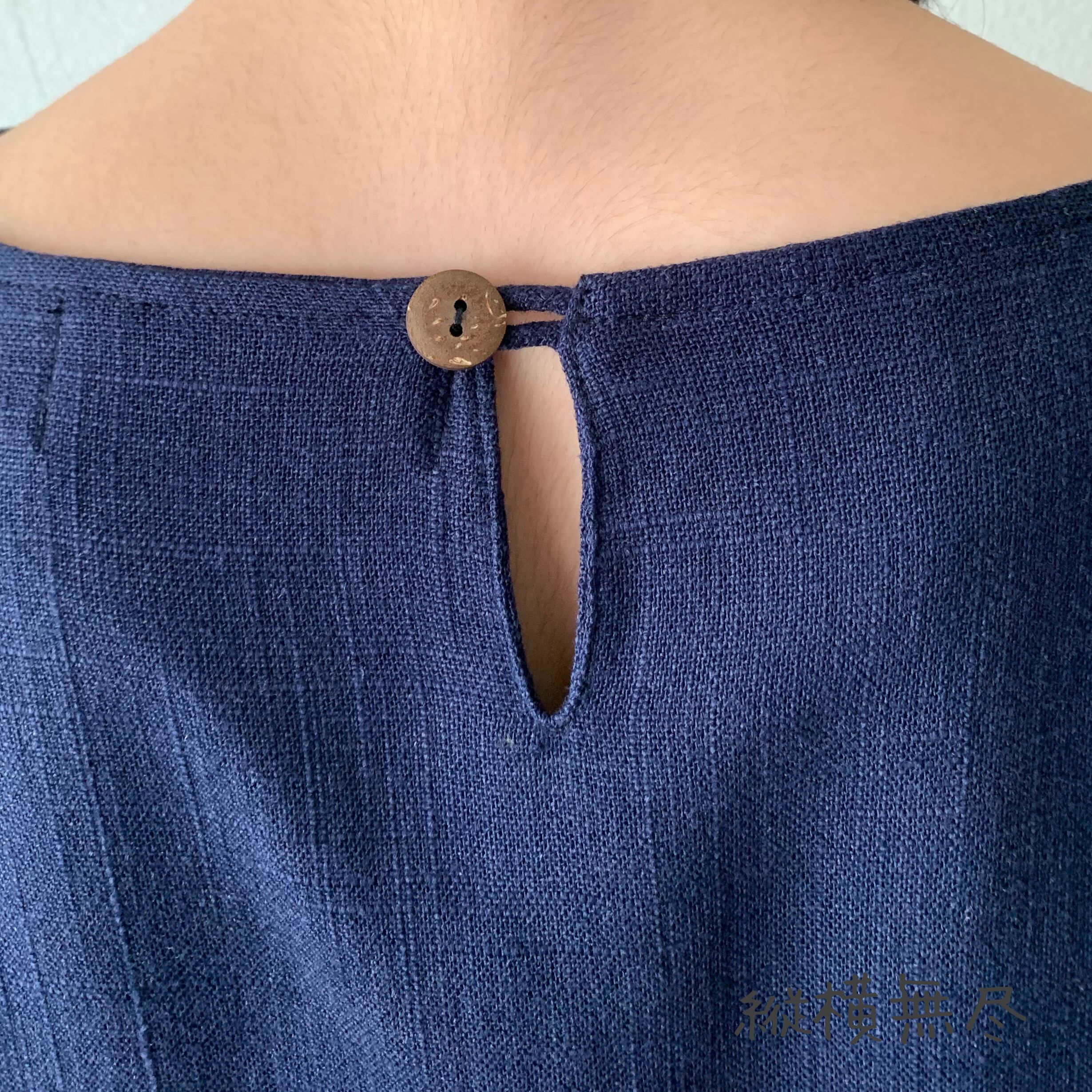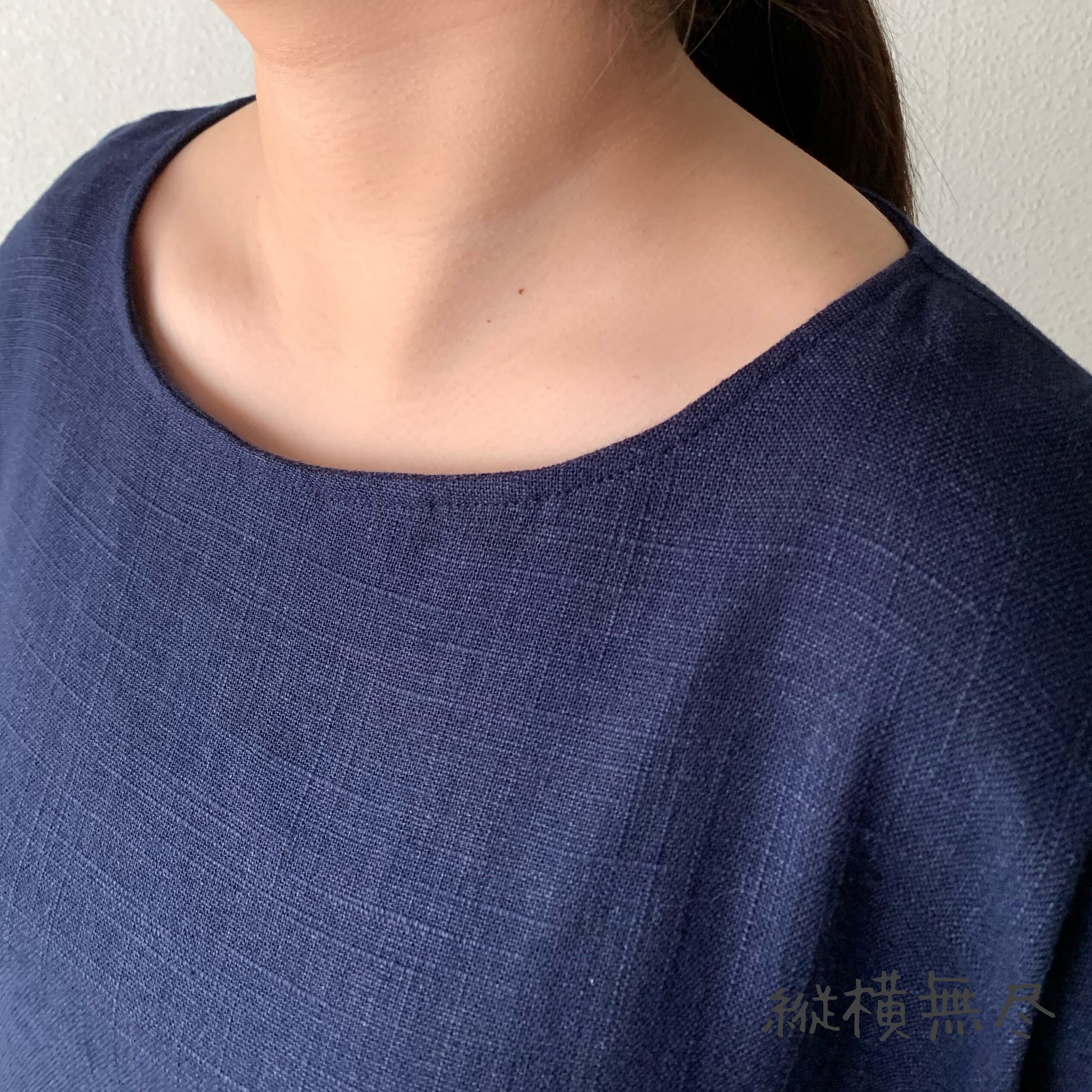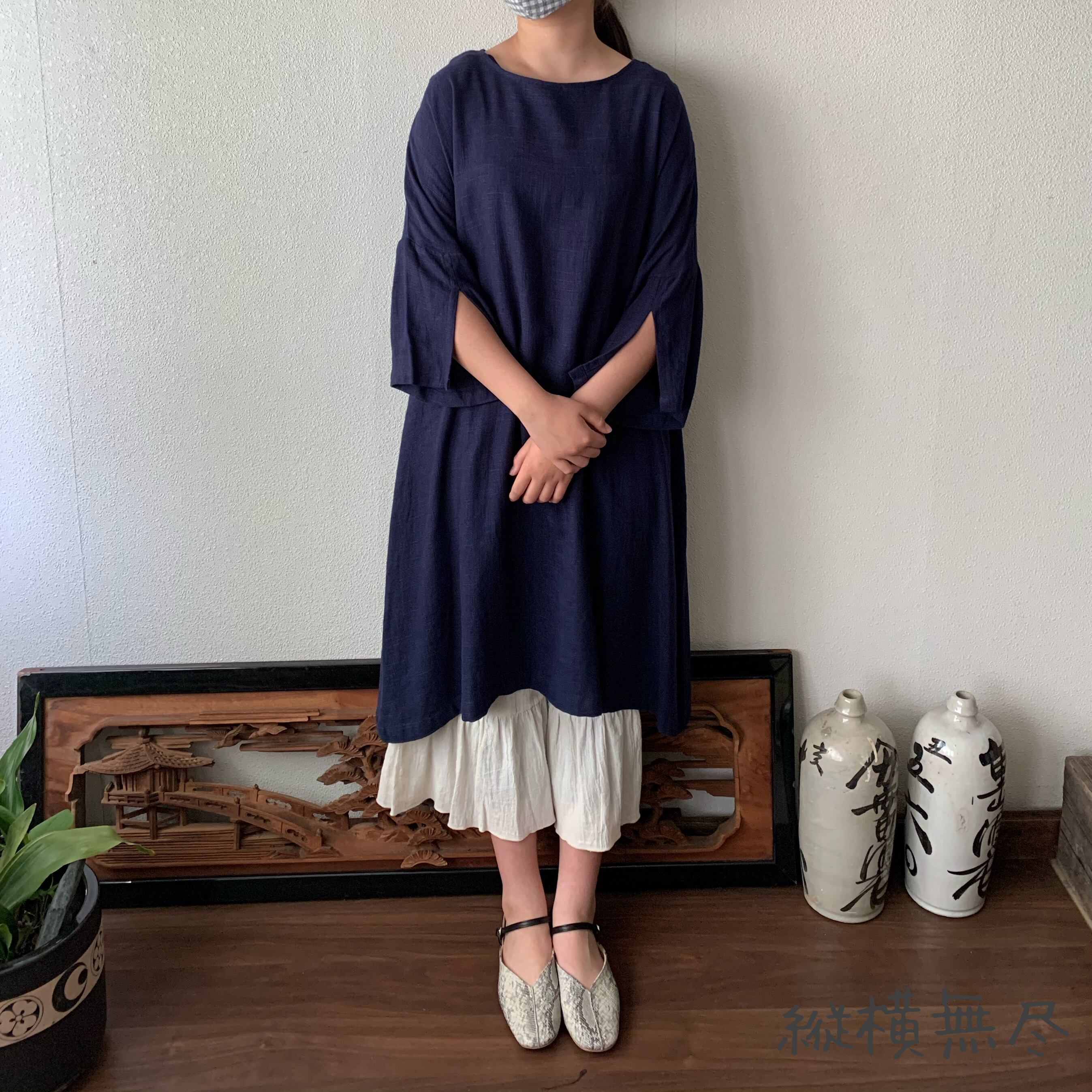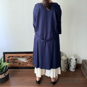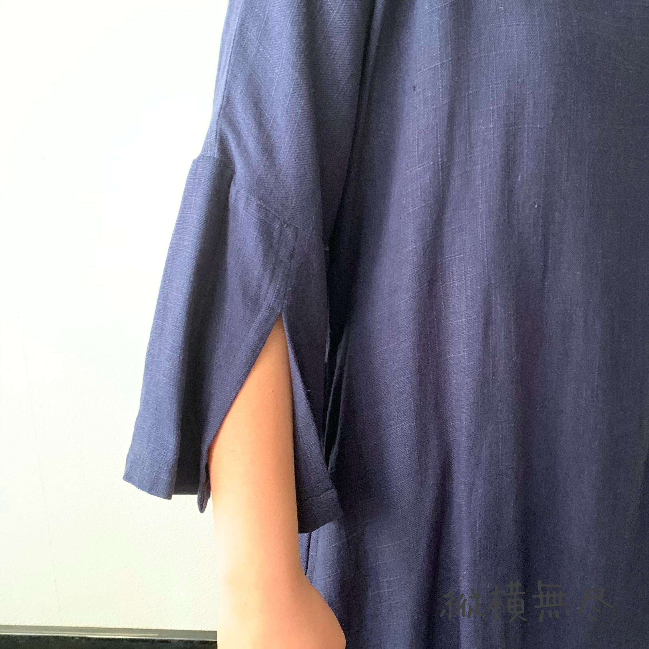 ゆったりAラインヘンプワンピース 楽ちんなサイズだけど袖スリットと後ろベルト付ですっきり 紺