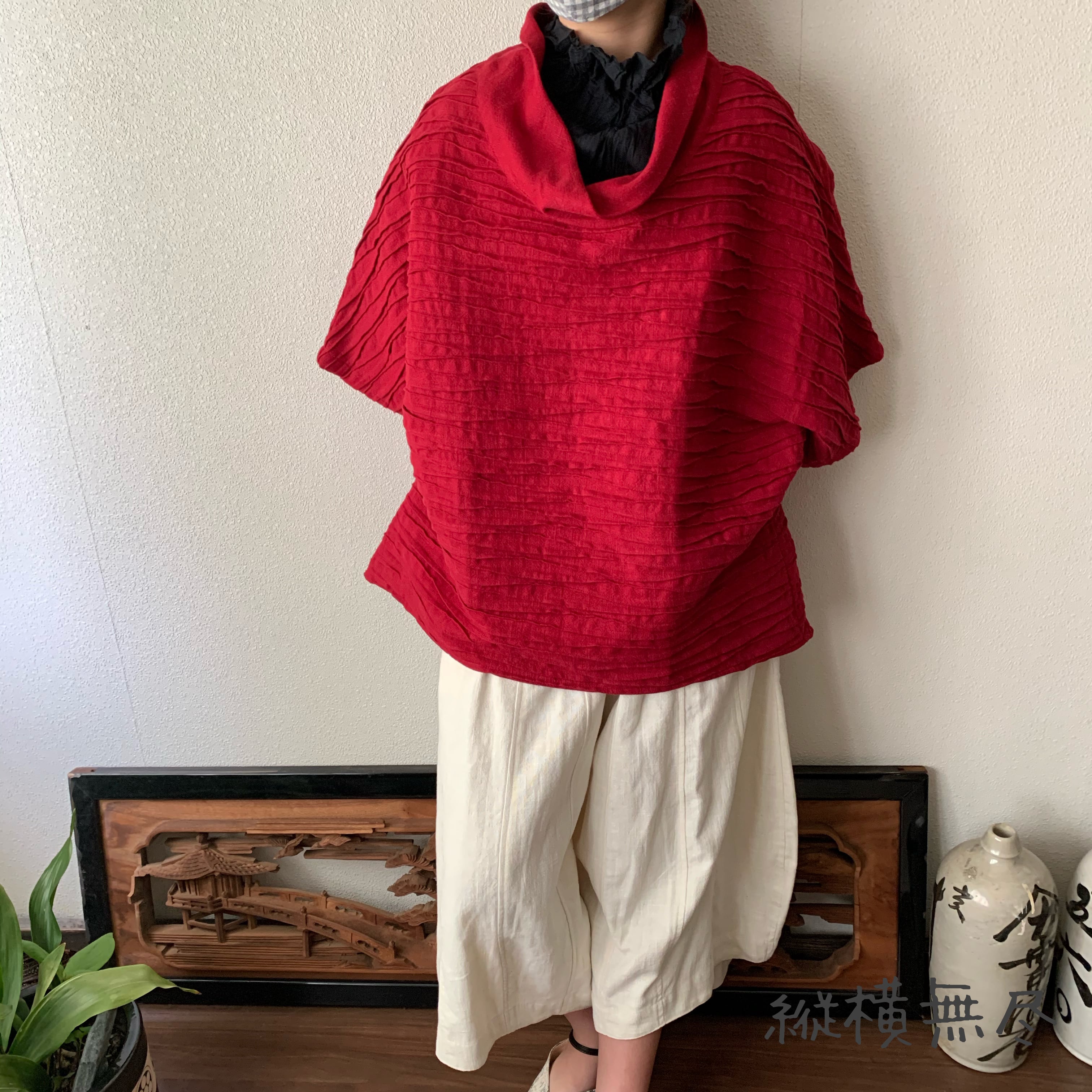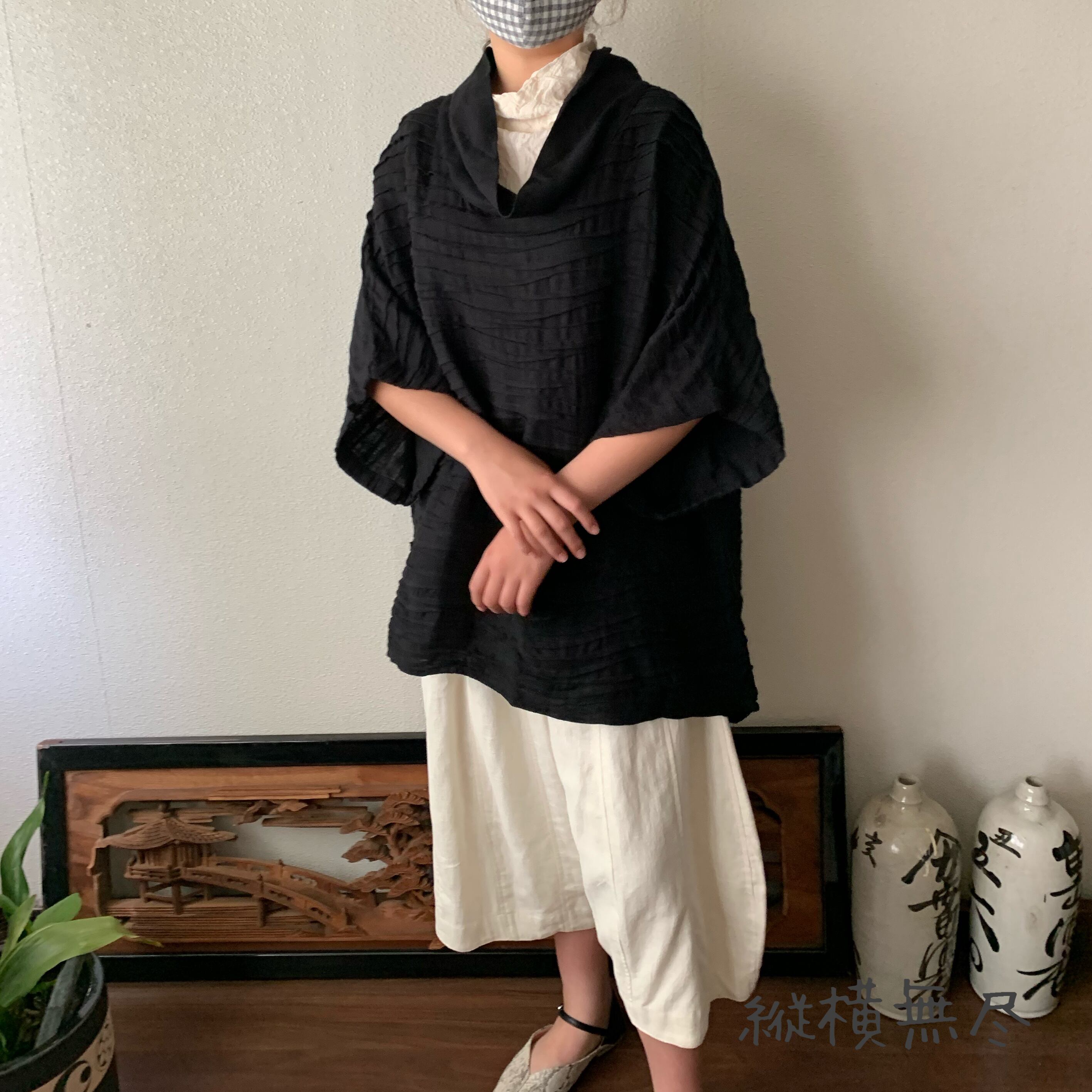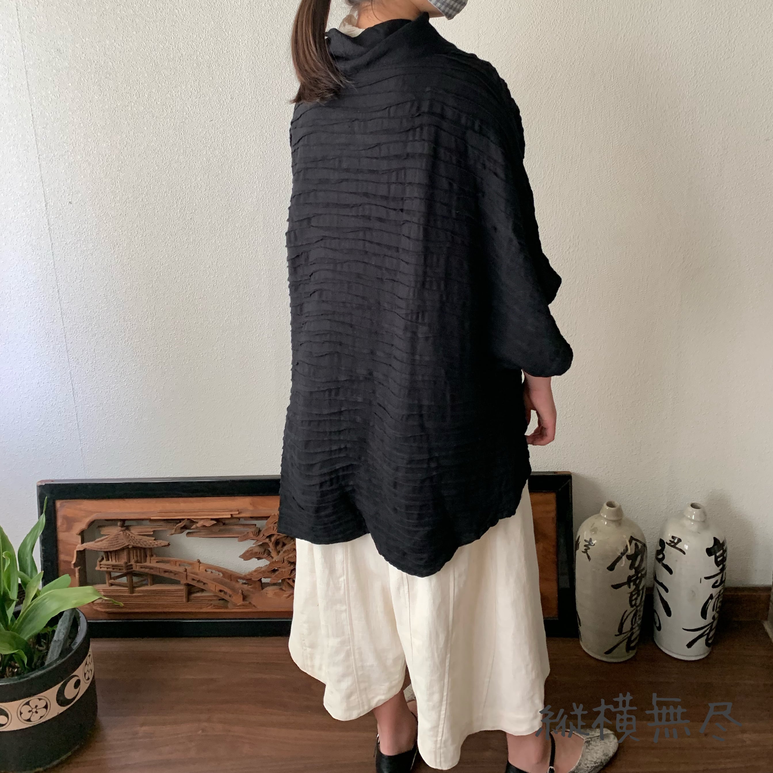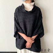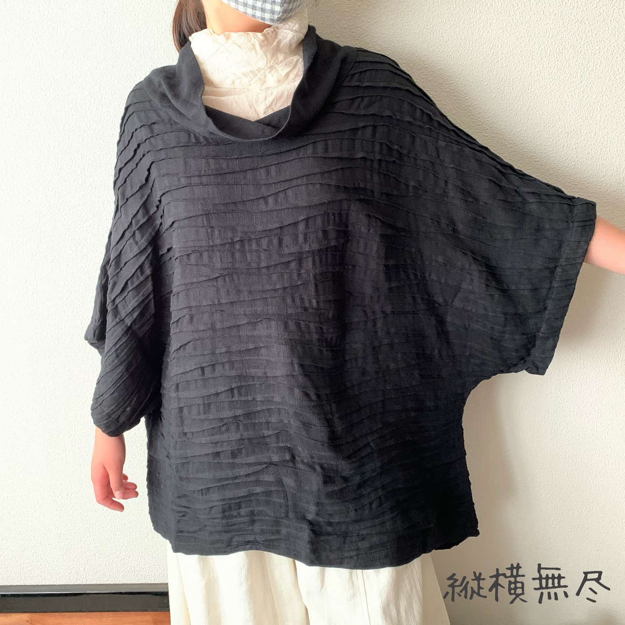 贅沢につかったうねりのあるピンタックとラグラン袖、長めの後ろ丈がポイントです。