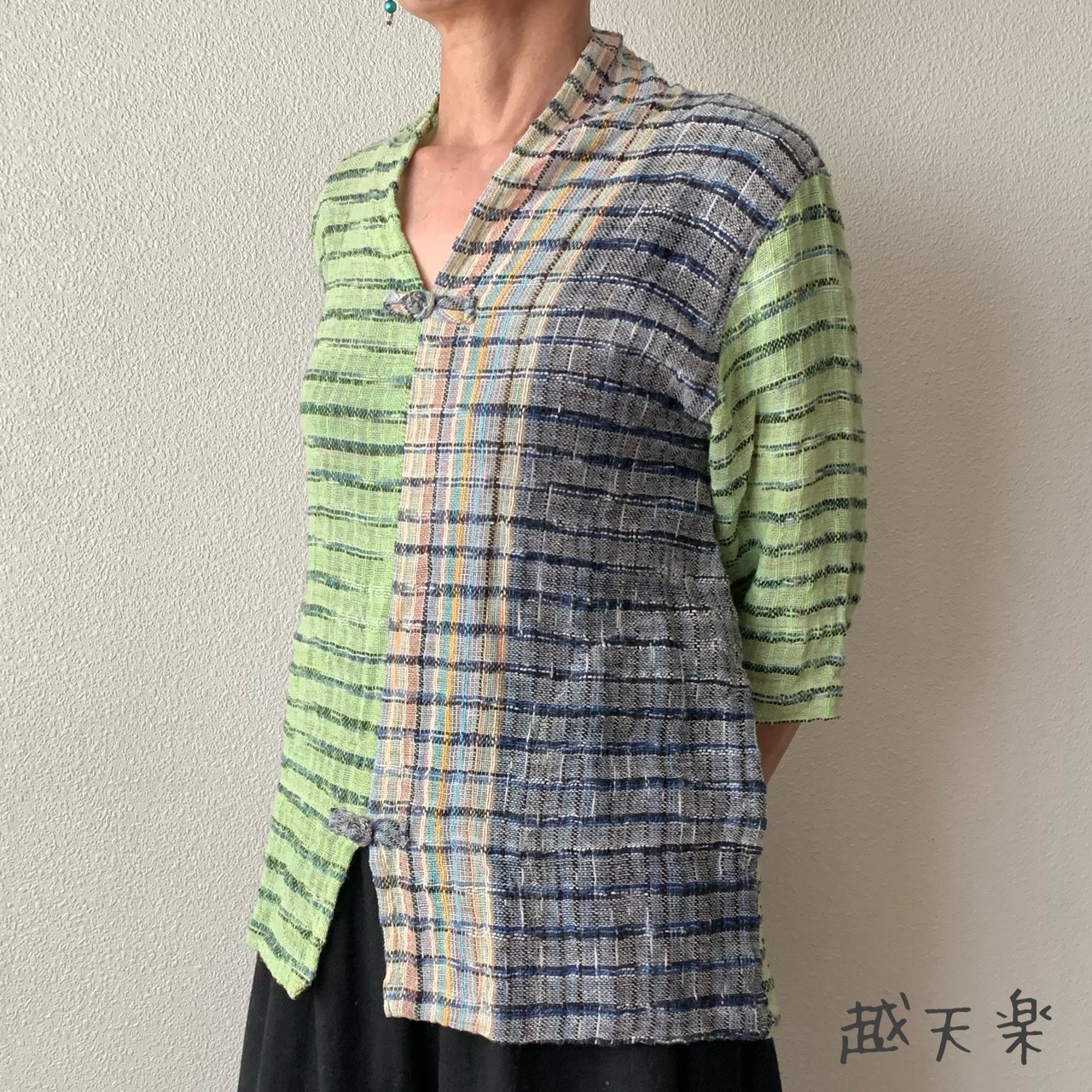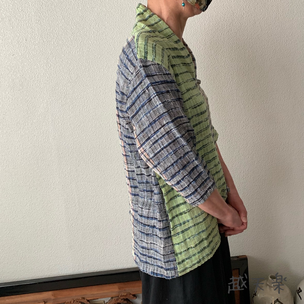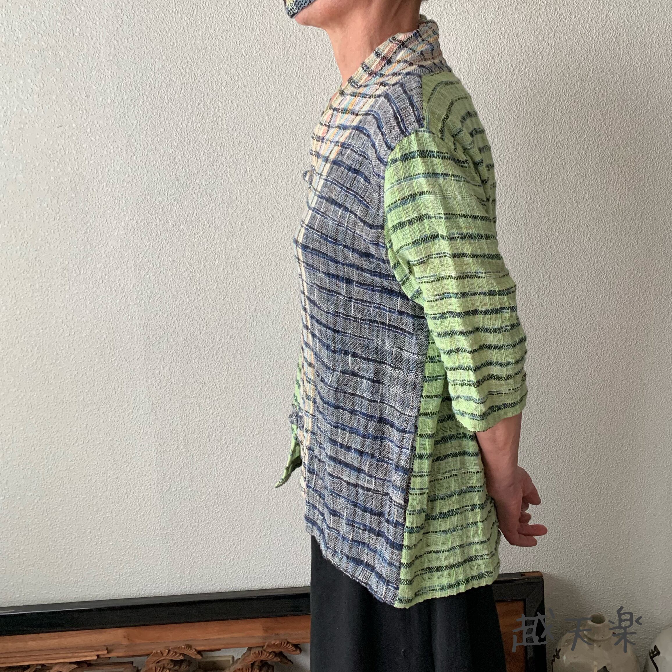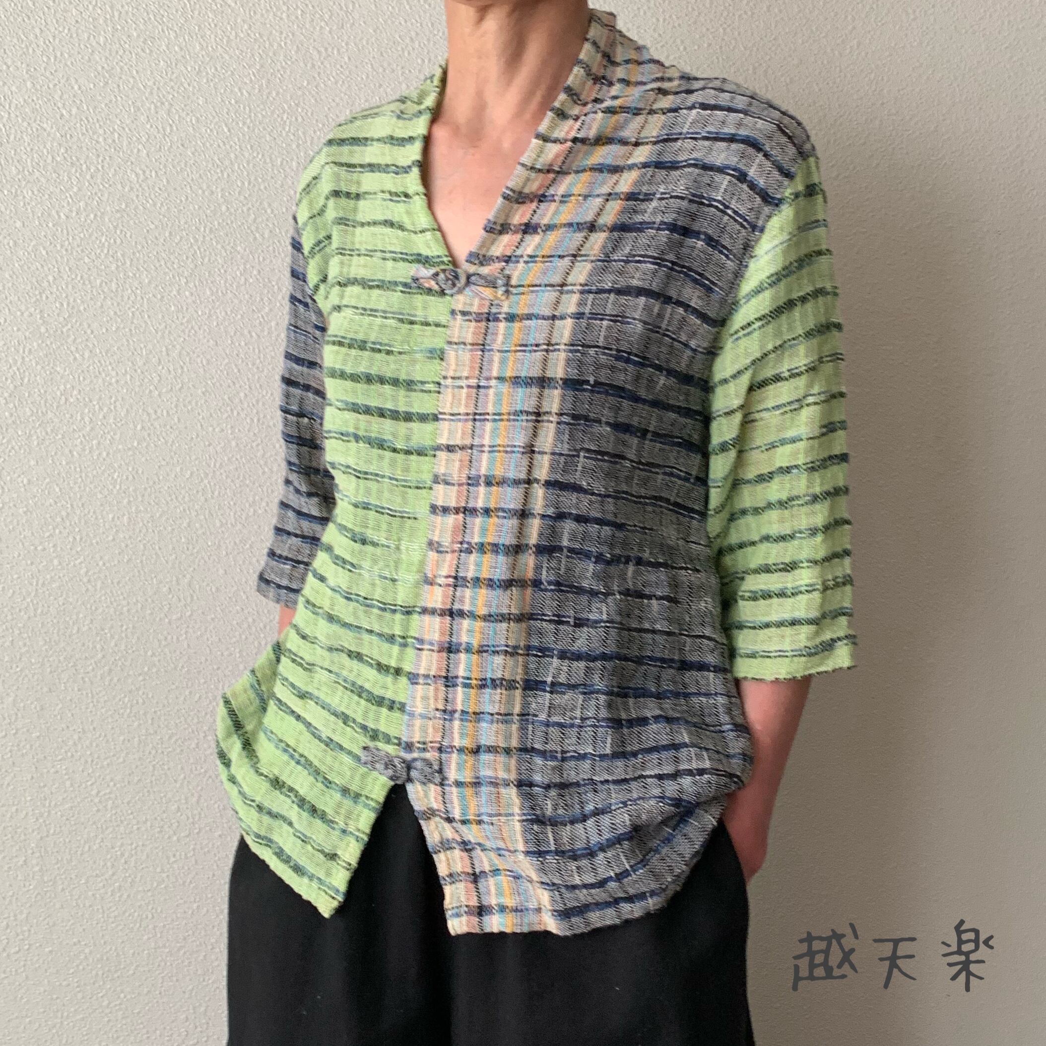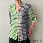 首元すっきりチャイナボタンがポイントのシンプルブラウス 1枚でもインナー着ても楽しめる キミドリ絣