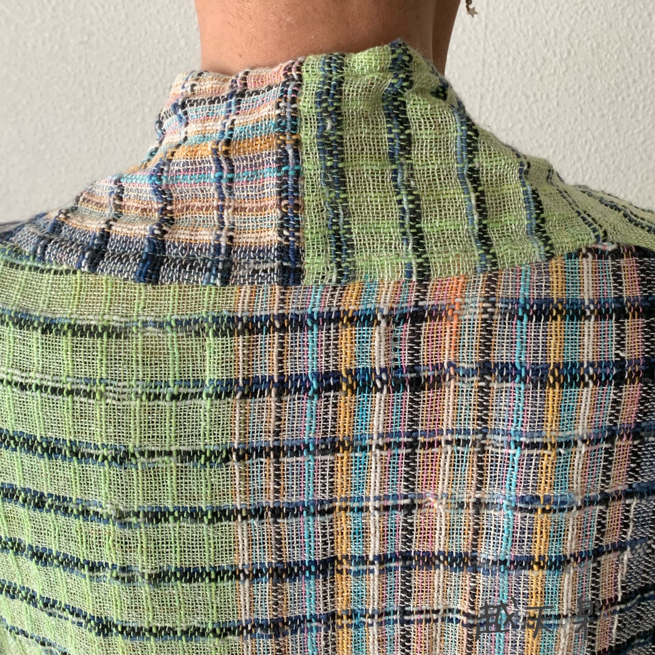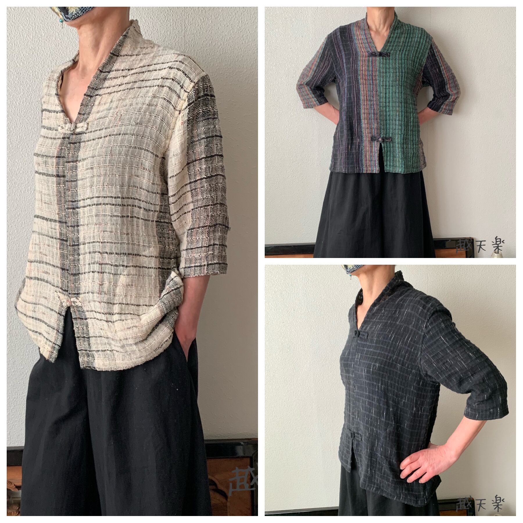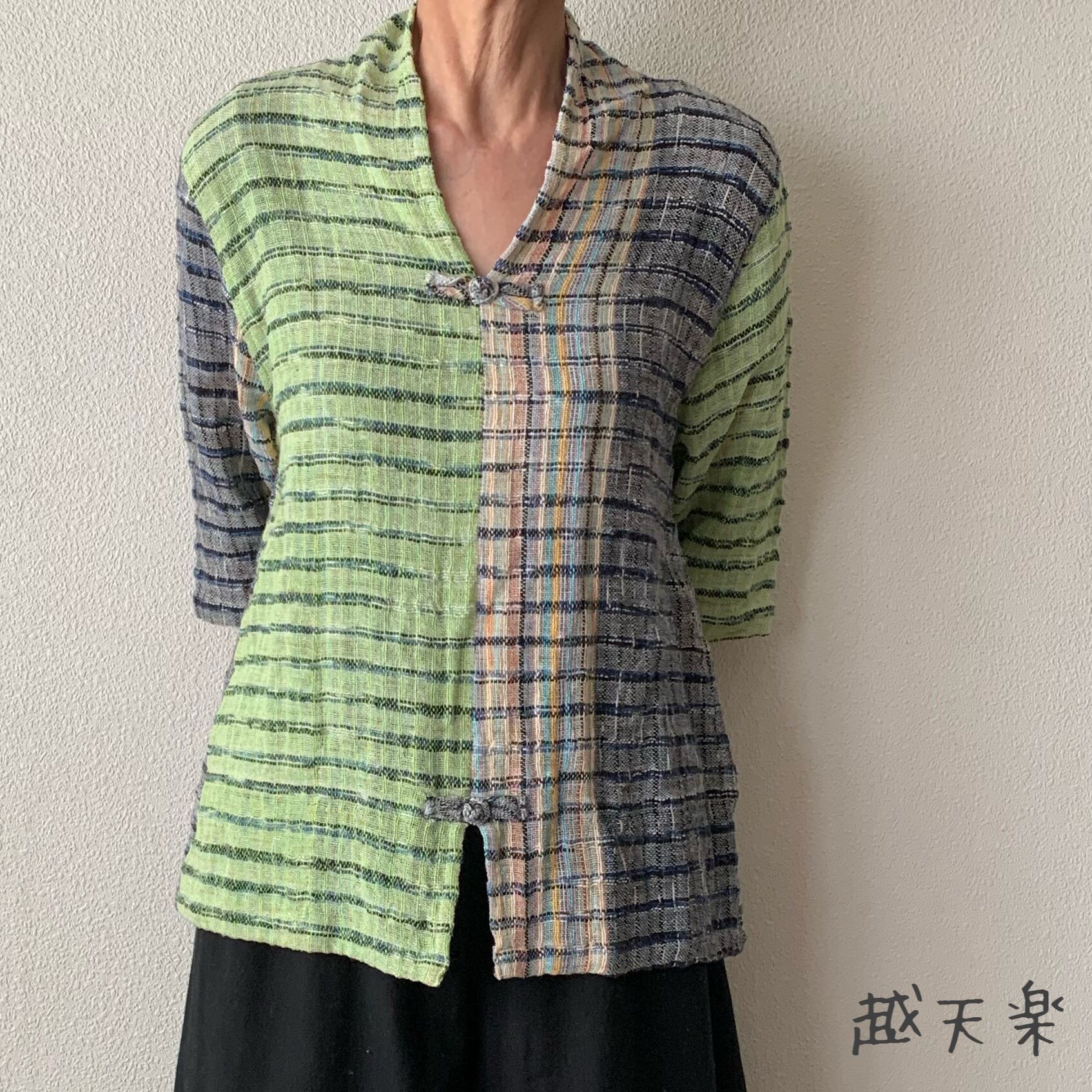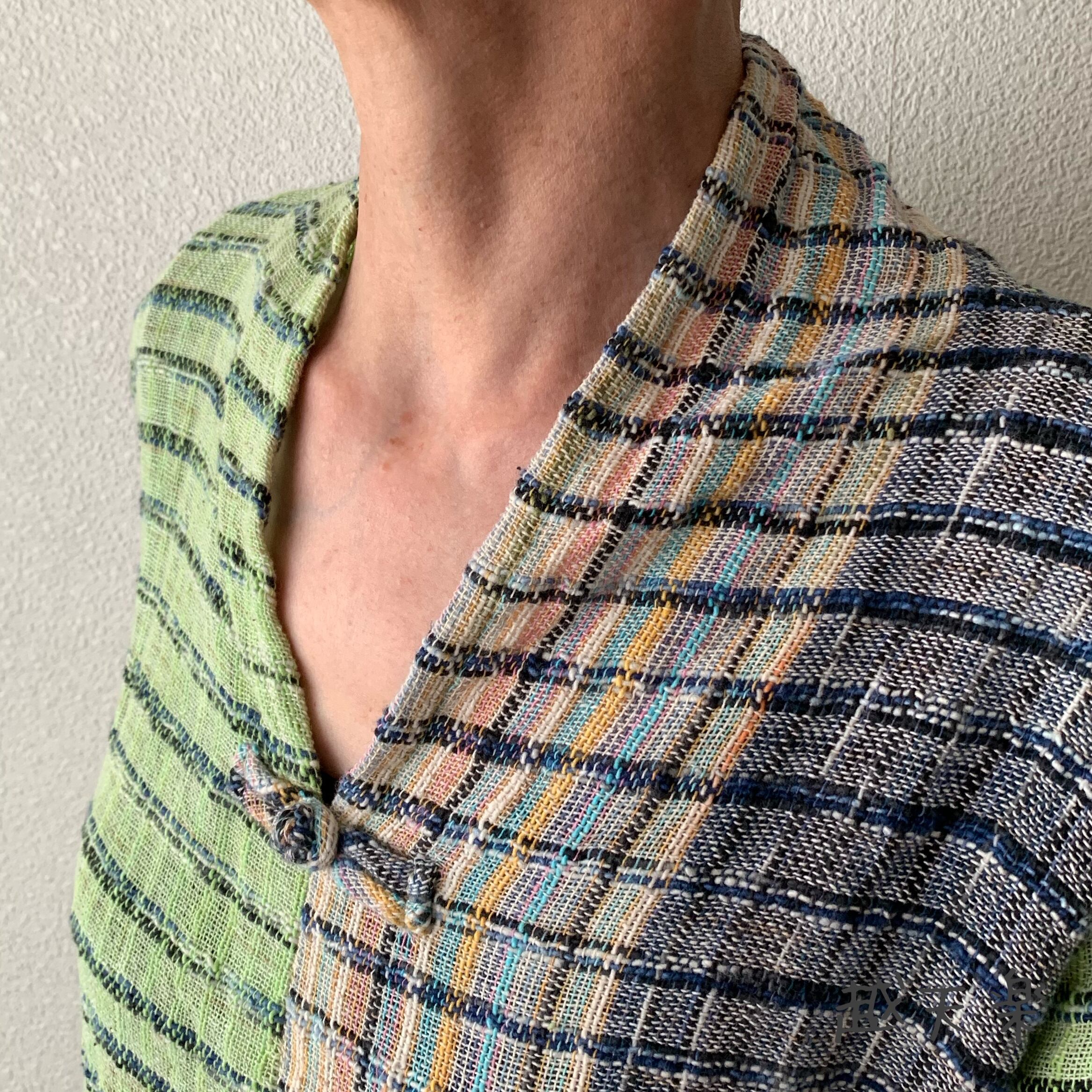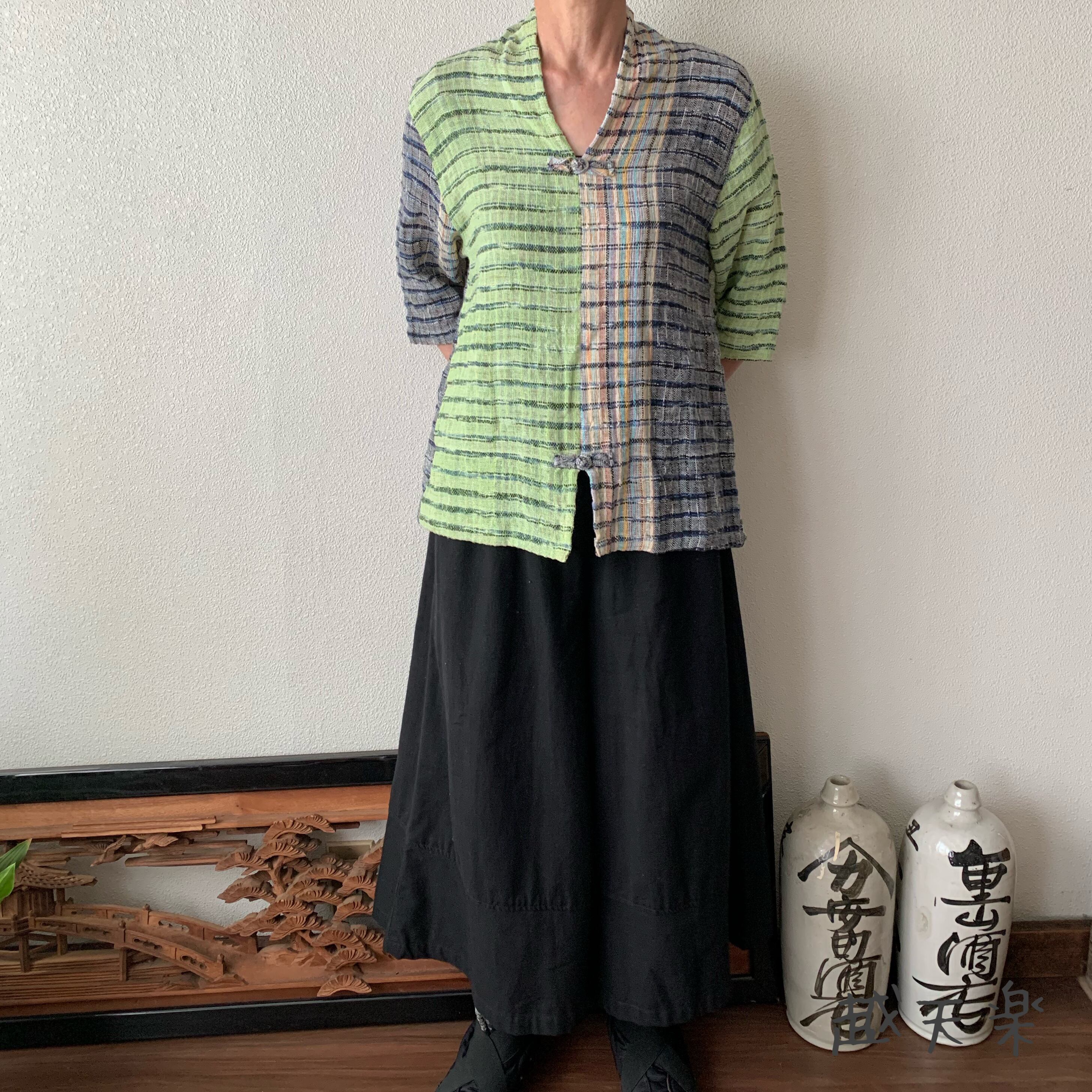 首元すっきりチャイナボタンがポイントのシンプルブラウス 1枚でもインナー着ても楽しめる キミドリ絣